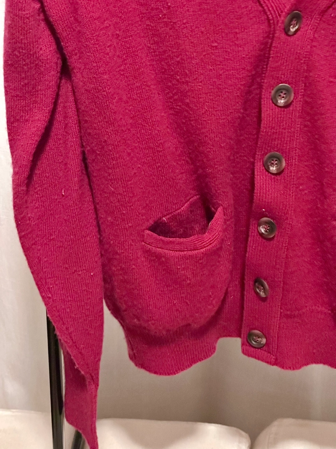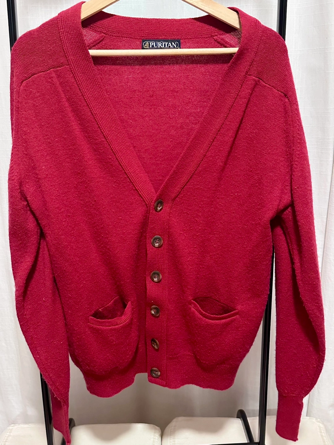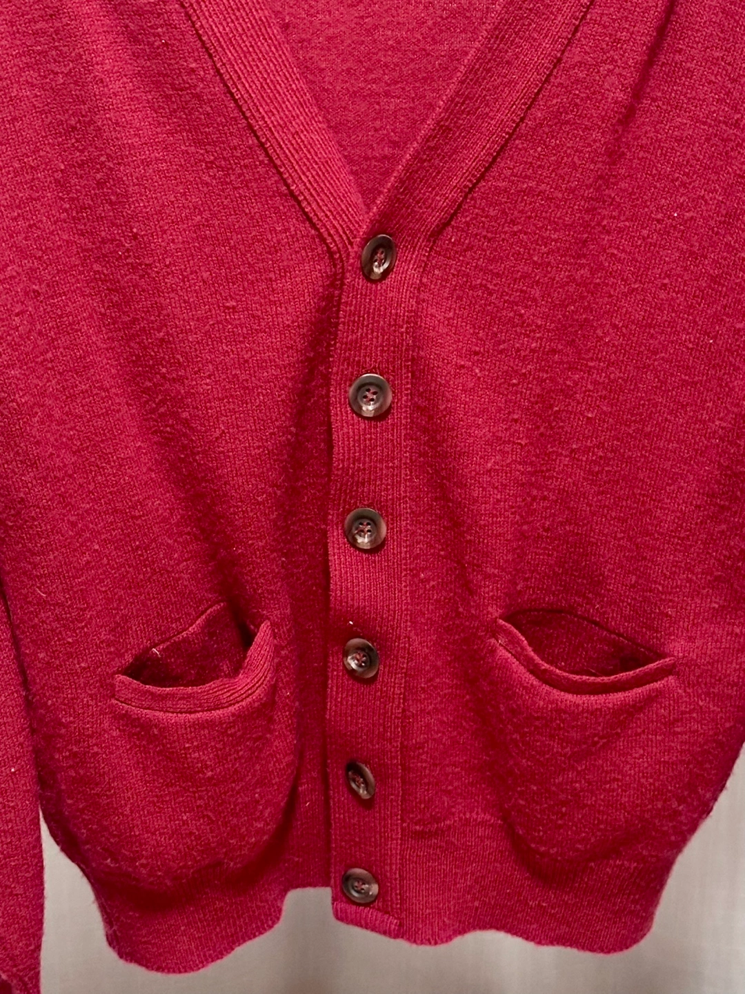 Burgundy coloured men's cardigan. Features a V-neck, long sleeves, and two patch pockets. Button closure. Made in the U.S.A. 50% Lambswool, 50% Orlon Acrylic.