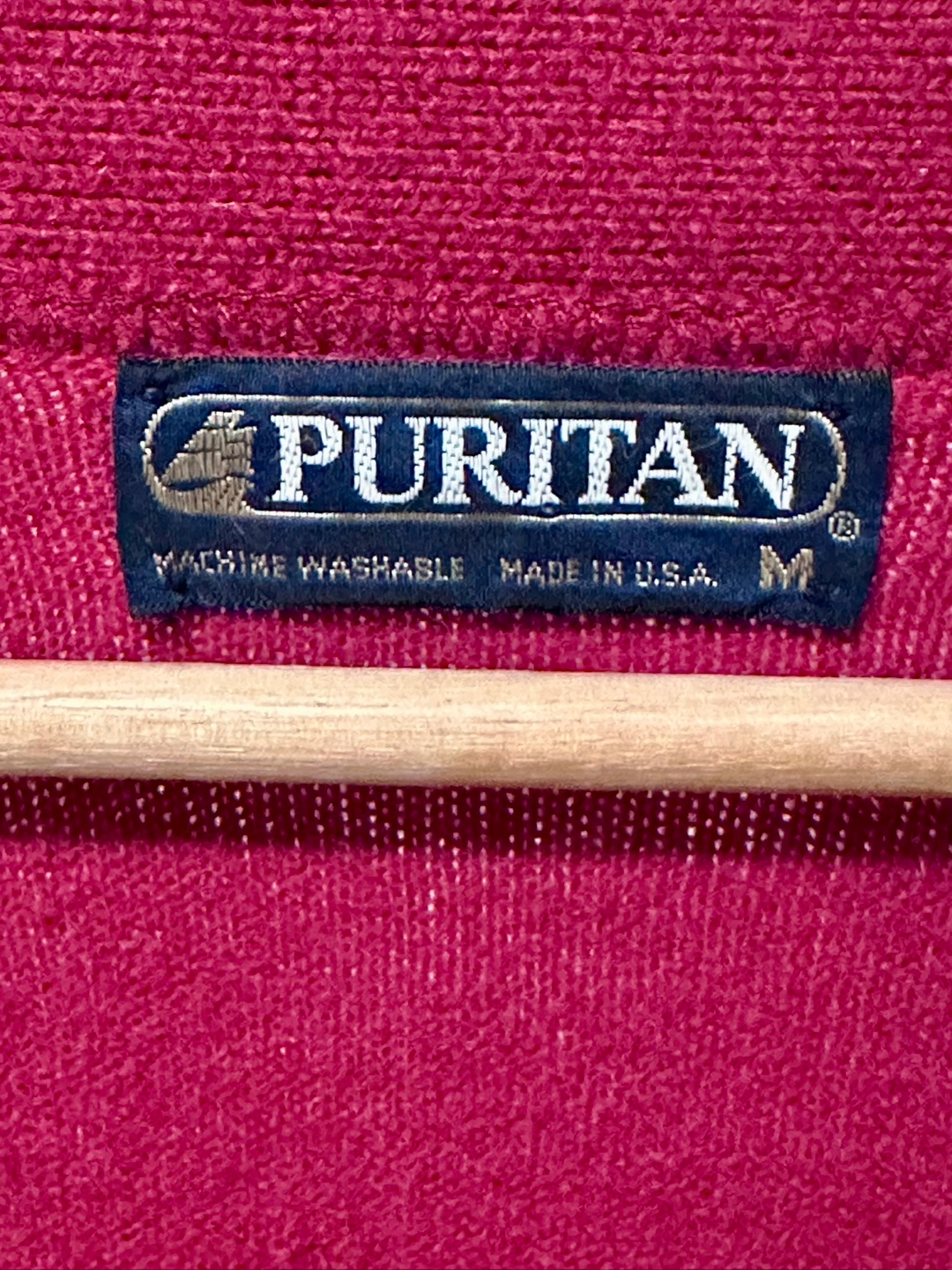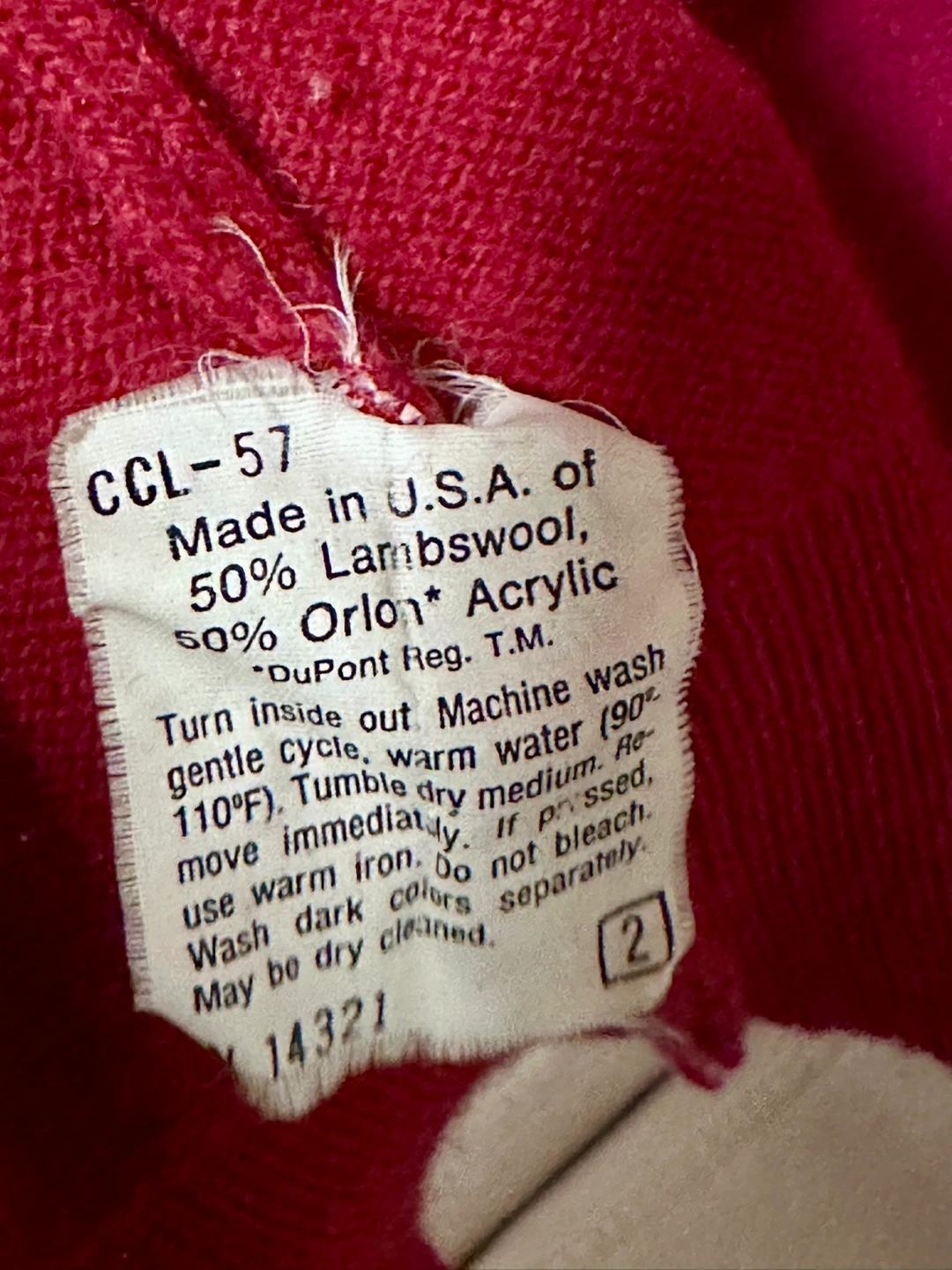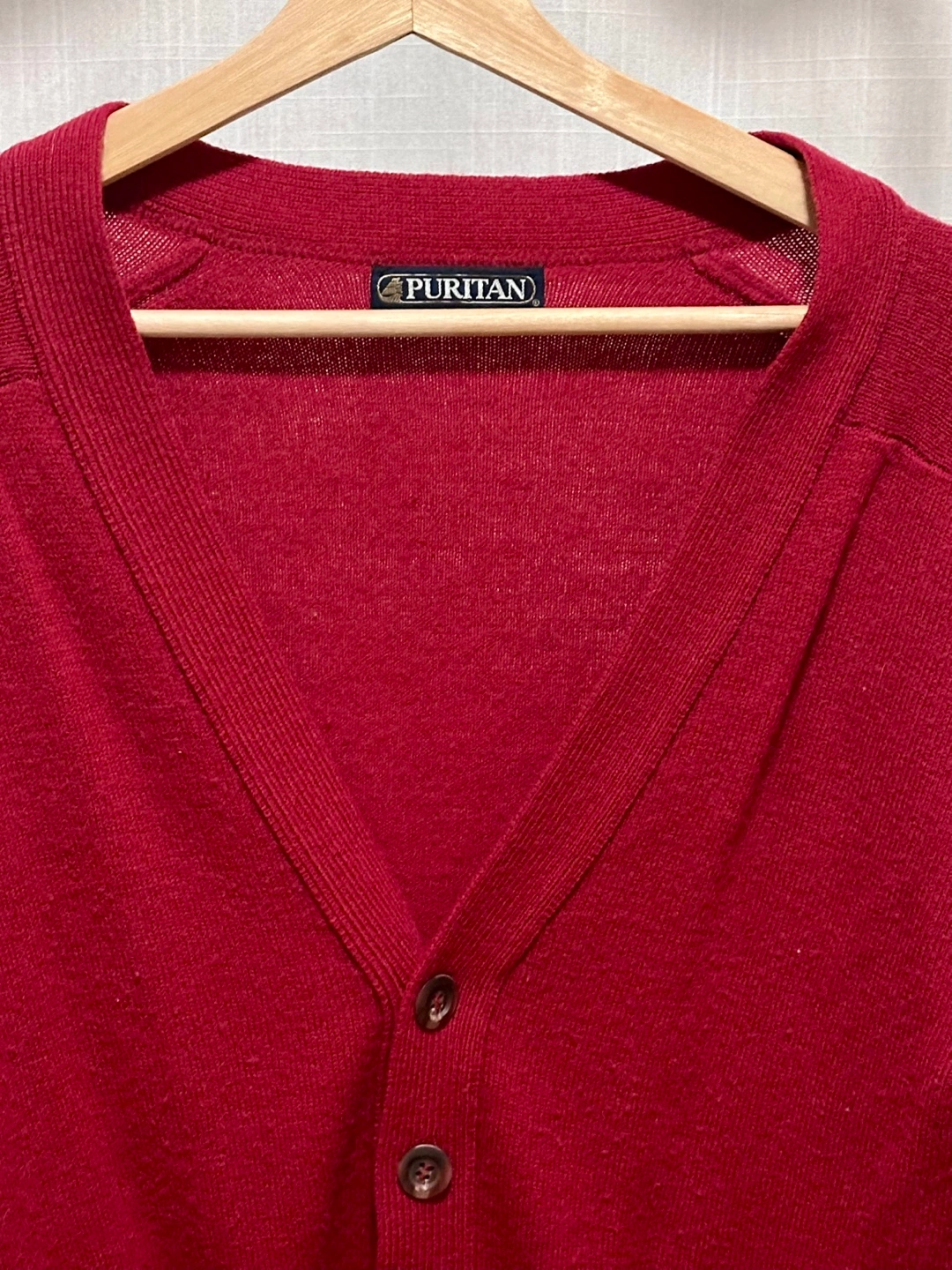 Burgundy coloured men's cardigan. Features a V-neck, long sleeves, and two patch pockets. Button closure. Made in the U.S.A. 50% Lambswool, 50% Orlon Acrylic.