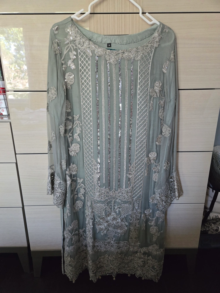 Stunning light-blue embroidered dress. Features long sleeves, intricate detailing, and comes with a teal dupatta. Size M. some thread work coming out in under arms chest 29" waist 16" hips 18"