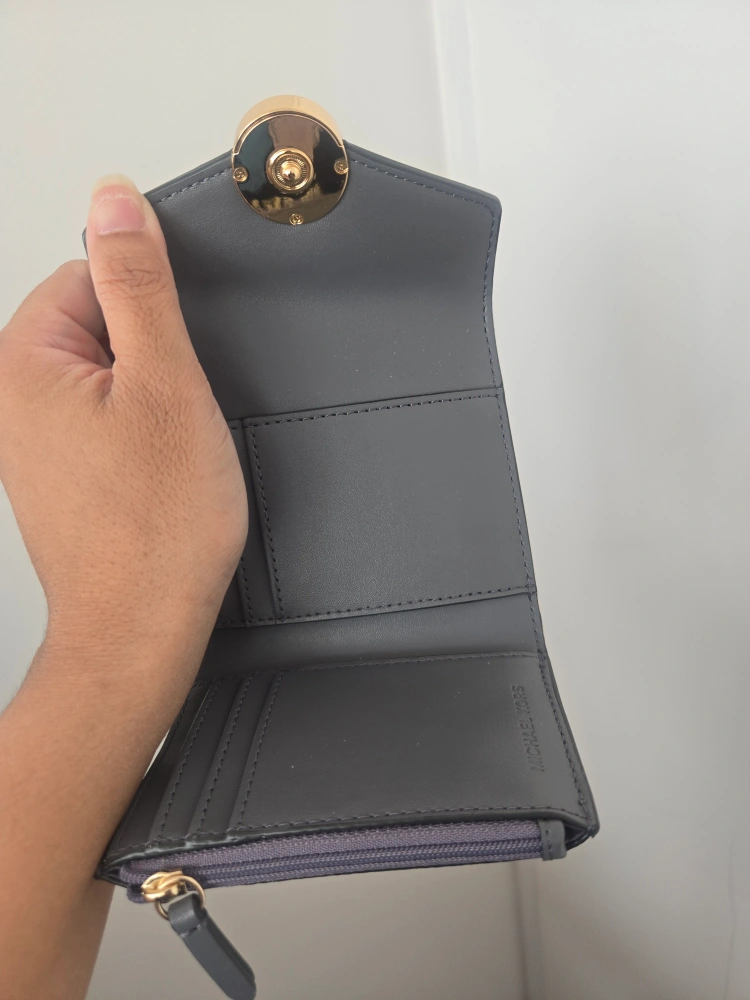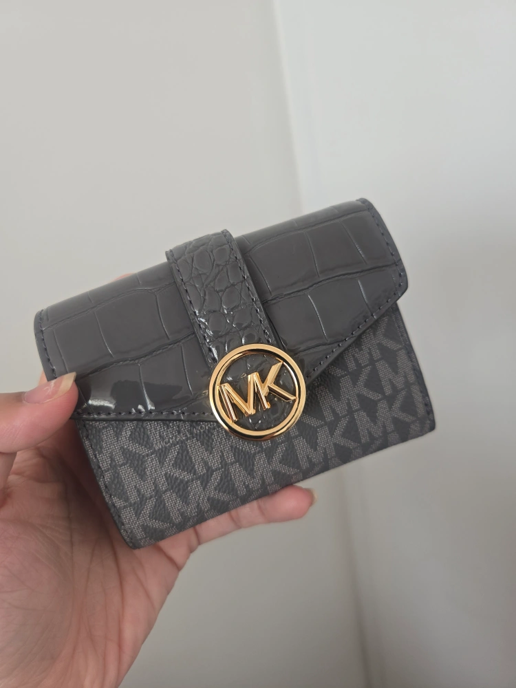 Adorable Michael Kors wallet. Compact design, ideal for everyday use. Features a croc-embossed exterior and signature MK logo. Multiple card slots and a zippered coin pouch. Grey colour.
