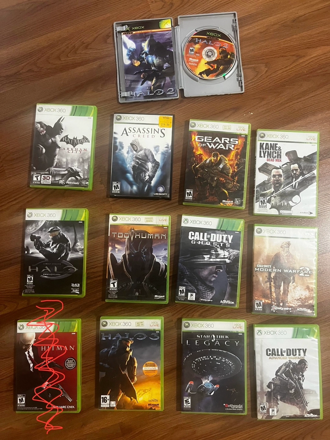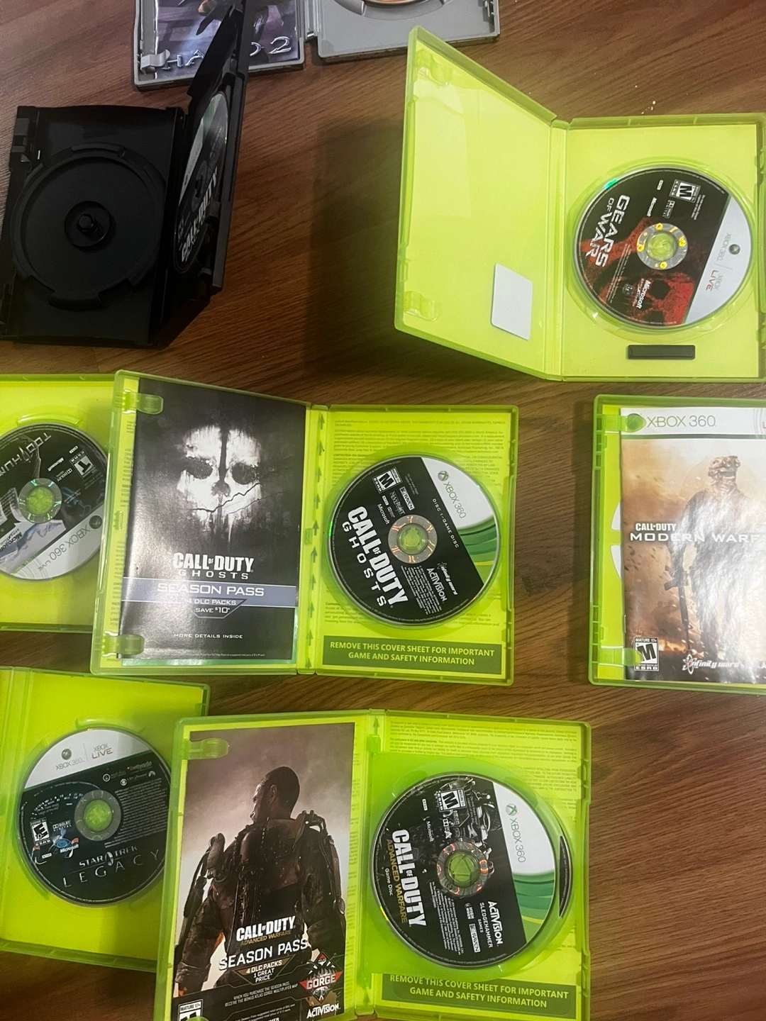 Large lot of pre-owned Xbox 360 games. Includes titles like Call of Duty, Gears of War, Halo, Assassin's Creed, and more. Take ALL for $95 $10 per game Pick up only from Yorkdale Mall or STC Tags: clear out sale, thrifty, move out sale, video games, XBOX, gamer.