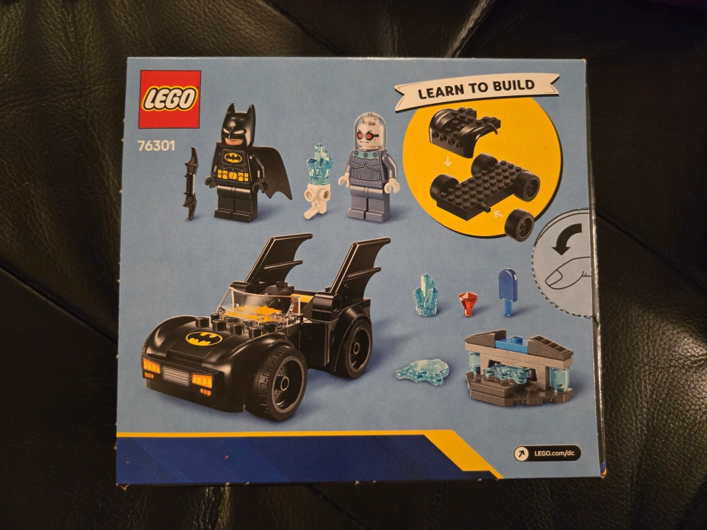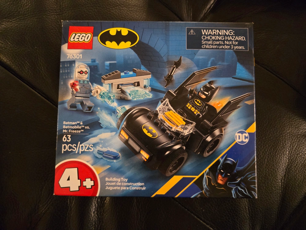 New LEGO Batman set. Includes Batman and Mr. Freeze minifigures. 63 pieces. Ages 4+. Batmobile included.
