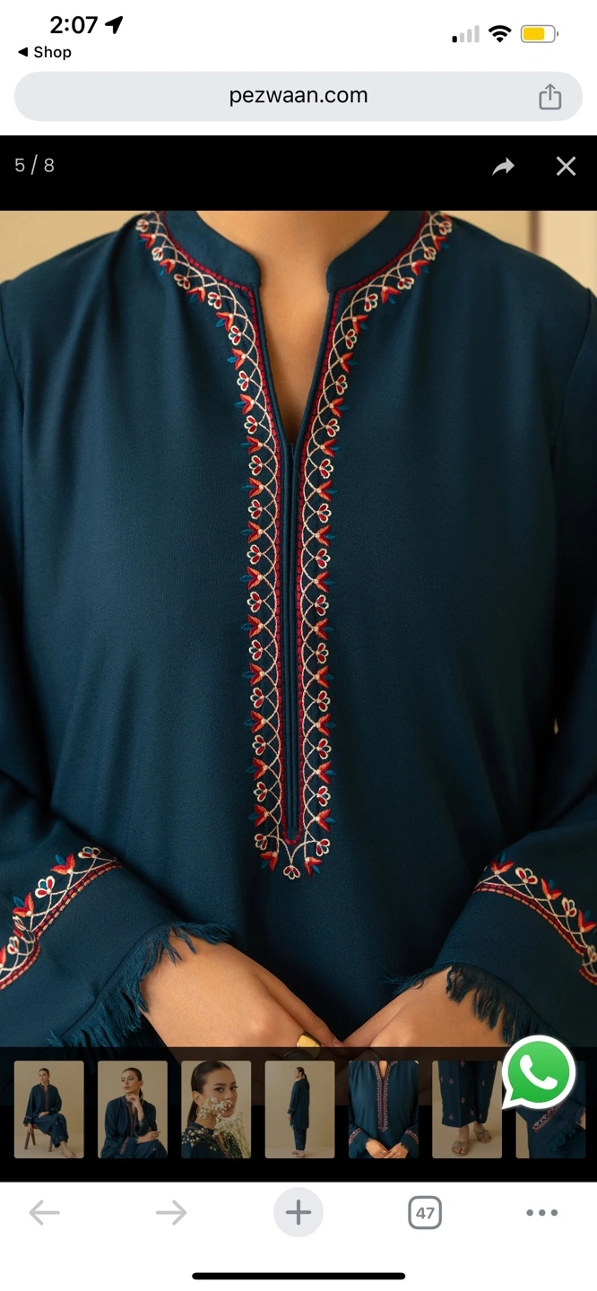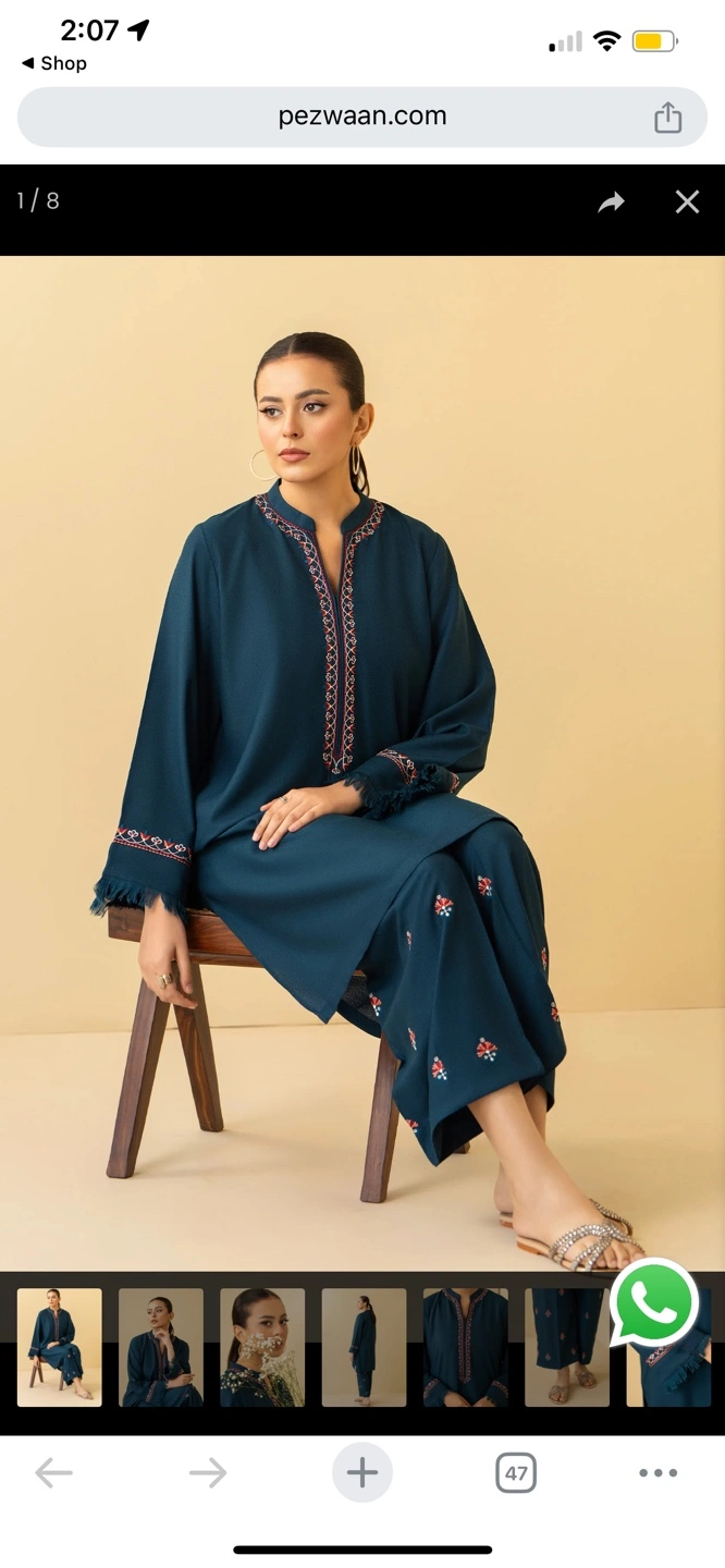 Beautiful teal two-piece suit. Features intricate embroidery and frayed detailing. Loose-fitting top and palazzo pants. Perfect for special occasions.