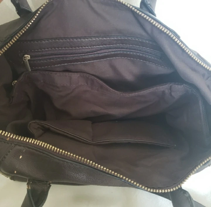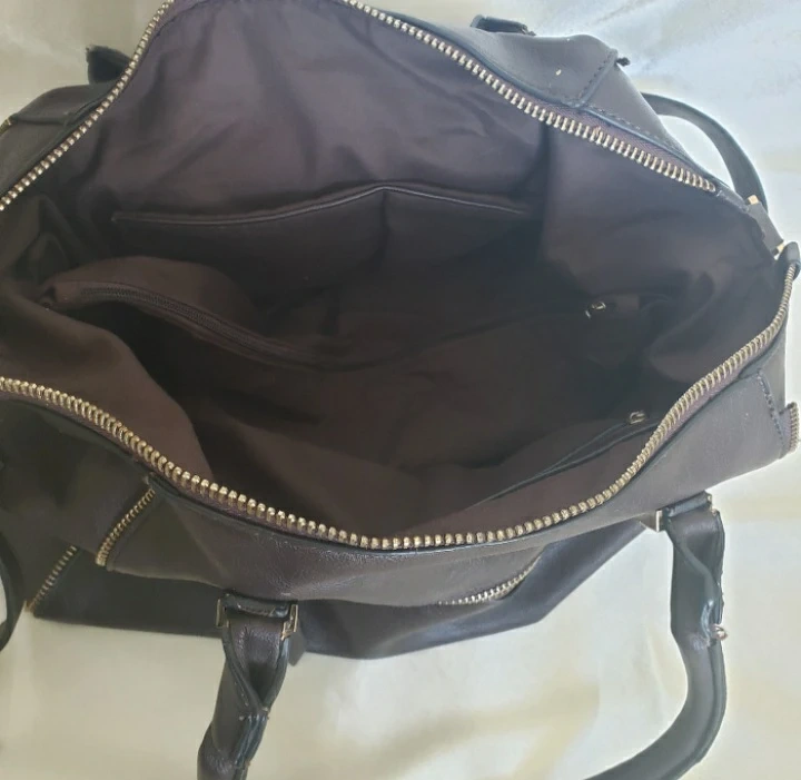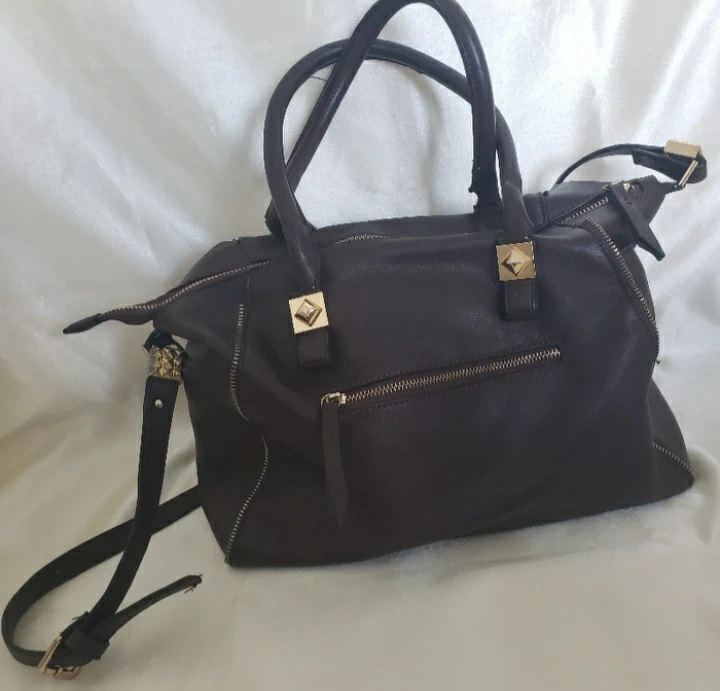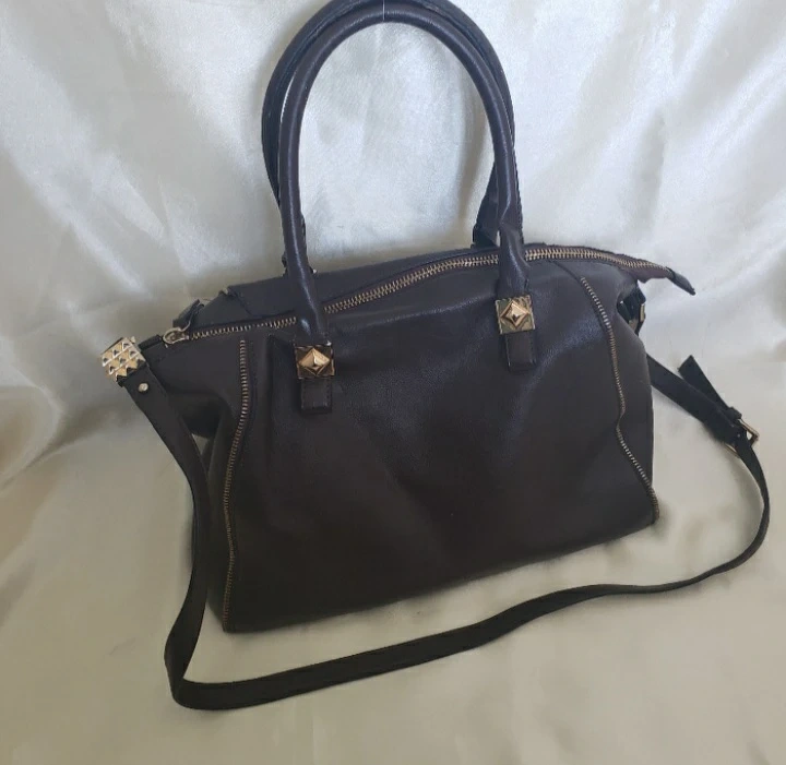 Stylish dark brown handbag. Features gold-toned zipper and hardware. Multiple compartments inside. Includes shoulder strap. Some wear on the straps