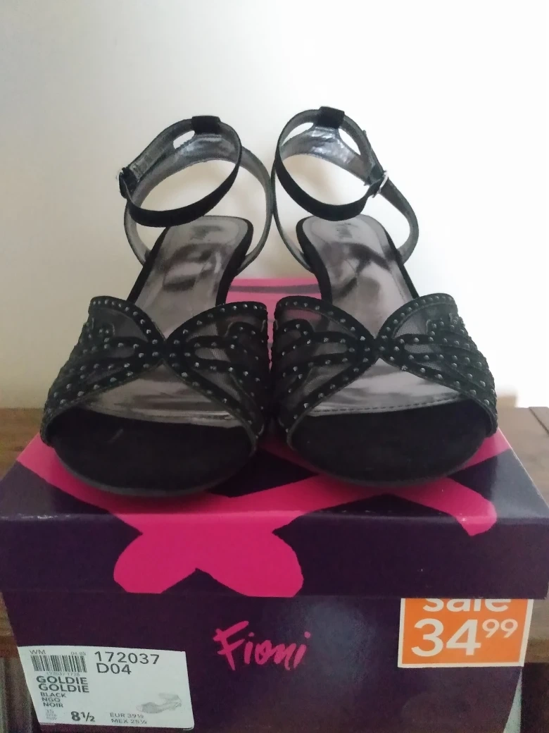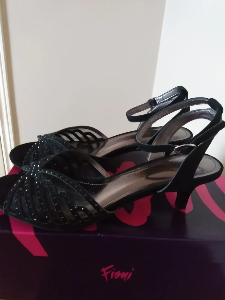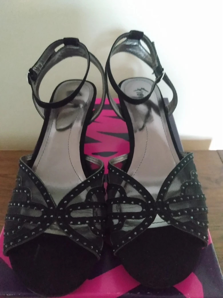 Black women's dress sandals. Ankle strap closure. Rhinestone embellishments. Low 1 1/2 inches wedge heel. Very comfortable Great for special occasions (Cash pick up)