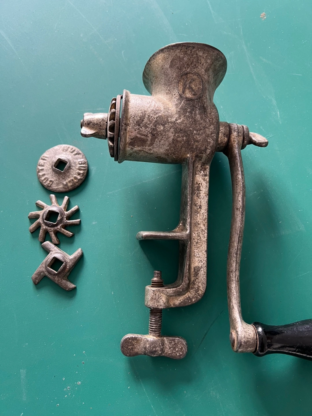Antique hand-crank meat grinder. Includes three cutting plates. Shows significant wear from age and use. Great for collectors or rustic kitchens. My mom used this my entire childhood - but the time has come to part with it