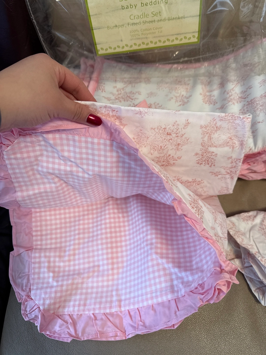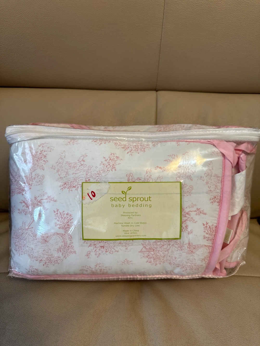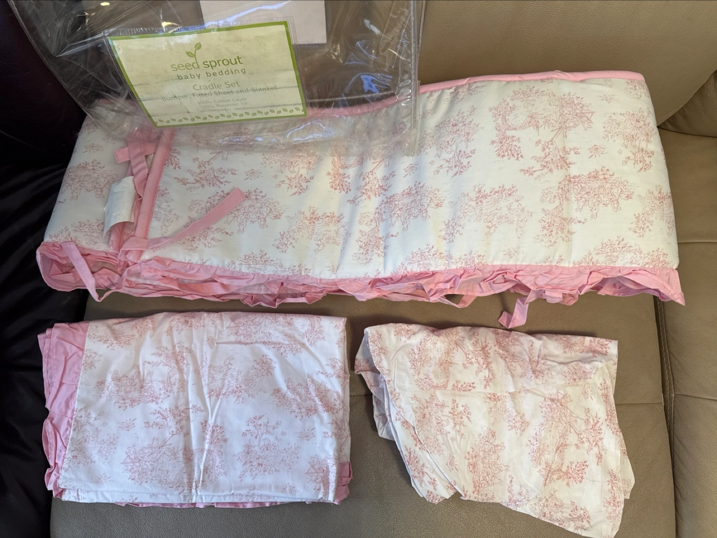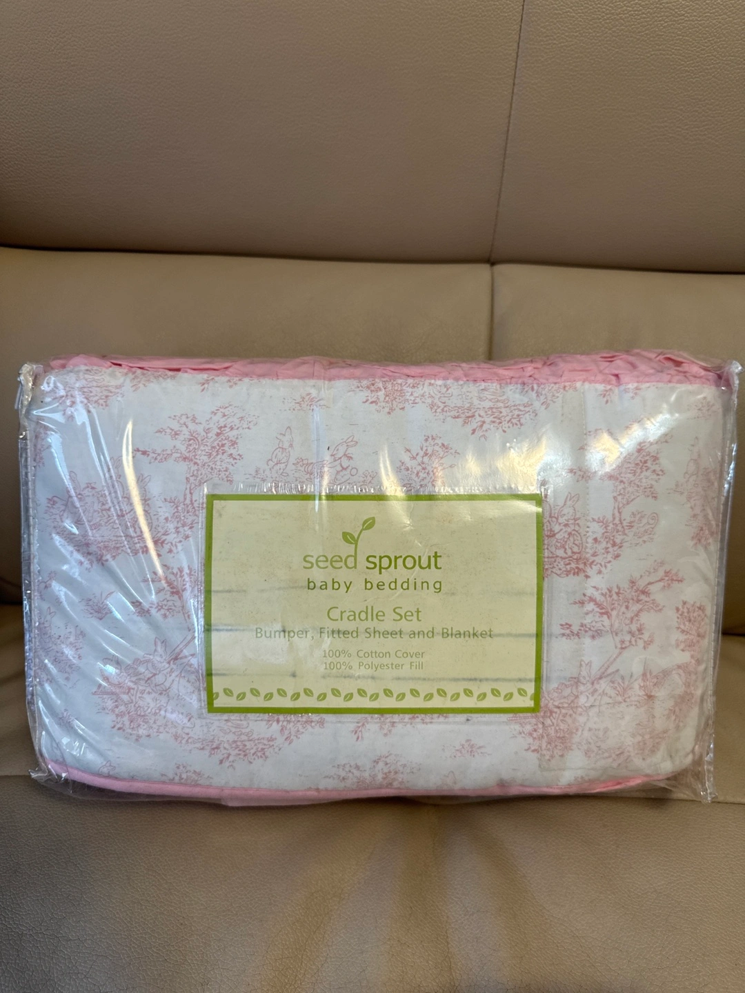 Brand new baby cradle/crib set. Includes bumper (crib protector), fitted sheet, and blanket. Take a look at my other items if interested. Can bundle with my other stuff for cheaper! Can meetup in Markham. Cash only please