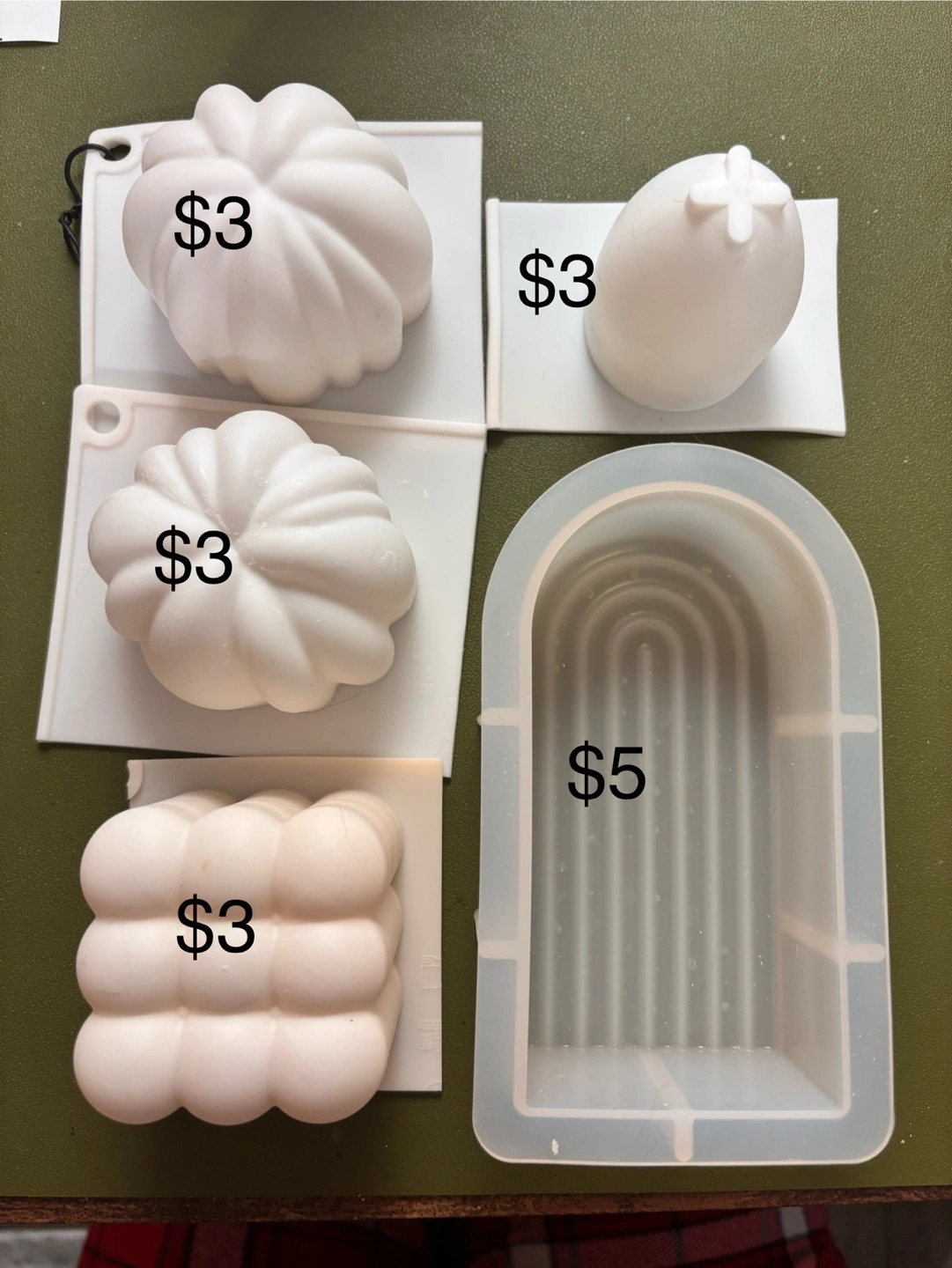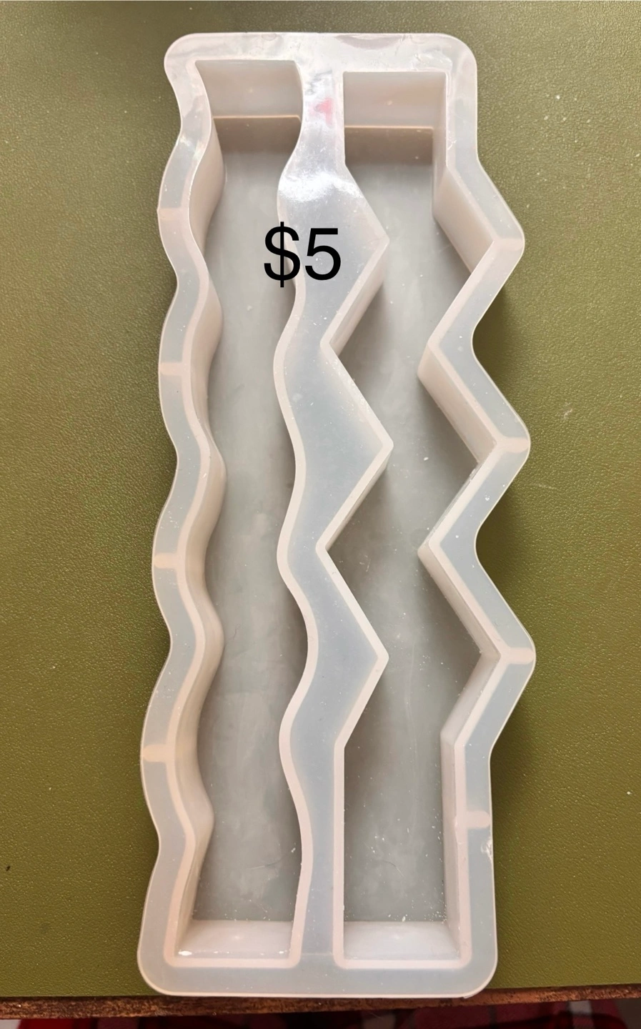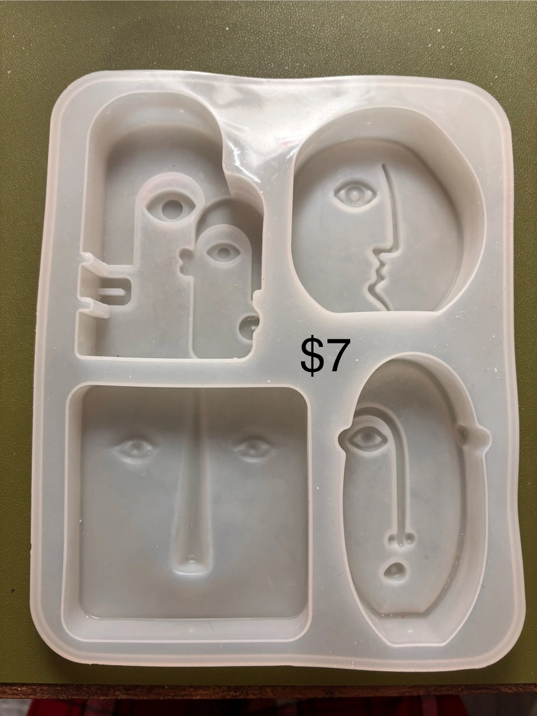 Various silicone resin molds for crafting. Includes abstract face designs, wavy/zigzag patterns, and unique shapes. Perfect for candles. Prices vary per mold.