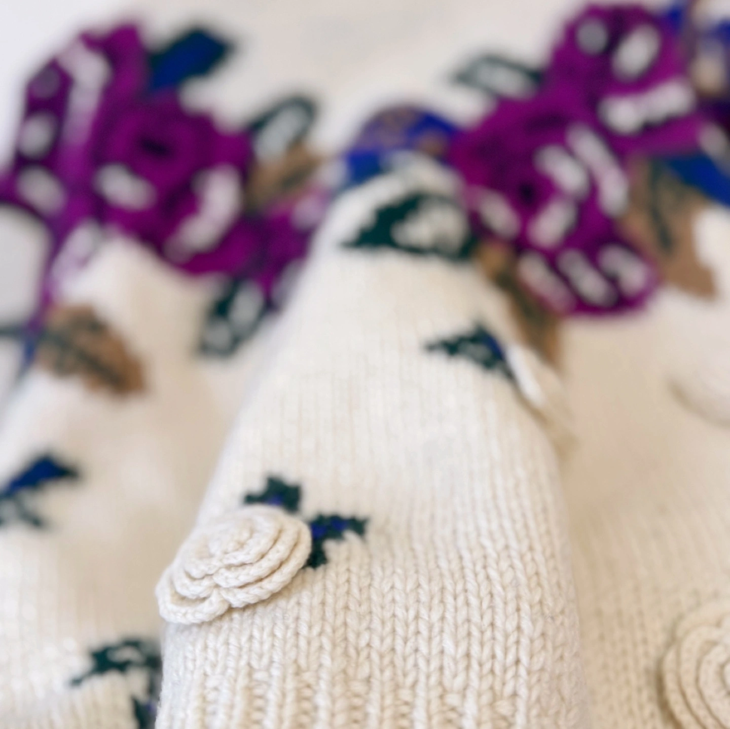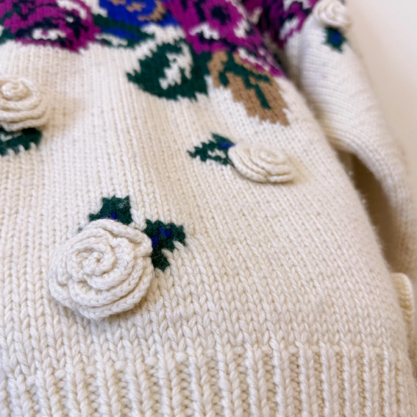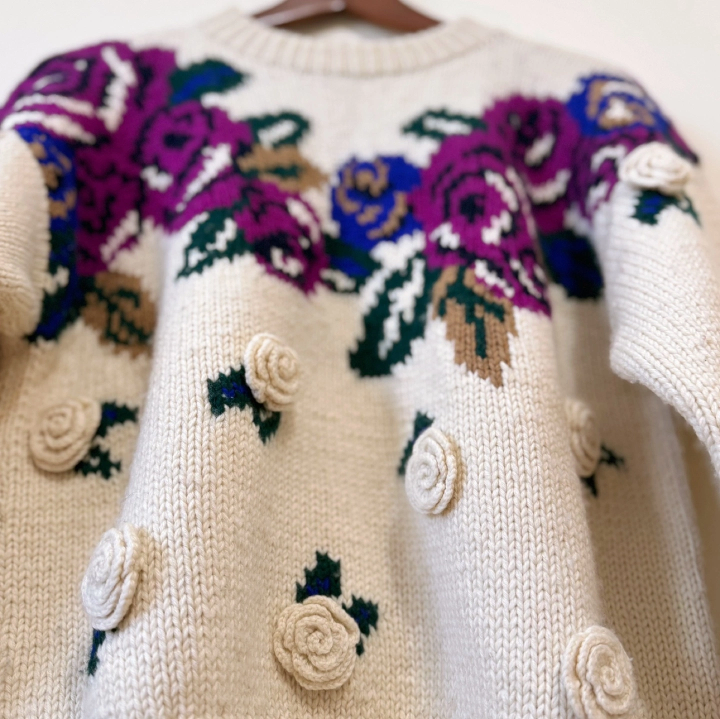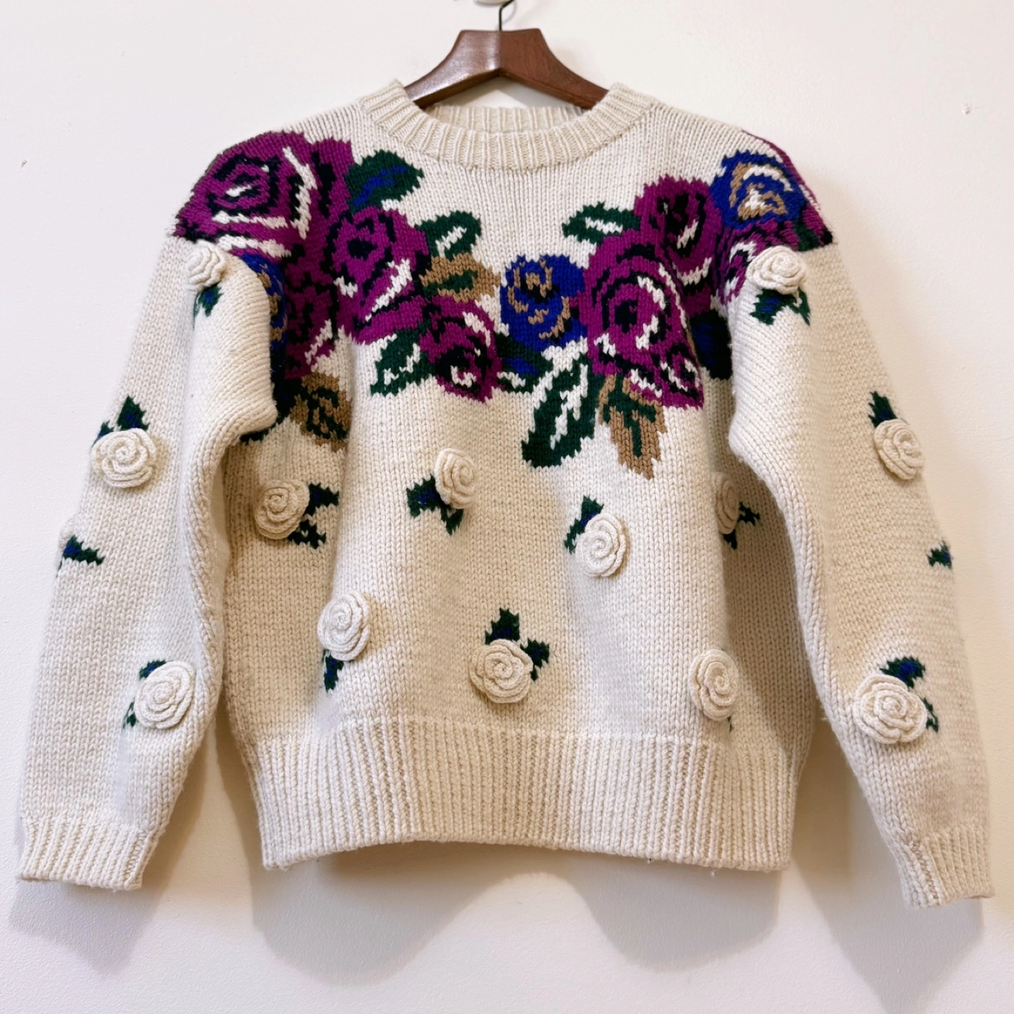A romantic and cozy vintage sweater adorned with rich purple roses and detailed 3D crochet rosettes. The ivory wool-blend base highlights the vibrant purple floral design, making this a perfect piece for adding charm and character to your cold-weather wardrobe. ✔ Material: • Wool blend – warm, soft, and comfortable ✔ Size: • Chest: 56 cm (22”) • Length: 55 cm (21.7”) • Recommended for Women’s M–L (or oversized fit for S) ✔ Features: • 3D cream rosette appliqués on body and sleeves • Striking purple rose knit pattern across chest • Ribbed neckline, cuffs, and hem for a secure and cozy fit • Unique vintage craftsmanship with a playful floral twist 📌 Condition: • Overall in excellent vintage condition. Due to the nature of vintage items, there may be minor signs of wear, such as slight pilling or small imperfections. ✨ A beautiful statement sweater for those who love vintage romance and floral charm. ✨