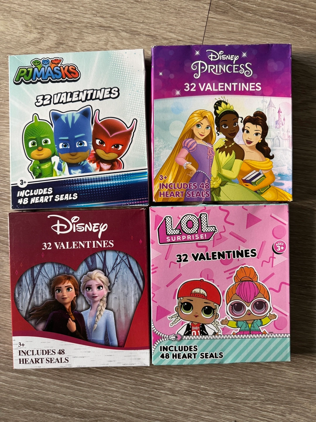 Four packs of Valentine's Day cards. Each pack includes 32 Valentines and 48 heart seals. Features PJ Masks, Disney Princesses, Frozen, and LOL Surprise! characters.