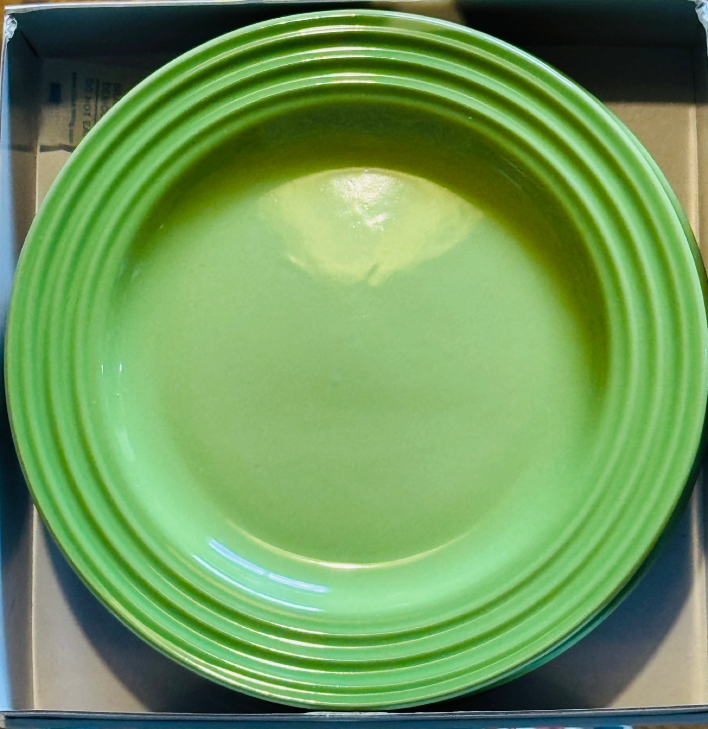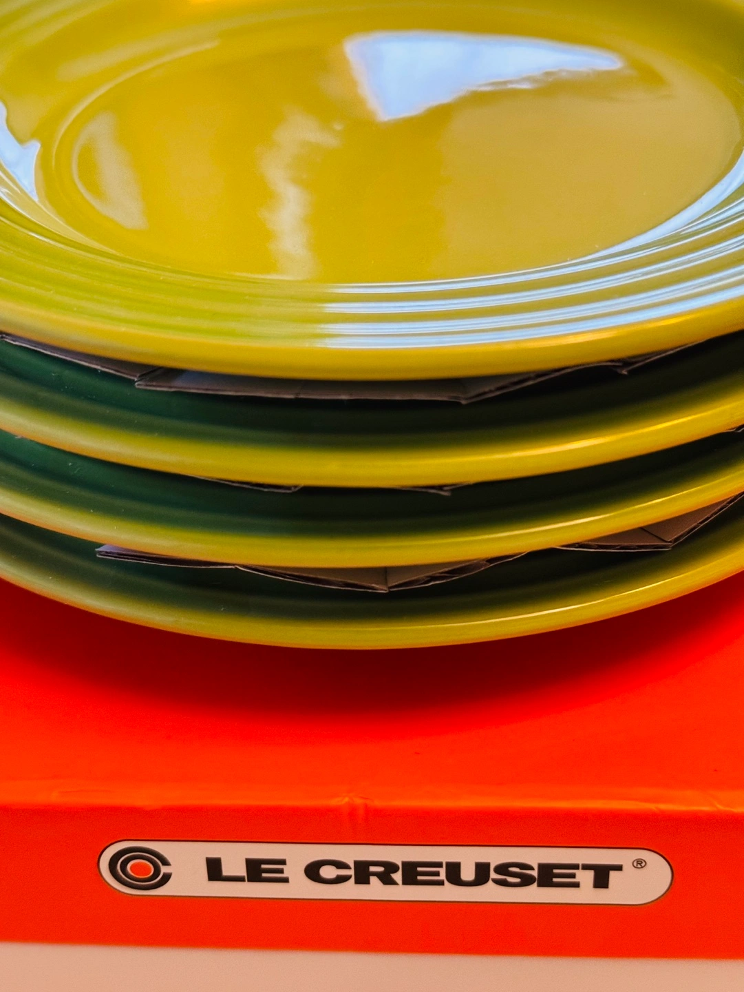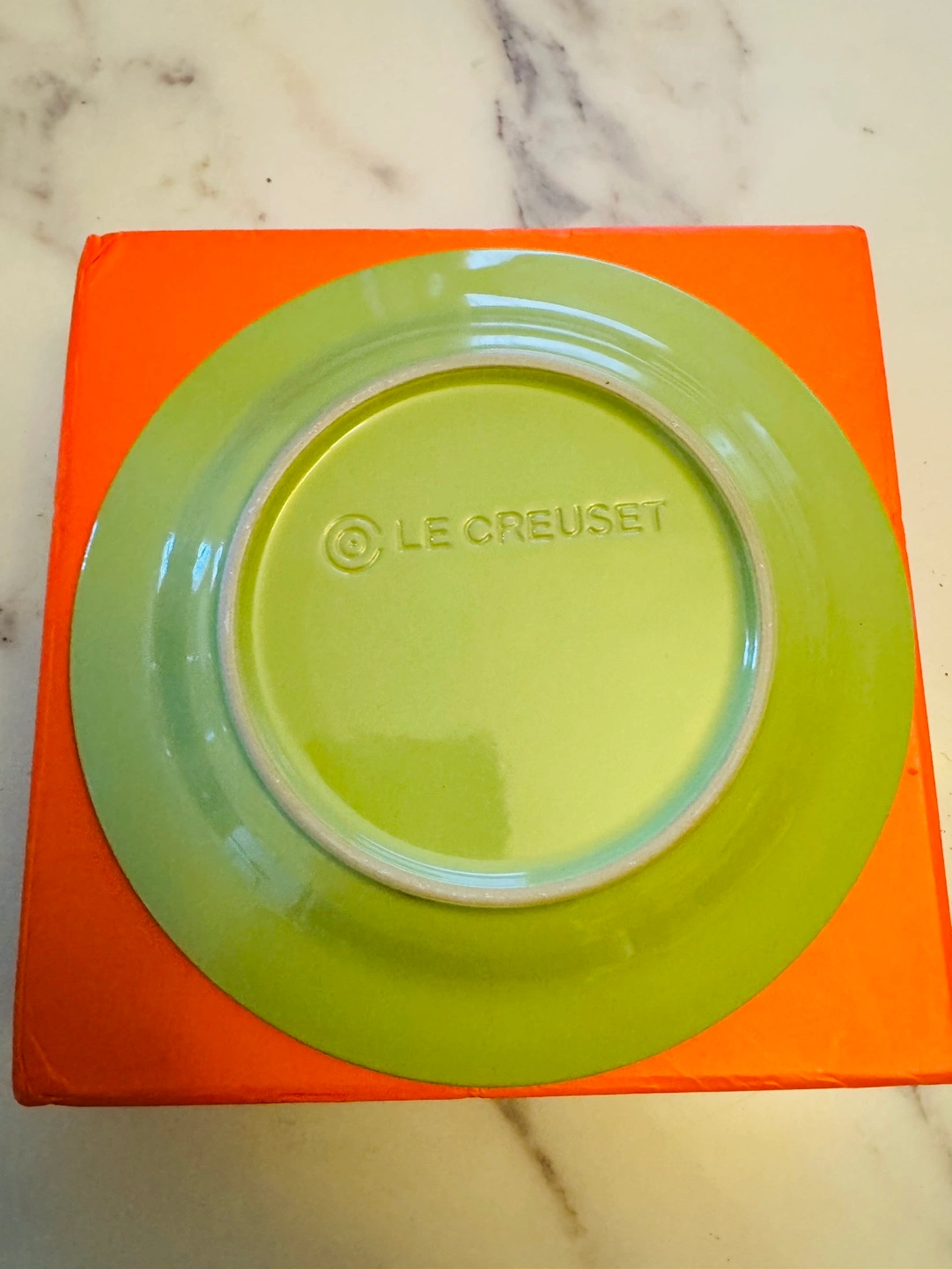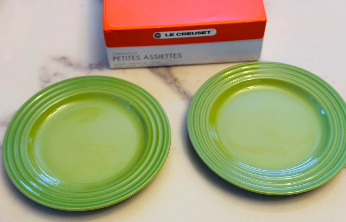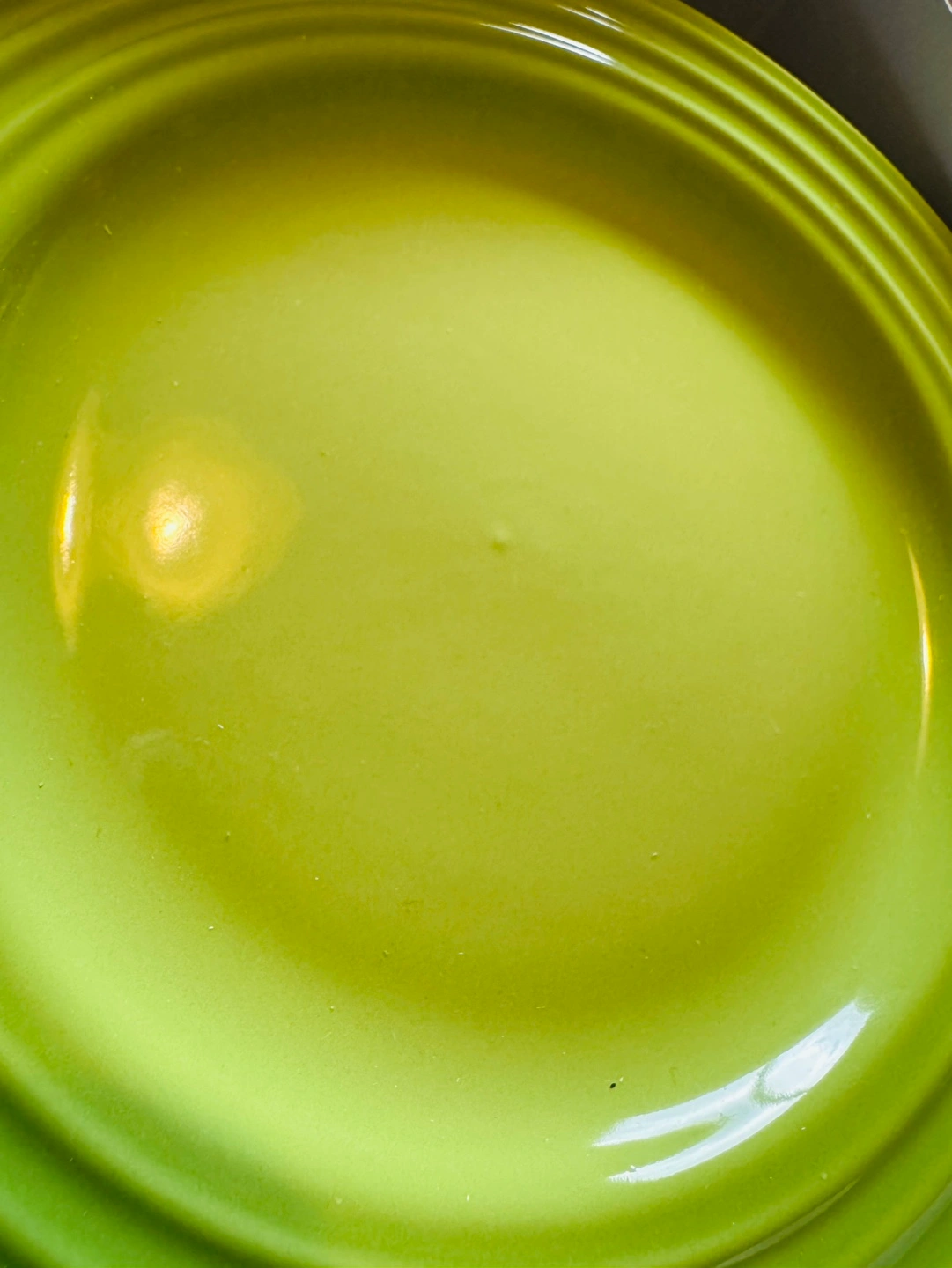 A set of 4 Classic Le Creuset appetizers plates, designed for serving appetizers, versatile and easily double as dessert plates and side dishes. A fellow Karroter is selling the matching Le Creuset PALM 3-tiered cake stand . The set would be stunning for parties or High Tea . You might want to check it out too. PALM is a vibrant hue of green and will be a great addition to your Spring & Summer decor . Microwave, Oven and Dishwasher Safe FIRM and FINALE PRICE. Please Note: Le Creuset items may contain some of imperfections due to nature of production. I noticed painting unbalanced a tiny bubble on one of the plates . I posted a picture .