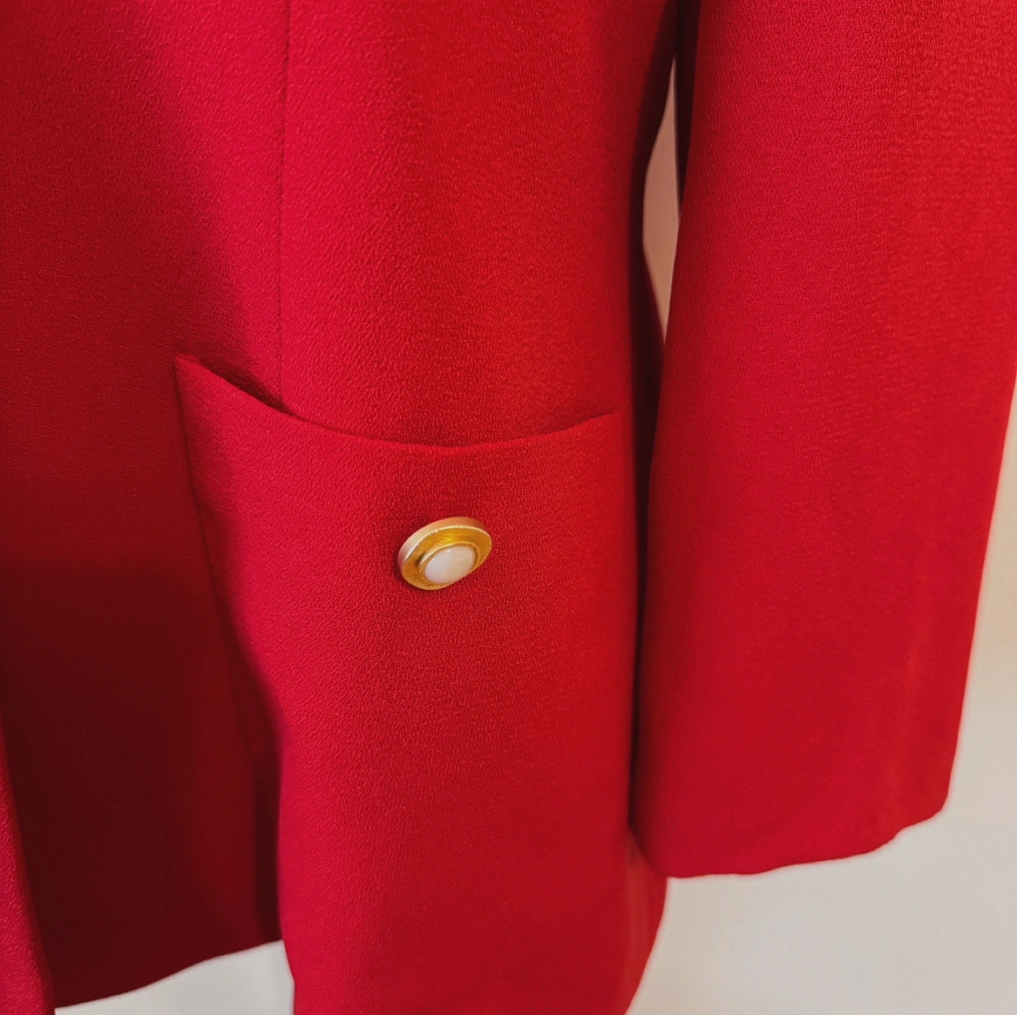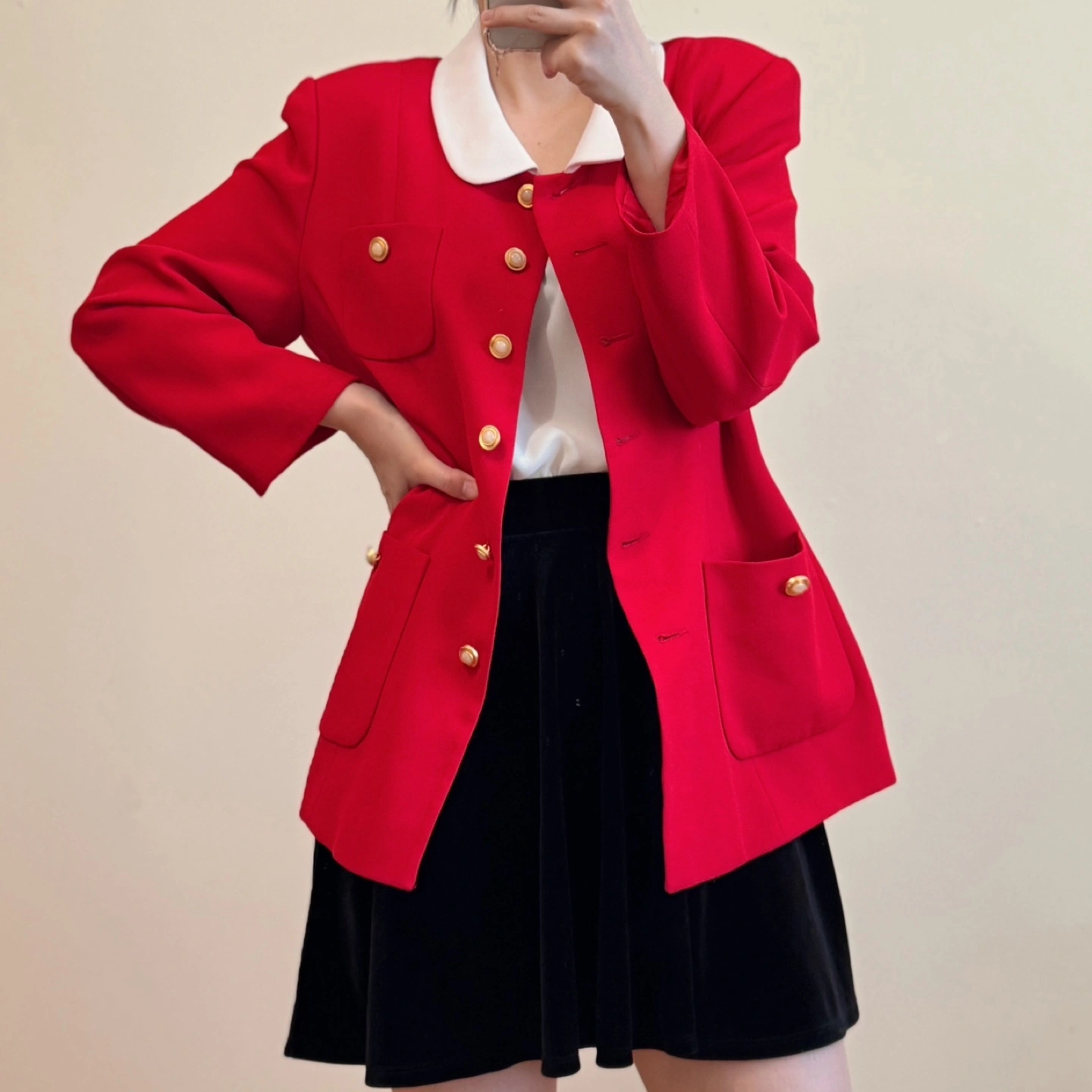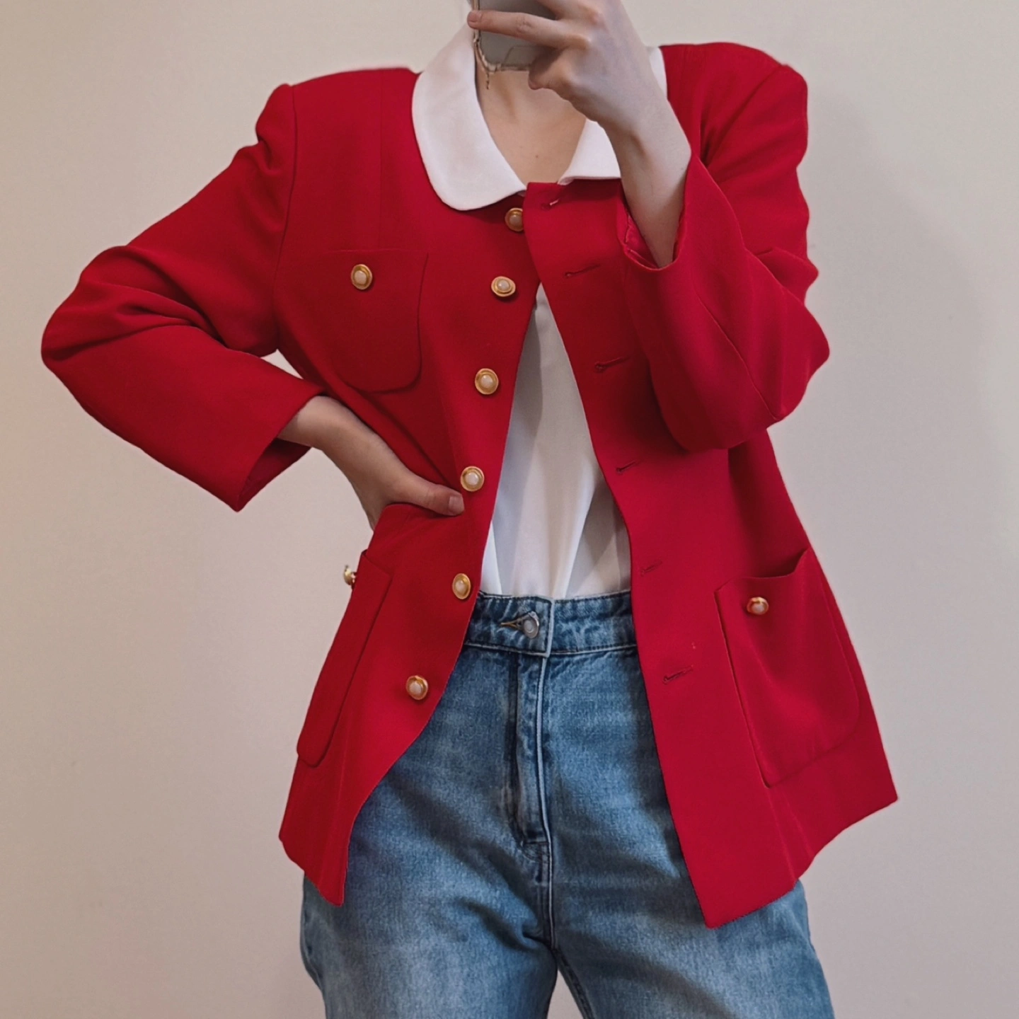 A striking vintage blazer in a bold red hue, featuring a charming white rounded collar and elegant pearl-accented gold buttons. With its structured silhouette and four functional pockets, this piece combines sophistication and vintage flair—perfect for dressing up any look. ✔ Material: • Fabric content not listed, but feels like a high-quality polyester blend ✔ Size: • Shoulder: 44 cm (17.3”) • Chest: 52 cm (20.5”) • Total Length: 69 cm (27.2”) • Recommended for M-L ✔ Features: • Classic white peter pan collar for a timeless charm • Gold-toned buttons with pearl centers add elegance • Four front pockets – functional and stylish • Tailored silhouette enhances your shape • Made in Korea – rare vintage find from Ji Tak Ladies Collection 📌 Condition: • Overall in excellent vintage condition. Due to the nature of vintage items, there may be minor signs of wear, such as slight stains or small imperfections. ✨ A collector’s gem with classic details and modern charm – elevate your wardrobe with this timeless vintage beauty! ✨
