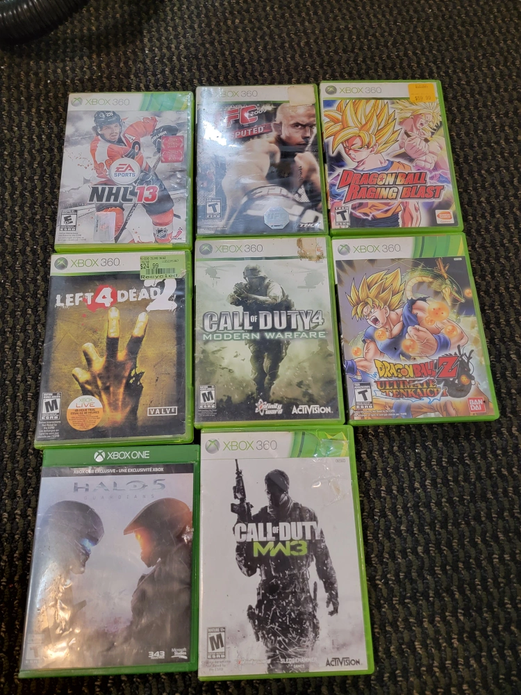 Collection of eight pre-owned video games. NHL 13 - 5 UFC Undisputed- 5 Dragon Ball Racing Blast - 25 Left 4 Dead 2 - 30 Call of Duty 4: Modern Warfare - 5 Dragon Ball Z: Ultimate Tenkaichi - 15 Halo 5: Guardians - 10 Cod mw3 - 5 Cod 4 - 5 prices from ebay feel free to message any questions, and if bundling I'm willing to negotiate