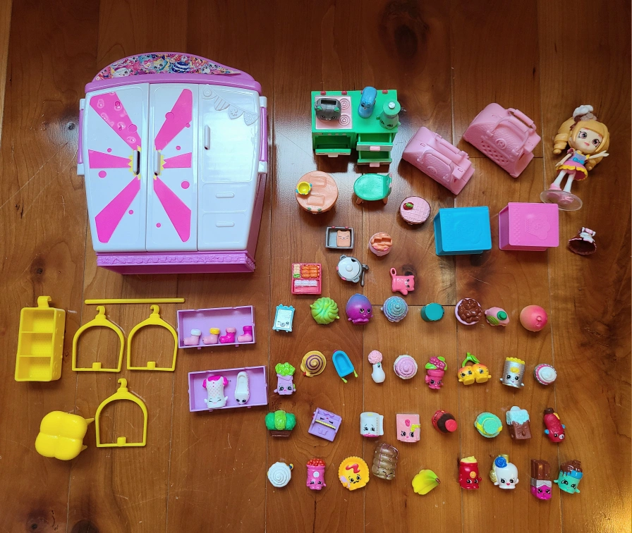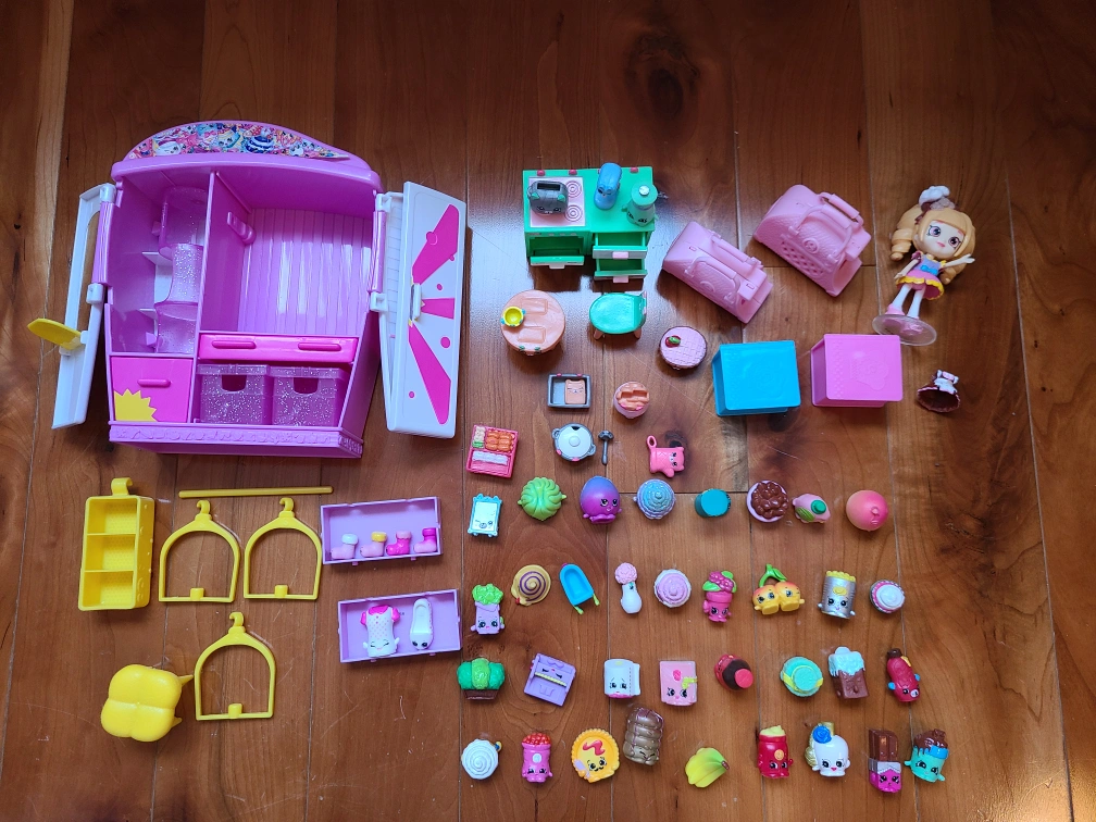 153Large Shopkins playset, includes wardrobe, kitchen, furniture, and many Shopkins characters. Great for imaginative play. Many accessories included.