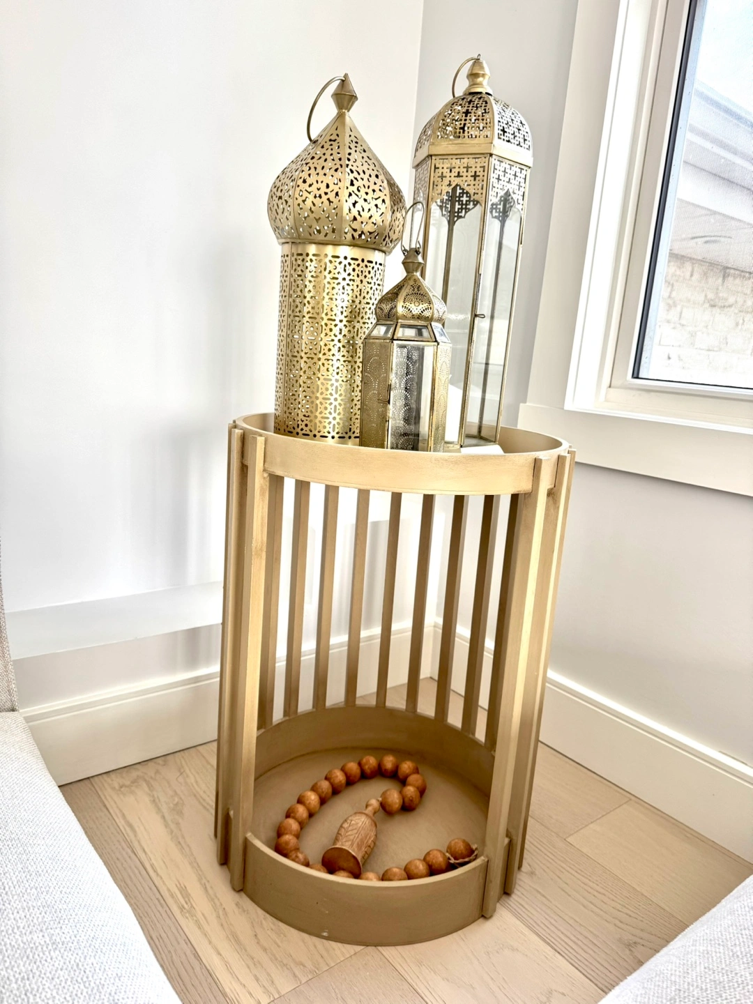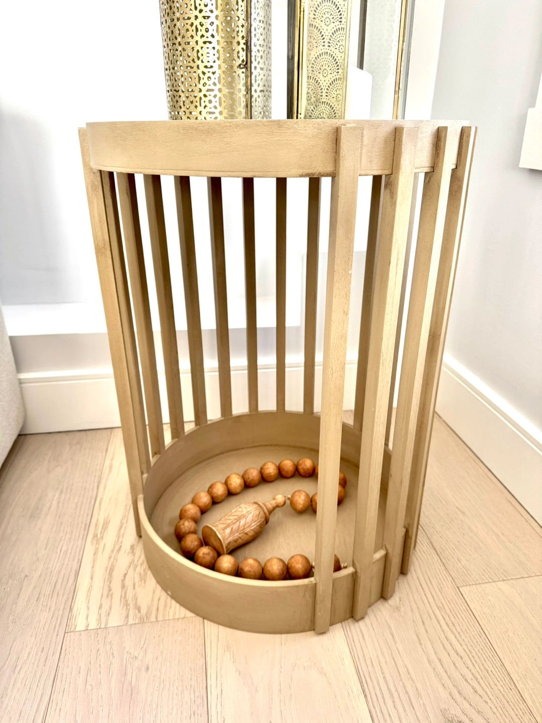 Stylish beige wooden accent table. Round top and open sides. Perfect for a small space. Adds a touch of elegance to any room.
