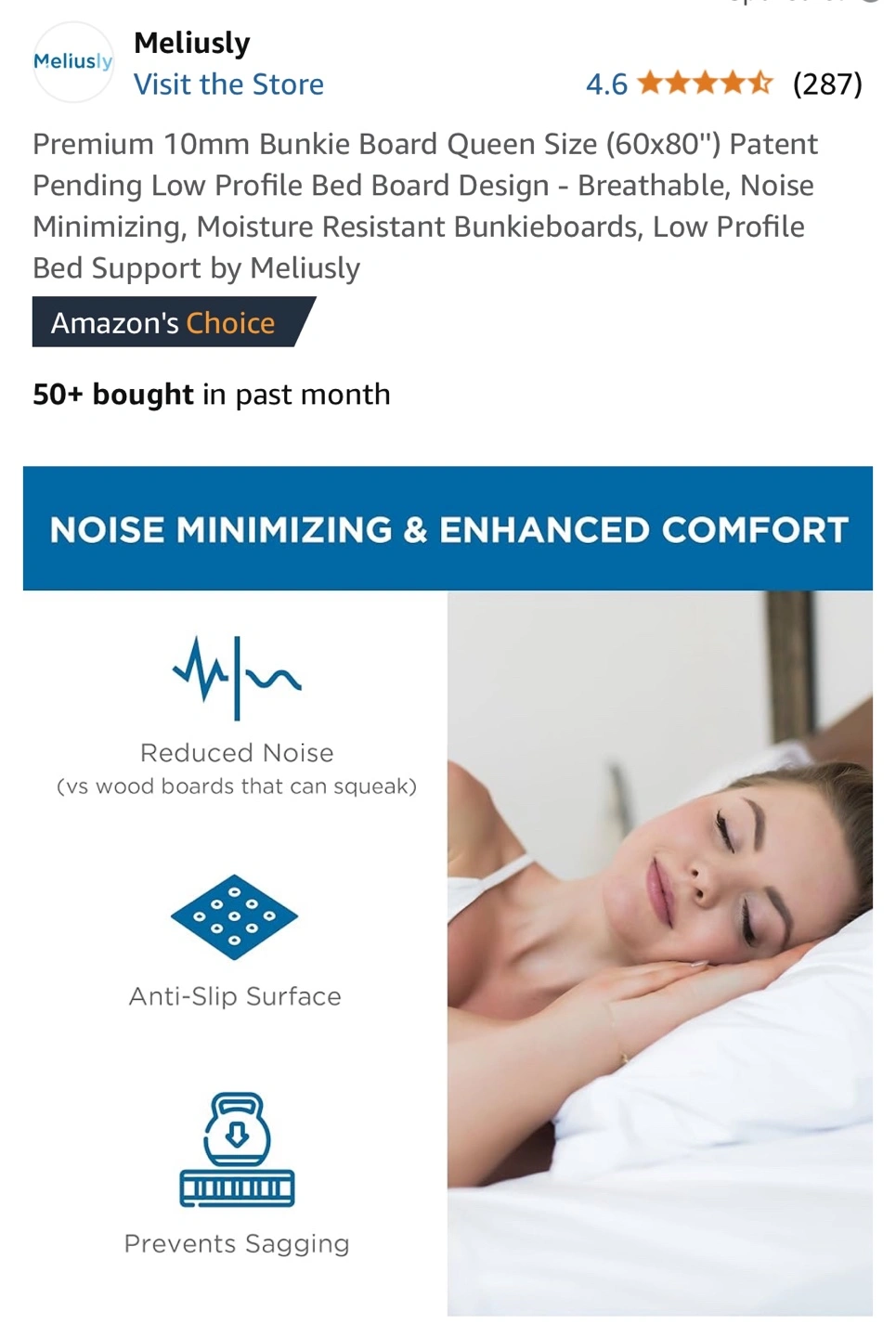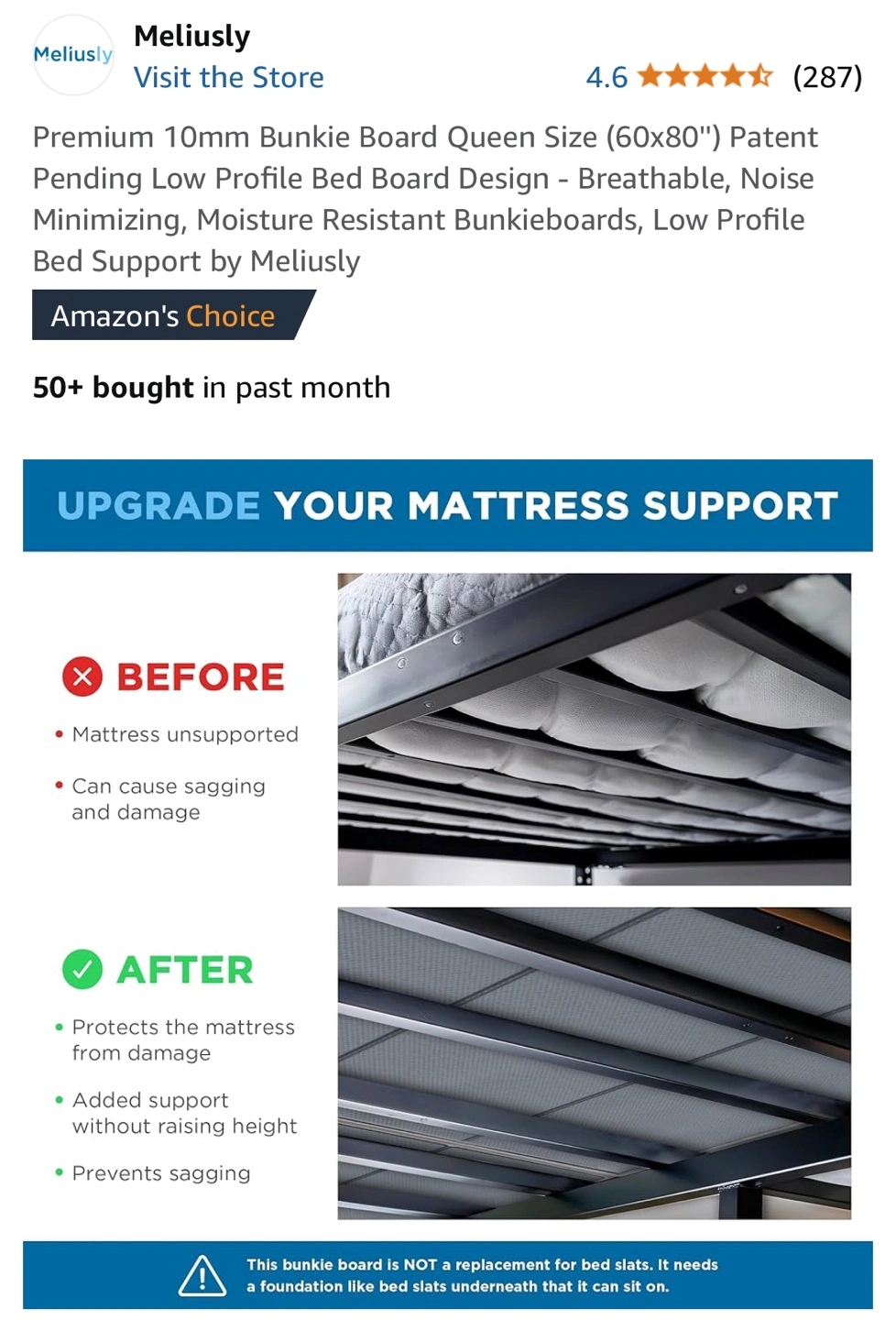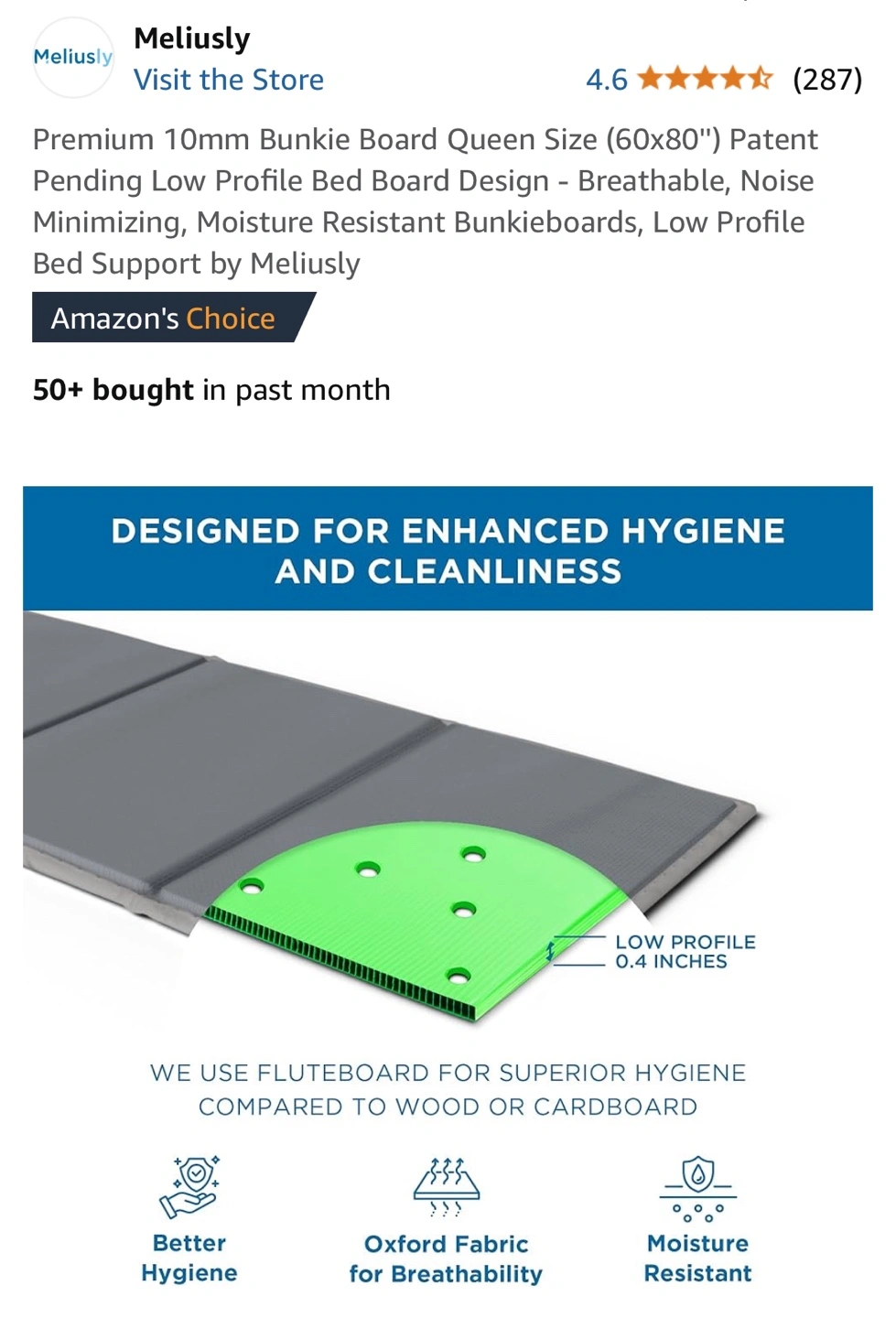 Size Queen (60x80'') Colour Grey Material Lifetime Warranty, Heavy Duty Flute Board Style Contemporary Brand Meliusly Product care instructions Wipe with Damp Cloth Simple yet effective - Made of 10mm high density flute board, this under mattress support board solves many of the issues that bunkie boards are notorious for: It's breathable, moisture resistant, and noise minimizing. Premium materials ensure longevity and optimal mattress support, maintaining its structure over time. Patent Pending Noise Minimizing Design: Covered in industrial Oxford fabric to minimize noise between the board and bed slats, ensuring a peaceful night's sleep without the typical creaks and sounds that wooden mattress support boards are known for. Stable and Non-Slip: Features a silicone honeycomb finish on the bottom to grip bed slats firmly, preventing any movement. This ensures your mattress stays in place, providing consistent and reliable support. Ultimate Mattress Protection: Creates a solid, even surface that prevents mattress sagging into gaps between bed slats. Ideal for delicate foam and hybrid mattresses, protecting your mattress warranty and enhancing comfort and longevity.
