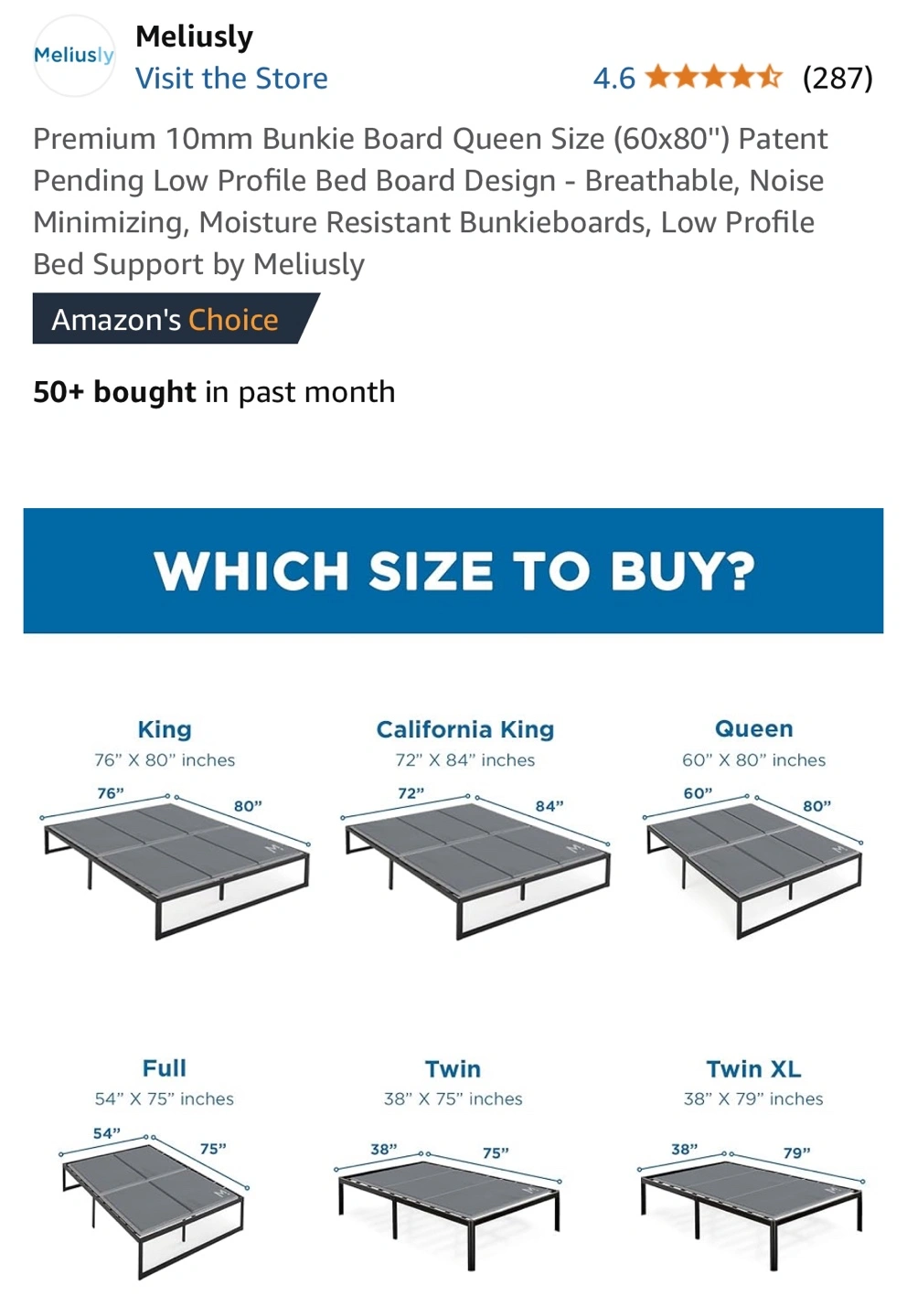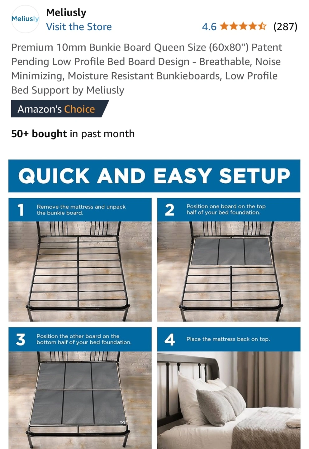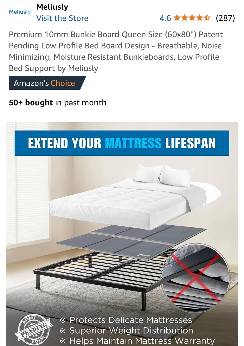 Size Queen (60x80'') Colour Grey Material Lifetime Warranty, Heavy Duty Flute Board Style Contemporary Brand Meliusly Product care instructions Wipe with Damp Cloth Simple yet effective - Made of 10mm high density flute board, this under mattress support board solves many of the issues that bunkie boards are notorious for: It's breathable, moisture resistant, and noise minimizing. Premium materials ensure longevity and optimal mattress support, maintaining its structure over time. Patent Pending Noise Minimizing Design: Covered in industrial Oxford fabric to minimize noise between the board and bed slats, ensuring a peaceful night's sleep without the typical creaks and sounds that wooden mattress support boards are known for. Stable and Non-Slip: Features a silicone honeycomb finish on the bottom to grip bed slats firmly, preventing any movement. This ensures your mattress stays in place, providing consistent and reliable support. Ultimate Mattress Protection: Creates a solid, even surface that prevents mattress sagging into gaps between bed slats. Ideal for delicate foam and hybrid mattresses, protecting your mattress warranty and enhancing comfort and longevity.