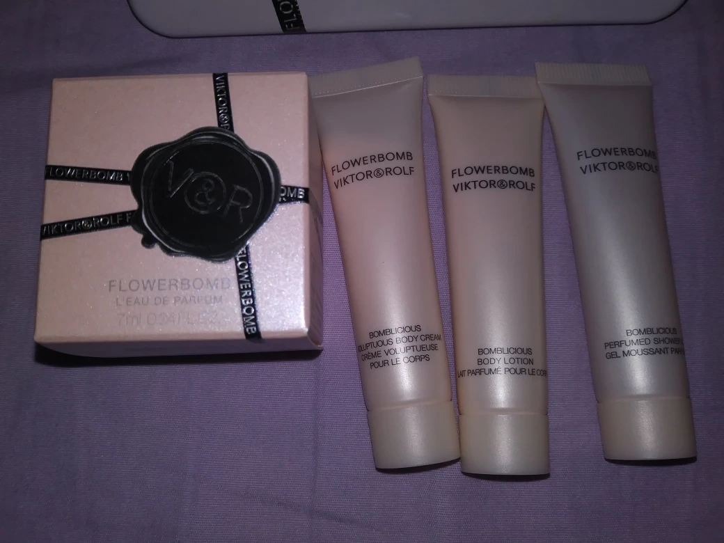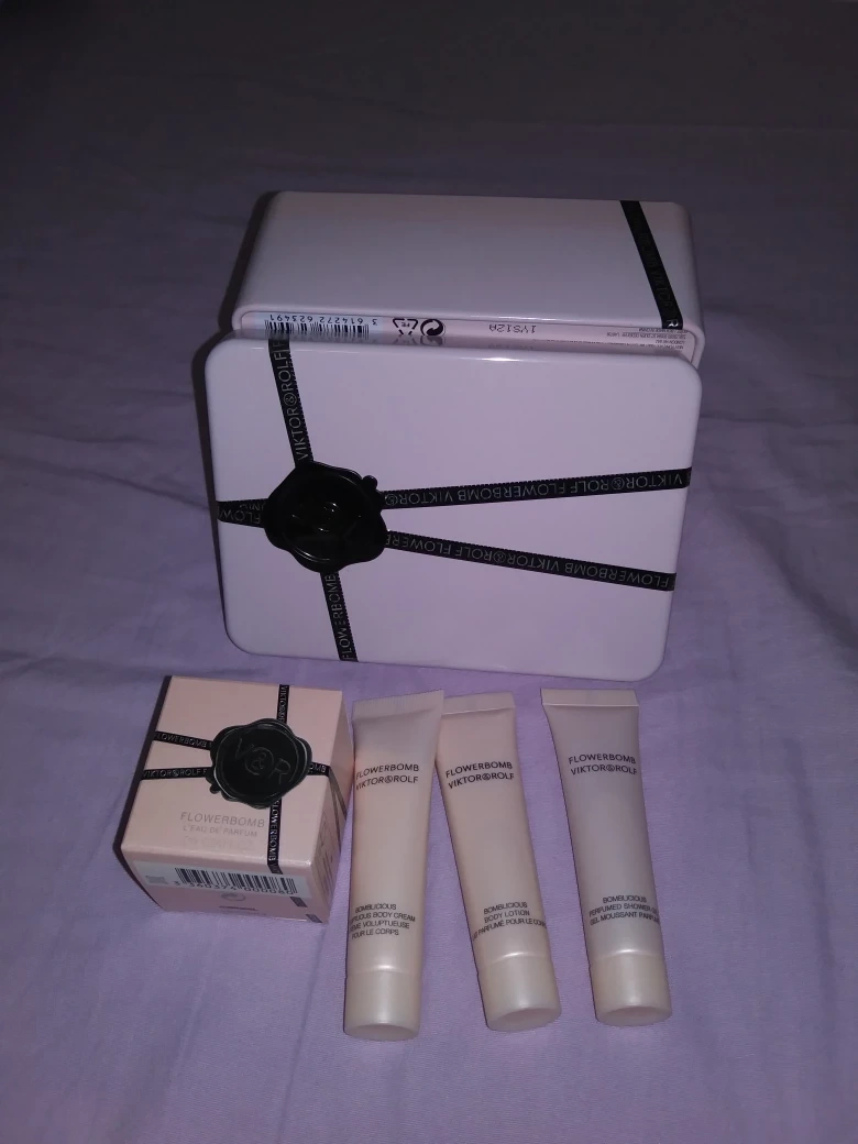 Includes Eau de Parfum, 7ml ,body cream,15 ml ,body lotion, 15ml and shower gel. 15ml All in a beautiful pink tin. Great gift!