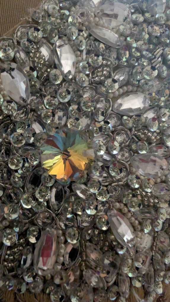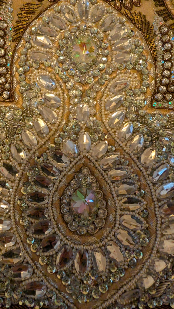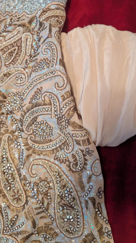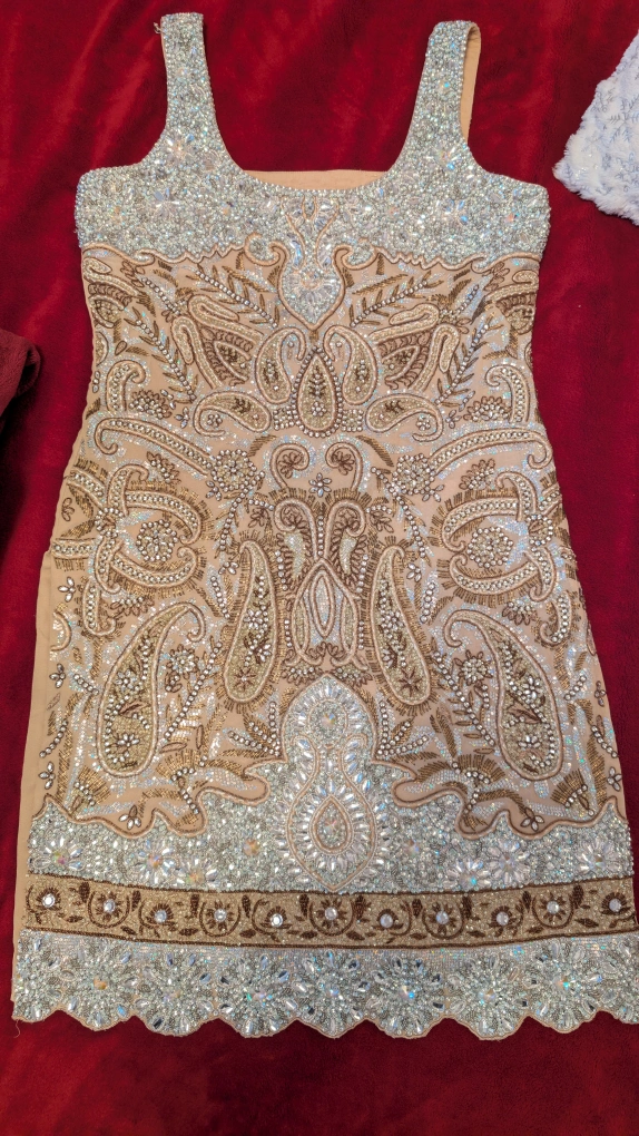 Beautiful beige kameez, heavily embellished with crystals and beads. Features intricate detailing and a scalloped hem. Sleeveless, with delicate straps. Stunning for special occasions.