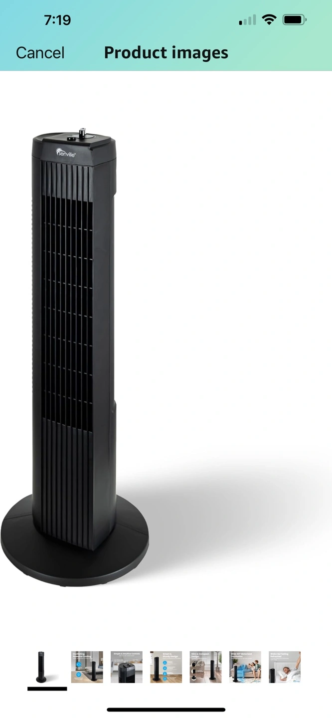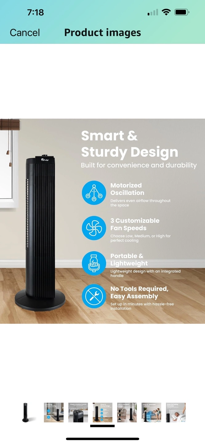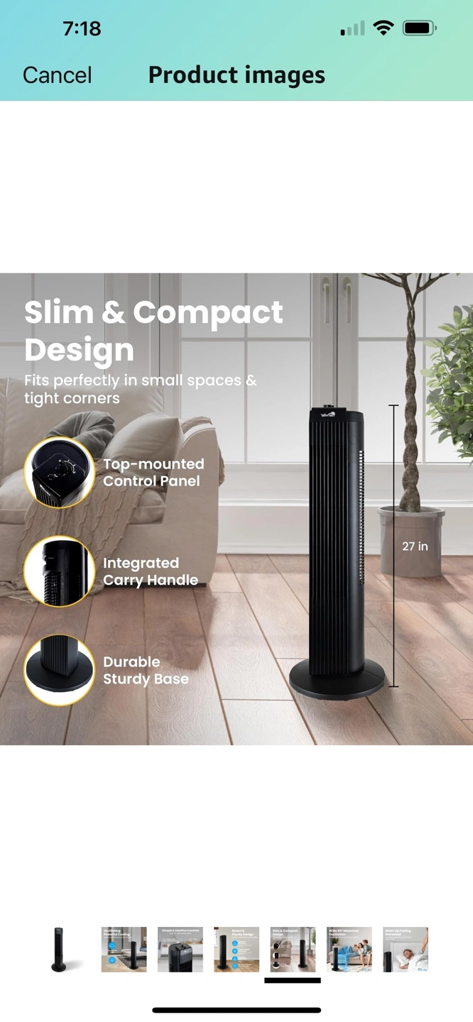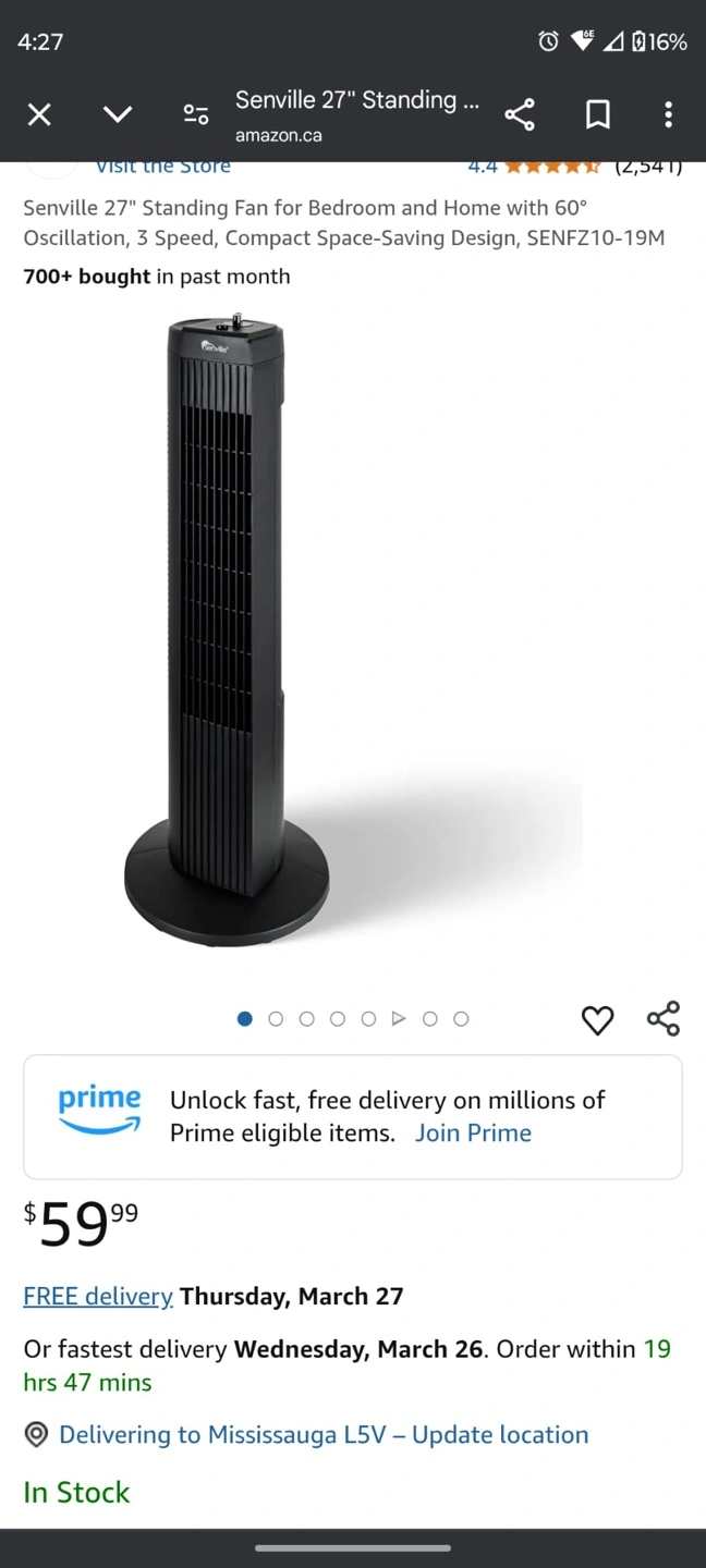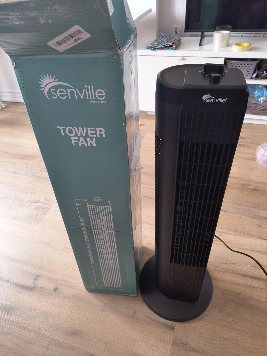 Senville 27" Standing Fan for Bedroom and Home with 60° Oscillation, 3 Speed, Compact Space-Saving Design, SENFZ10-19M Sleek black tower fan. Three speeds and motorized oscillation. Compact and lightweight design. Easy setup; no tools required. Includes integrated carry handle.