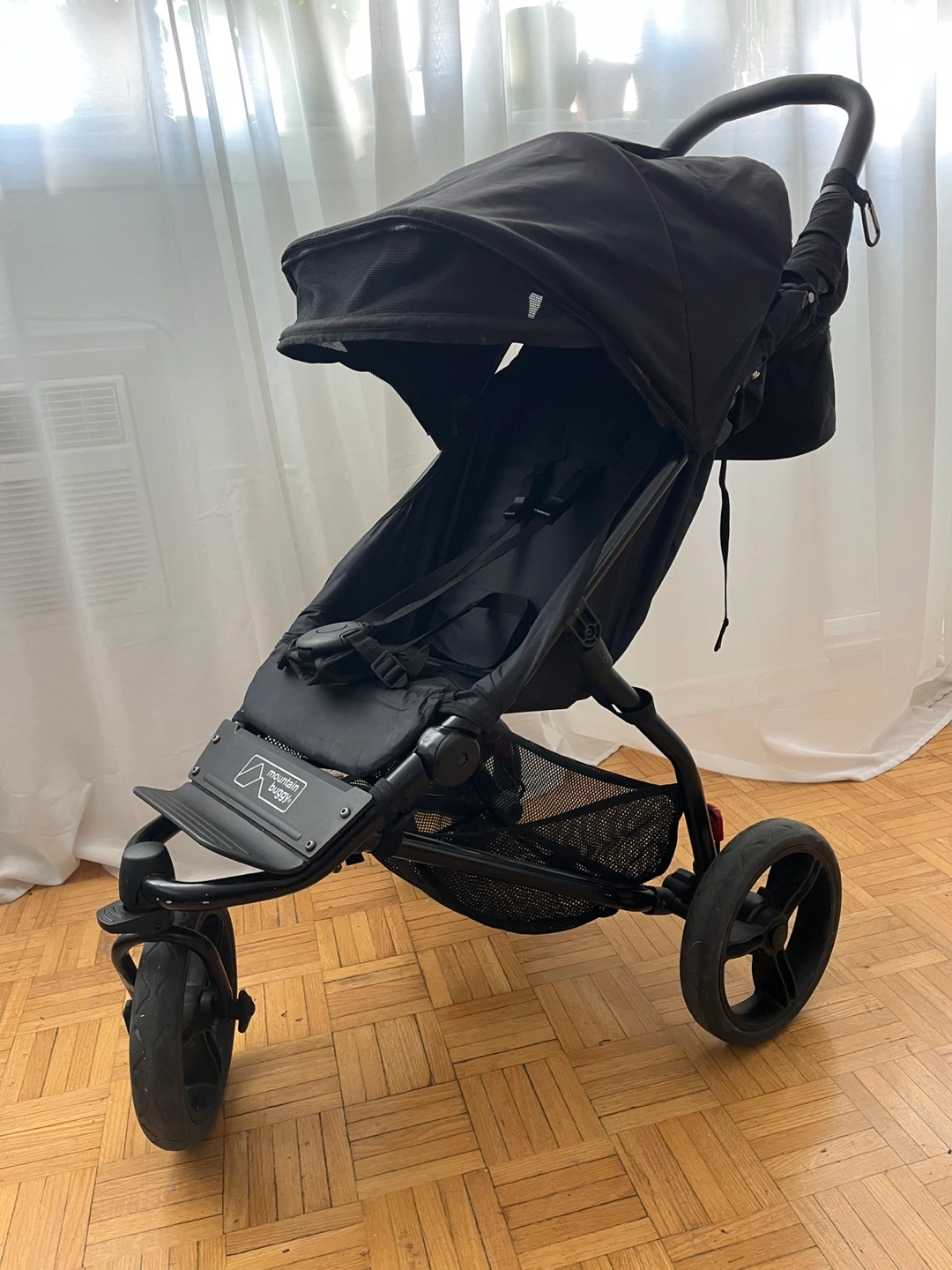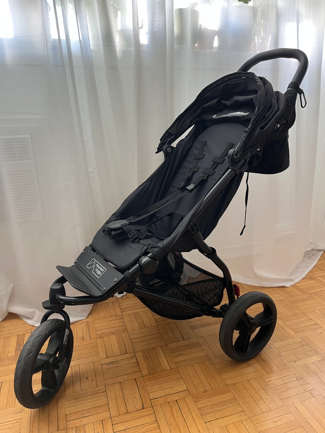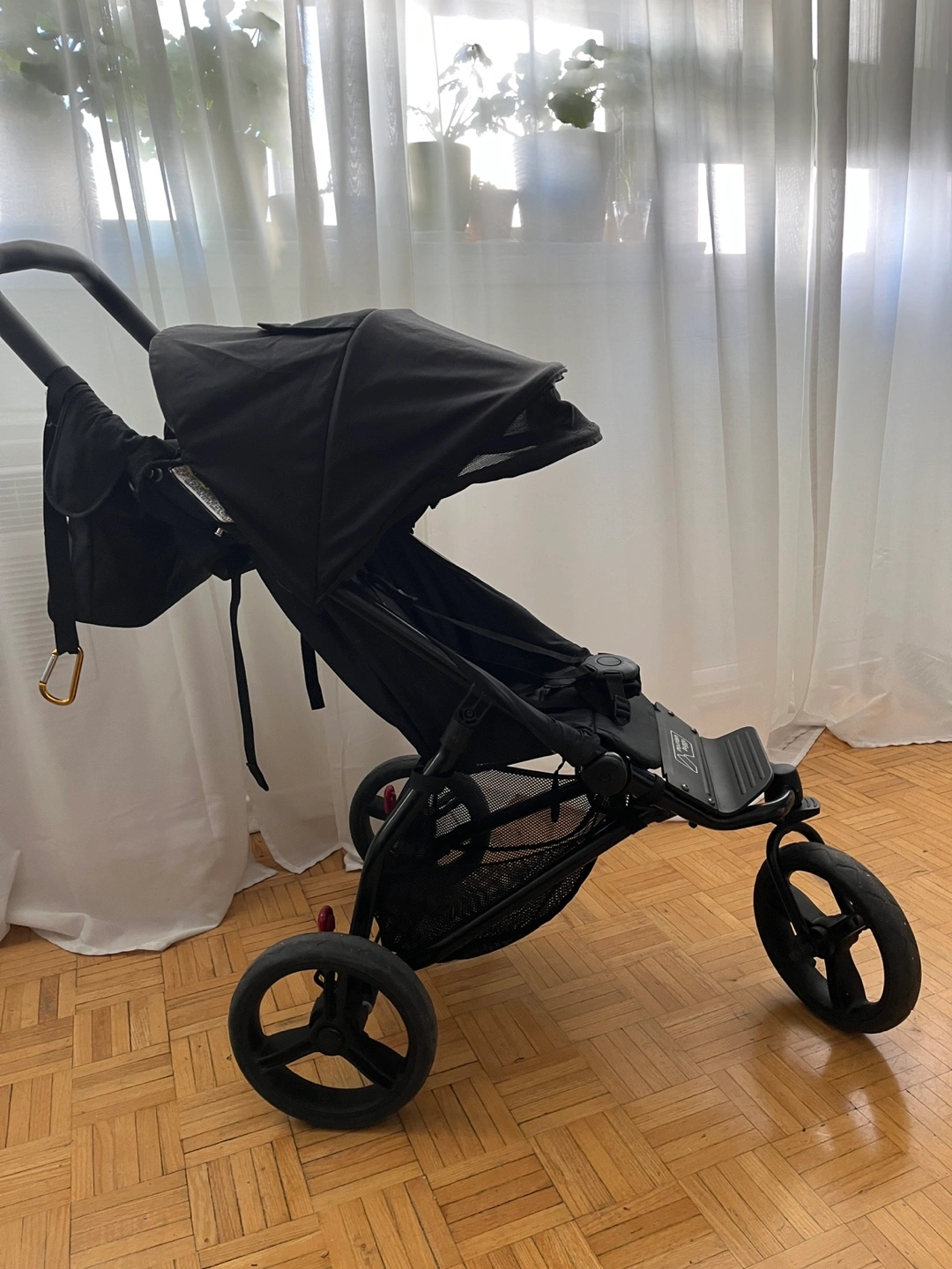 Three-wheeled jogging stroller, black colour. Features include a canopy, storage basket, and parent tray. Suitable for various terrains.