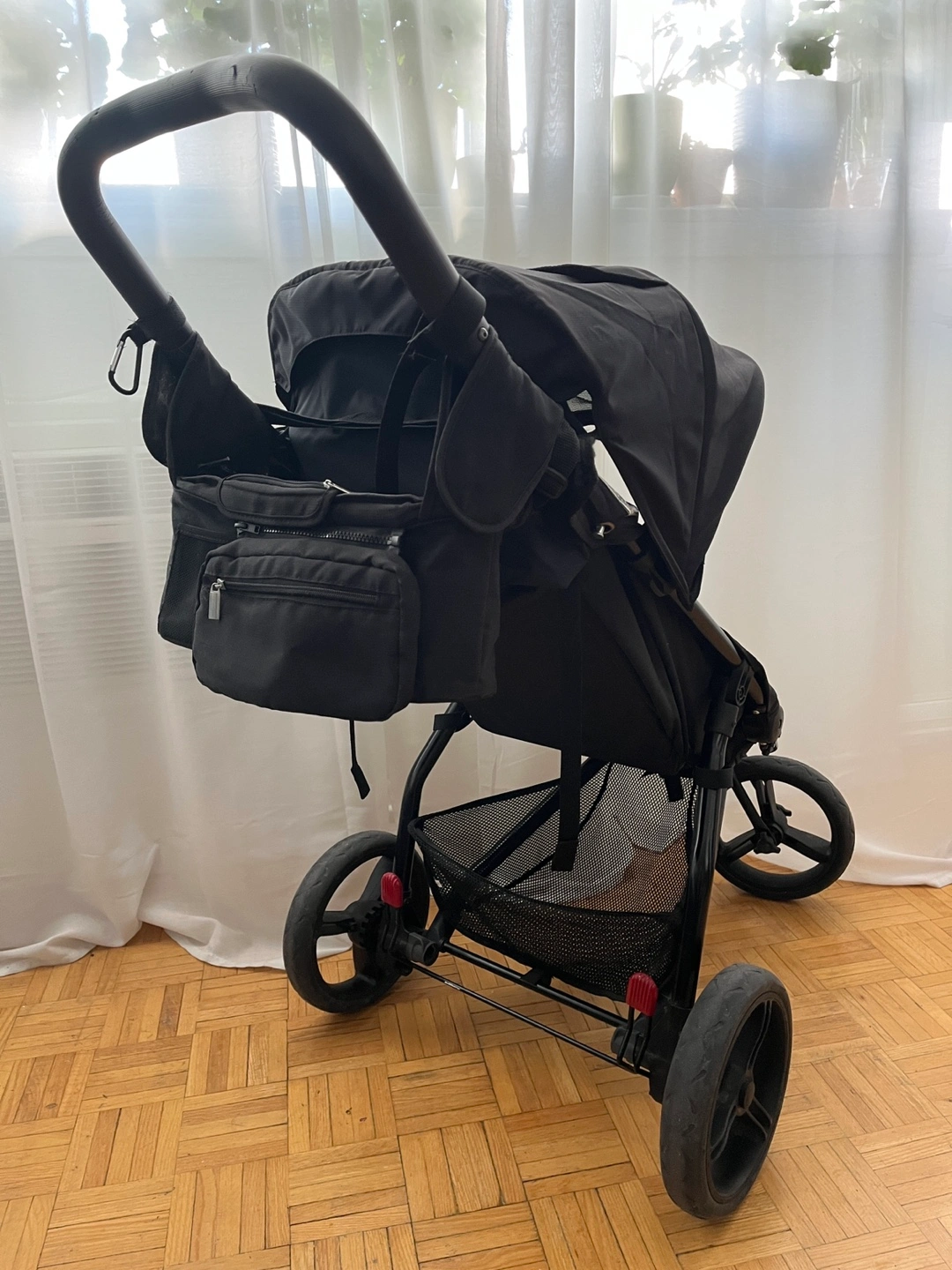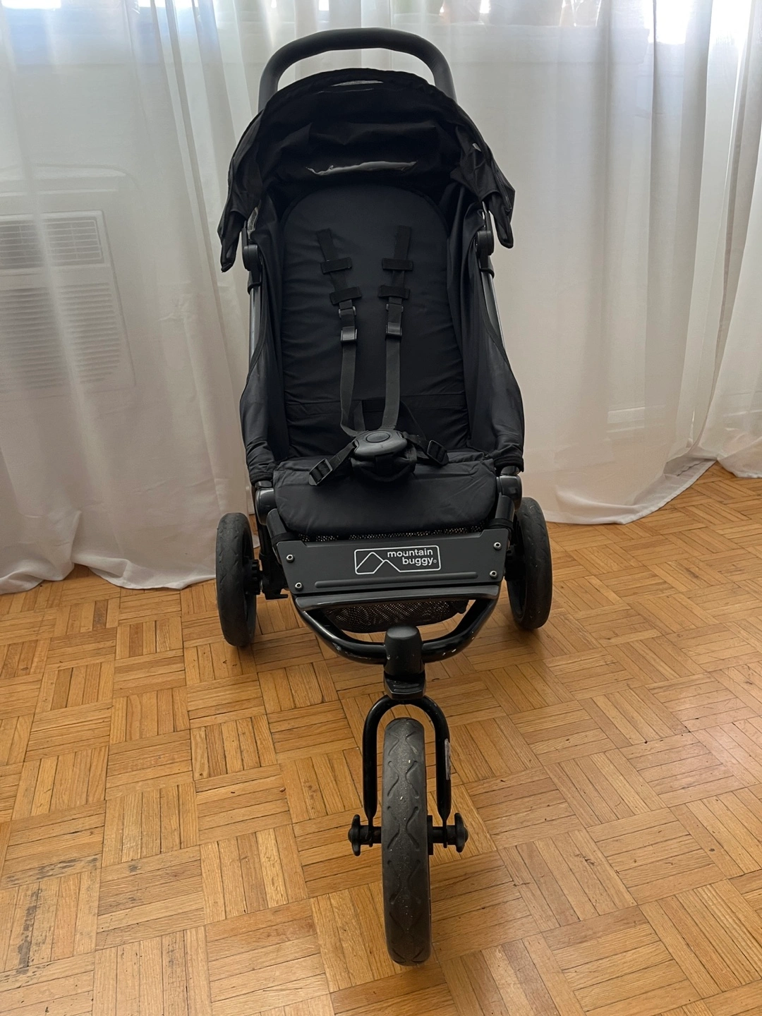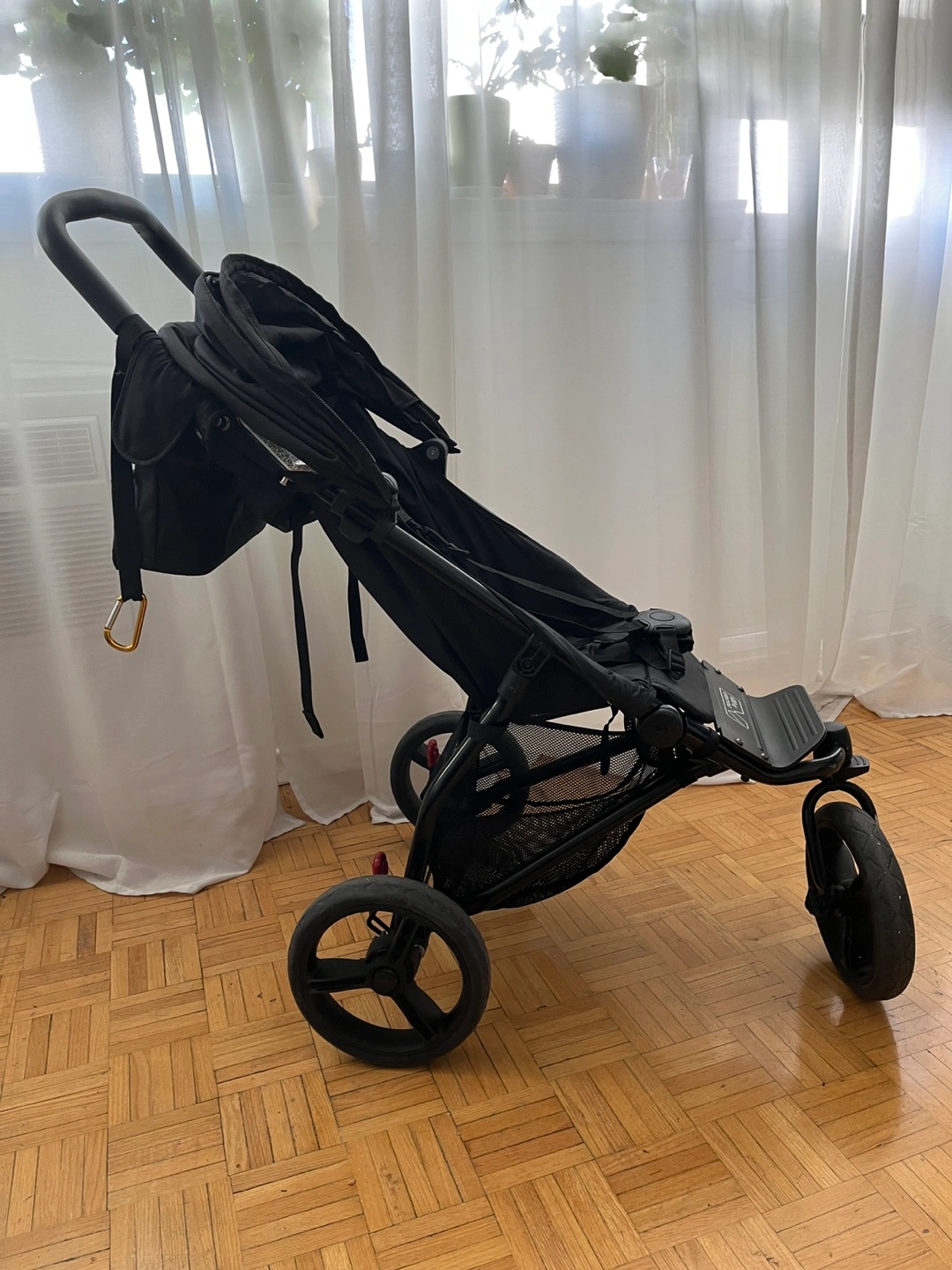 Three-wheeled jogging stroller, black colour. Features include a canopy, storage basket, and parent tray. Suitable for various terrains.