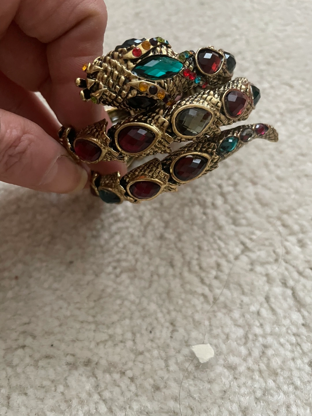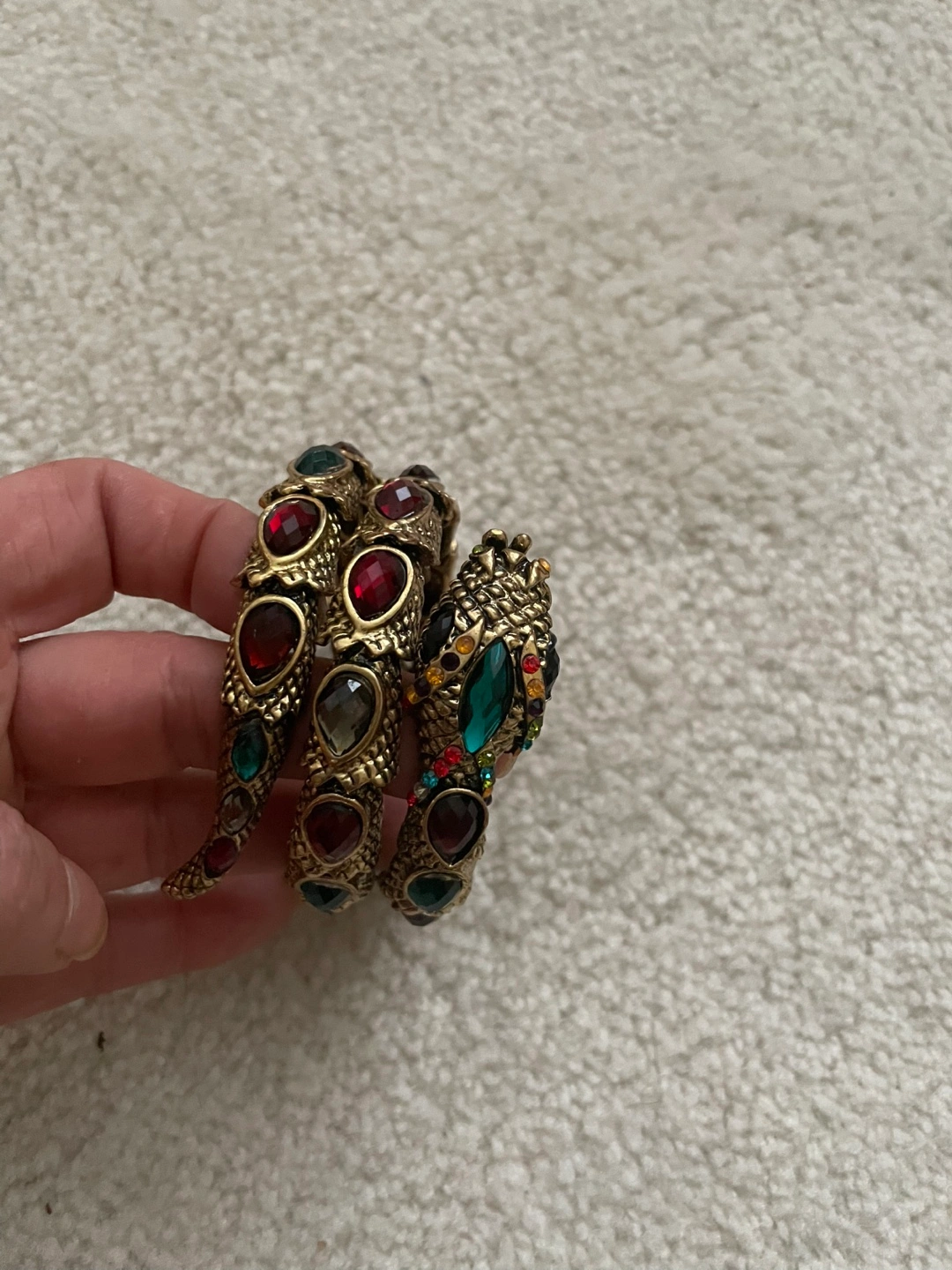 Unique double snake bracelet. Gold-tone metal. Multicoloured gemstones. Eye-catching design. Statement piece.