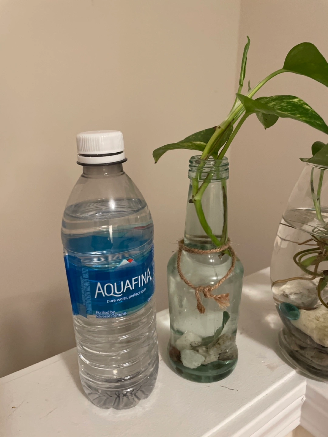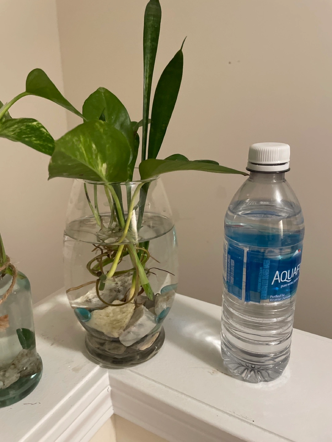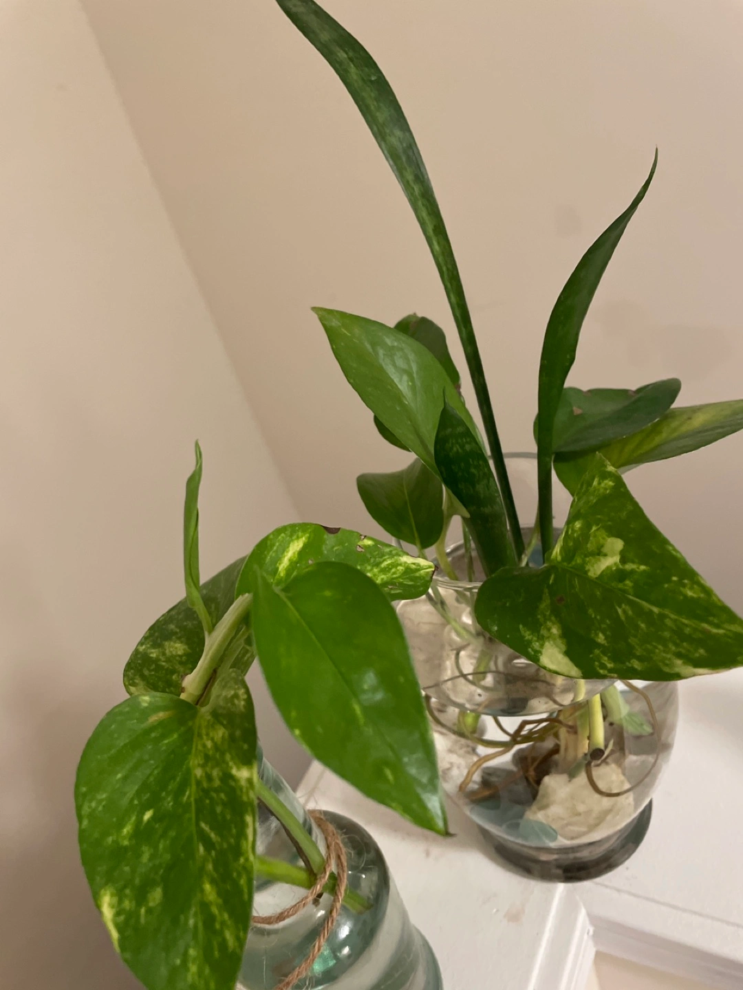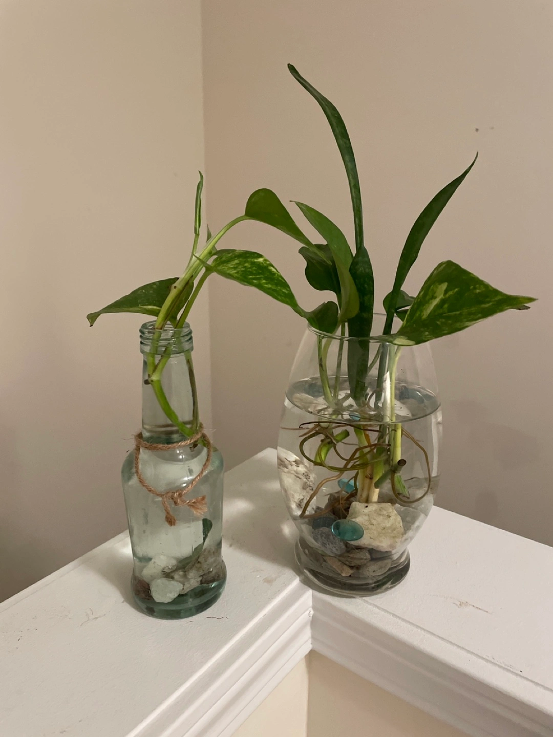Two healthy pothos/snake plants, one in a small bottle and one in a larger vase. Both are growing in water with small stones for stability. Plants appear to be thriving.