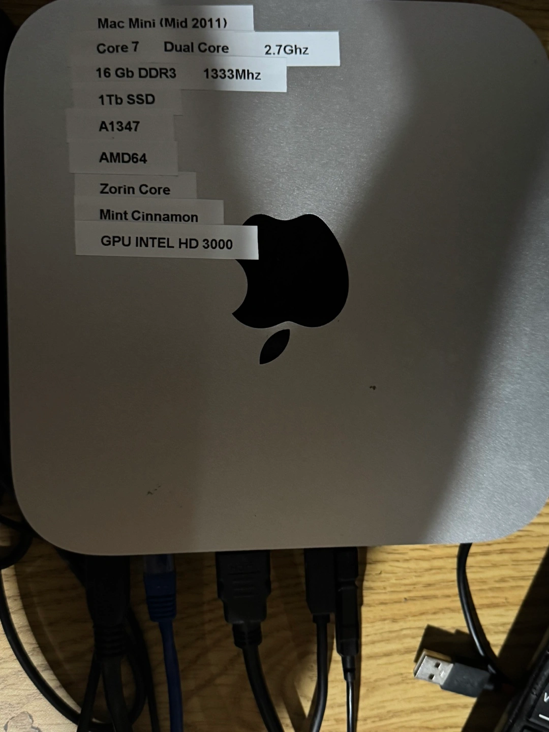 Mac Mini, Mid 2011 model. Features a 2.7 GHz Dual Core processor, 16 GB DDR3 RAM (1333MHz), and a 1 TB SSD. Includes Zorin Core and Mint Cinnamon operating systems. GPU is Intel HD 3000.