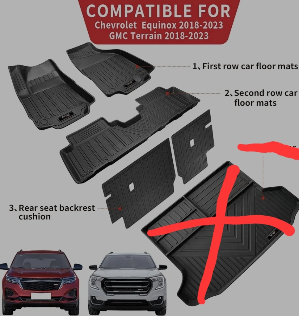 BNIB Brand New In Box 4 Piece Mat Set - Driver and Passenger Side - Rear Seat - 2 x Rear Seat Backrest Fits 2018 to 2024 Chevrolet Equinox / GMC Terrain 3D laser scanning is accurate and fully in line with the original car data Made of TPU Rubber Material Unique non-slip textured floor mat, soft, odorless, heat and cold resistant ***Please Check Out My Other Ads