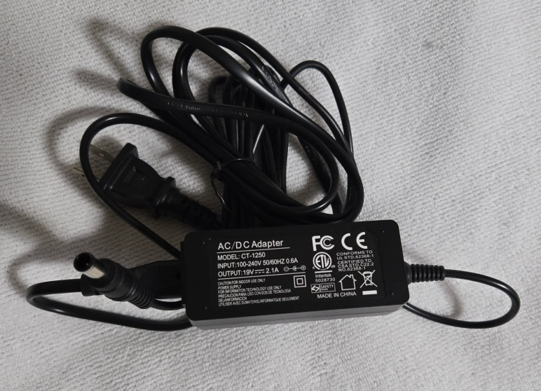 AC/DC adapter, Model CT-1250. Input: 100-240V 50/60Hz 0.6A. Output: 19V 2.1A. Power supply for information technology.
