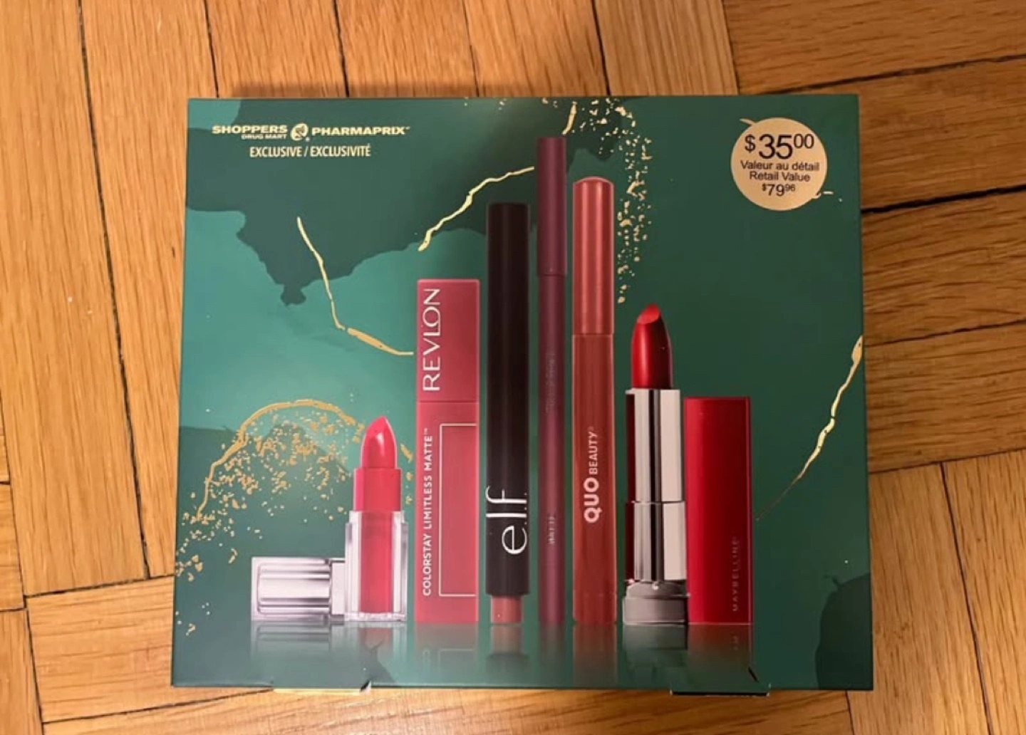 New lip product gift set. Includes Revlon, Elf, Quo Beauty, and Maybelline products. Various shades of lipstick and lip liner. Bought it for a Christmas gift but got them something else