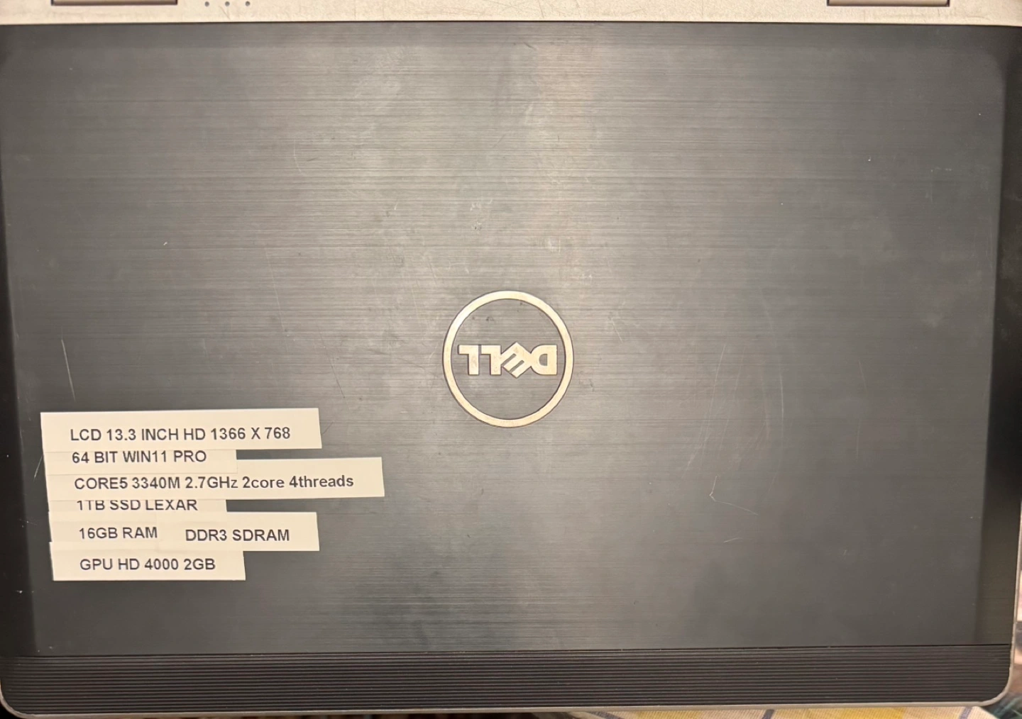 Used Dell Latitude E6330 laptop. Features a 13.3-inch HD display, Core i5 processor, 1TB Lexar SSD, 16GB RAM and integrated Intel HD graphics. Windows 11 Pro installed. Some cosmetic wear. Not sure if battery good or not. Works fine plugged in.