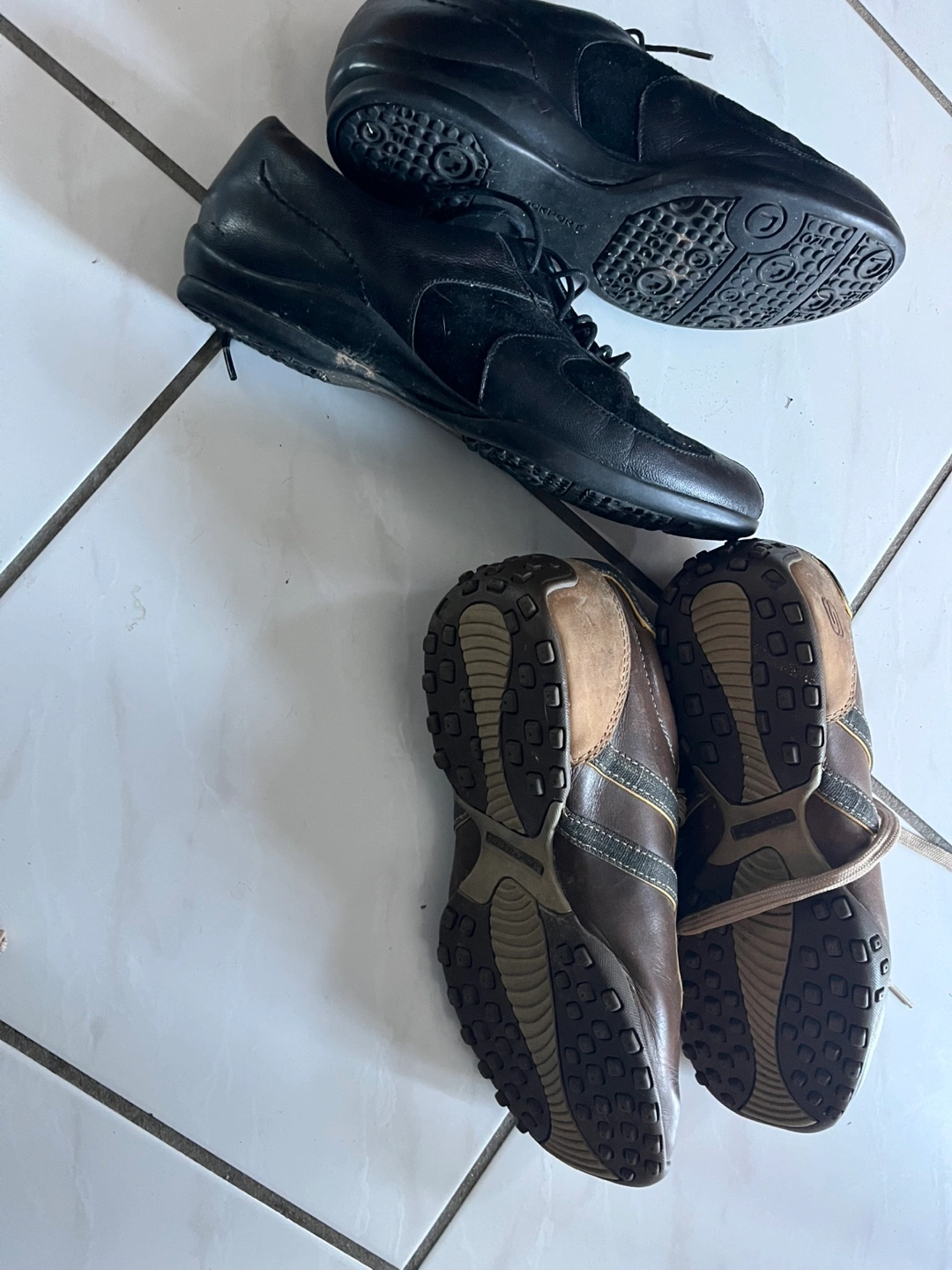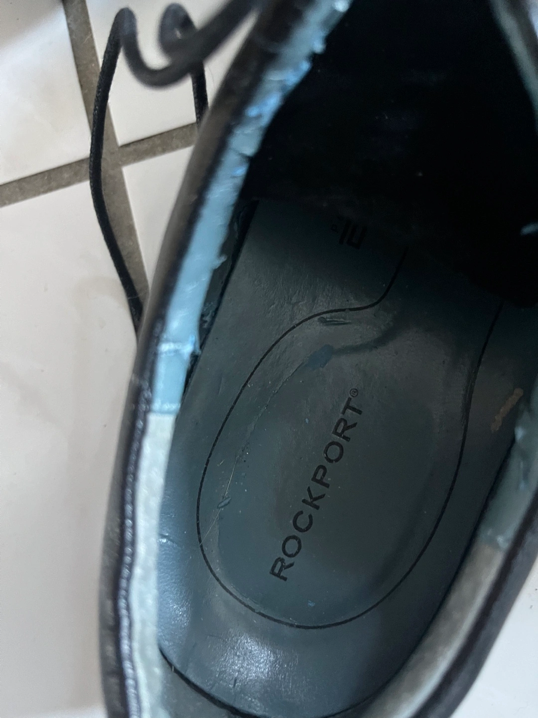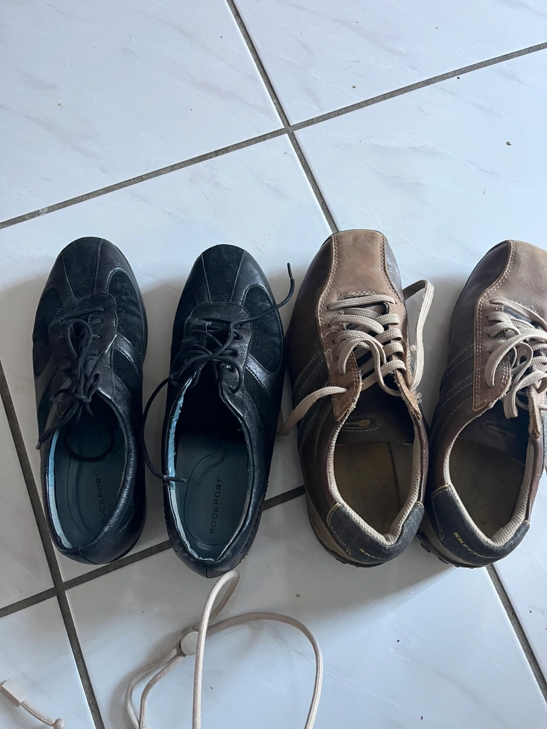 Pair of black Rockport shoes, lace-up style. Another pair of brown leather shoes, also lace-up. Pre-owned. 6 each $10 for both
