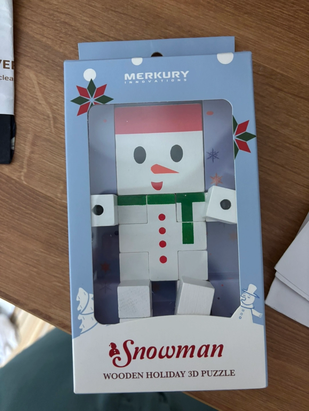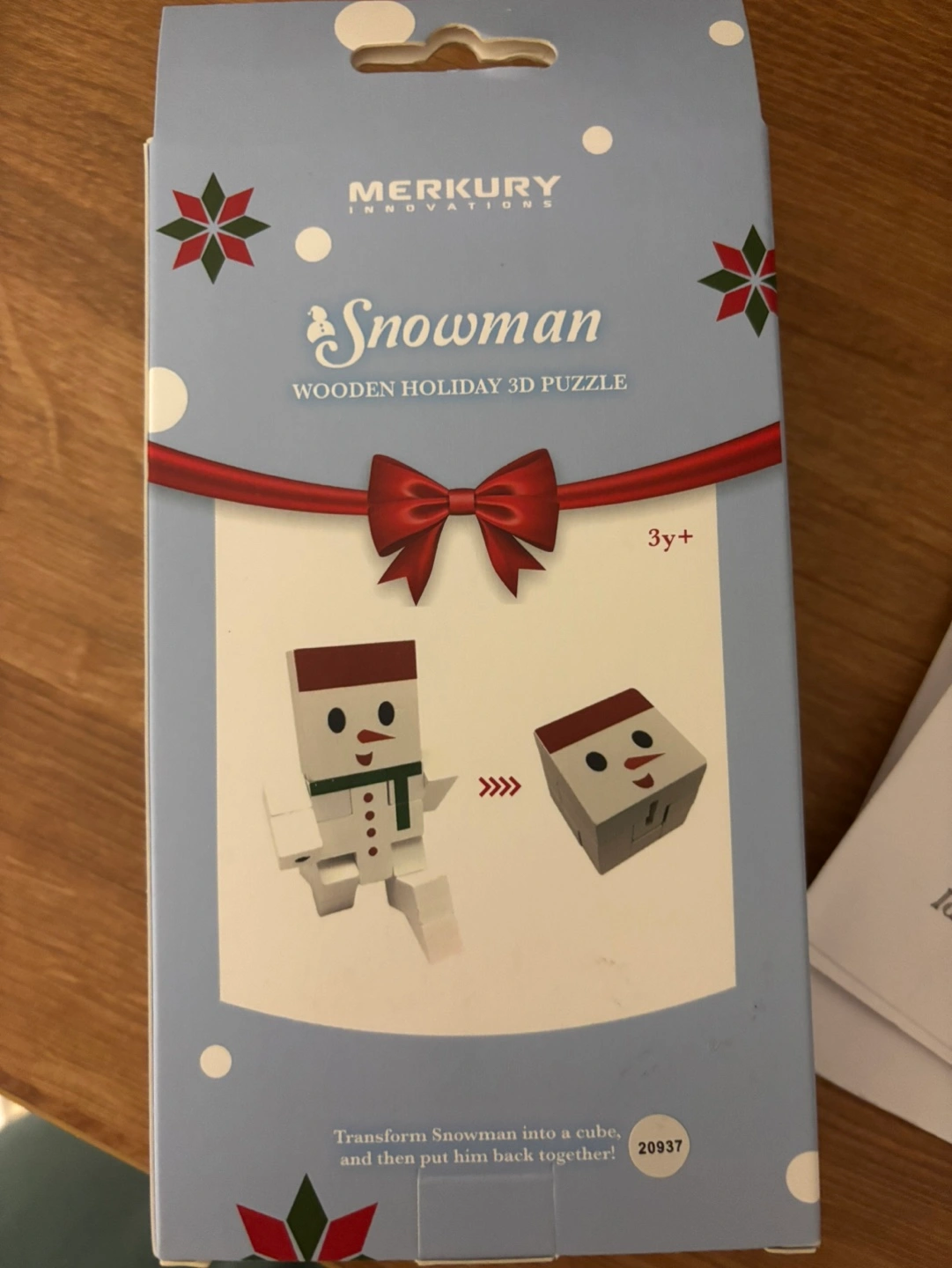 Free with purchase Fun holiday-themed puzzle. Wooden blocks assemble into a snowman then transforms into a cube. Ages 3+