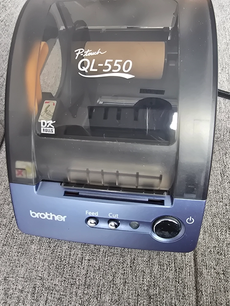 Brother P-touch QL-550 label printer. Used condition. Includes power cord. Features feed and cut buttons. Works perfectly.