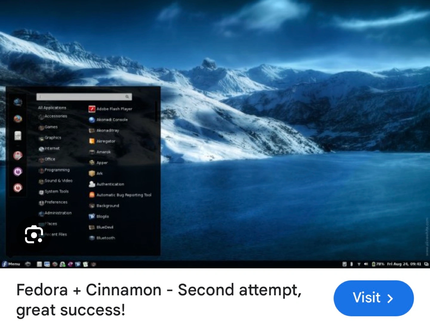 Digital image featuring a Fedora Linux desktop environment with Cinnamon. Shows a snowy mountain landscape as the background image. Includes a screenshot of the application menu.