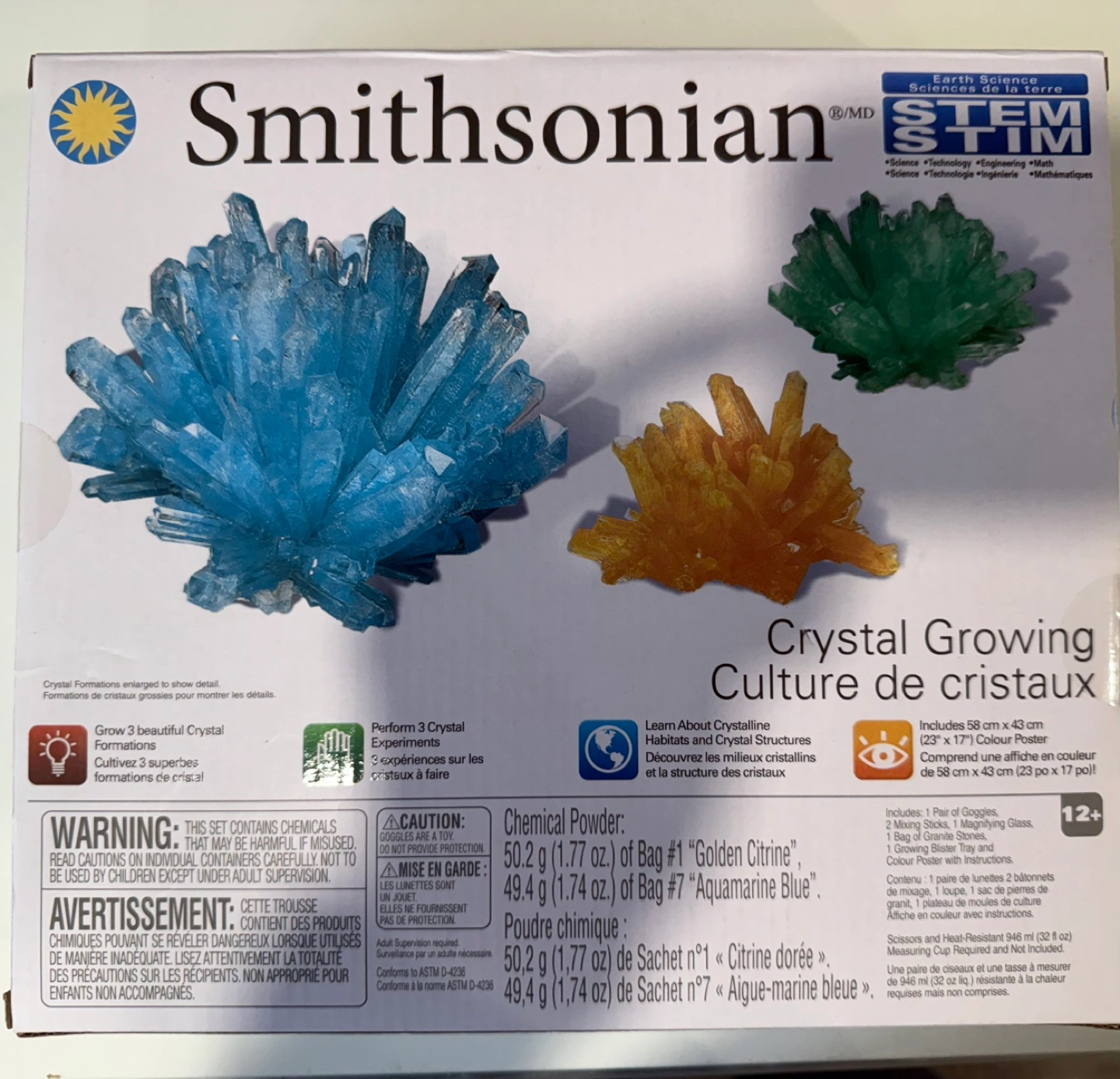 Pickup near The Westmall & Rathburn Grow three beautiful crystal formations. Perform three crystal experiments. Learn about crystalline habitats and structures. Includes 58 x 58 x 43 cm colour poster, 1 colour powder bag, tray, 2 stirring sticks, and measuring cup. Ages 12+