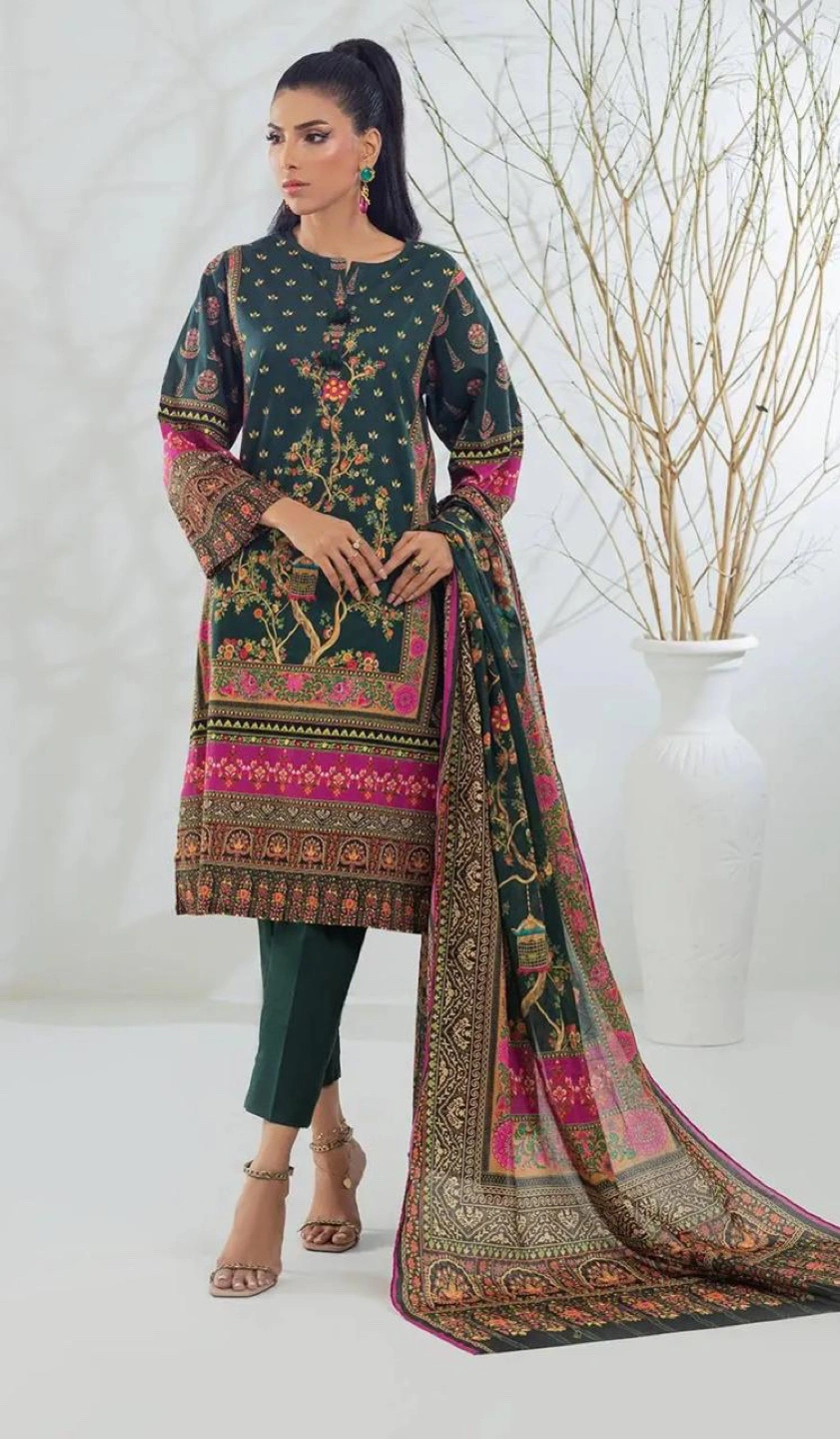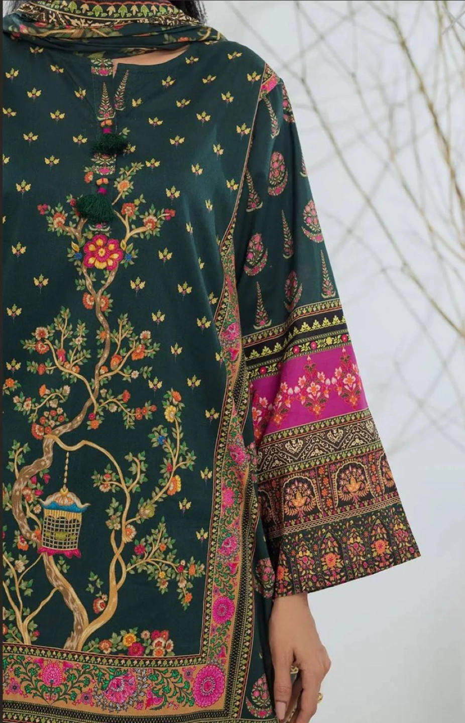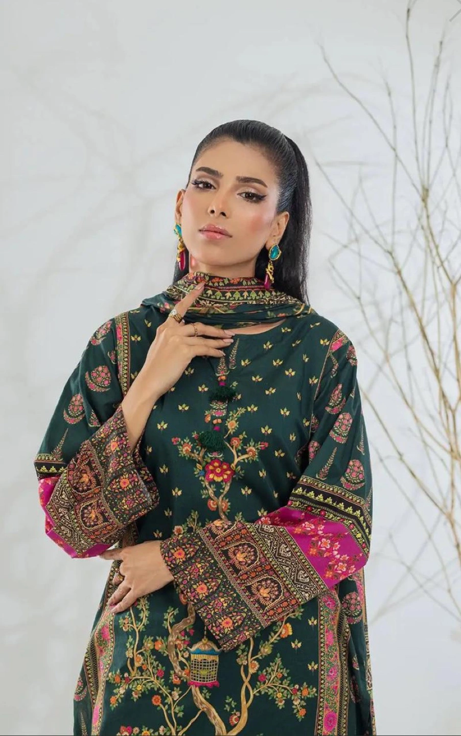 Beautiful 3-piece winter suit. Features a dark teal base colour with colourful floral embroidery. Includes a matching dupatta and trousers. Perfect for special occasions.