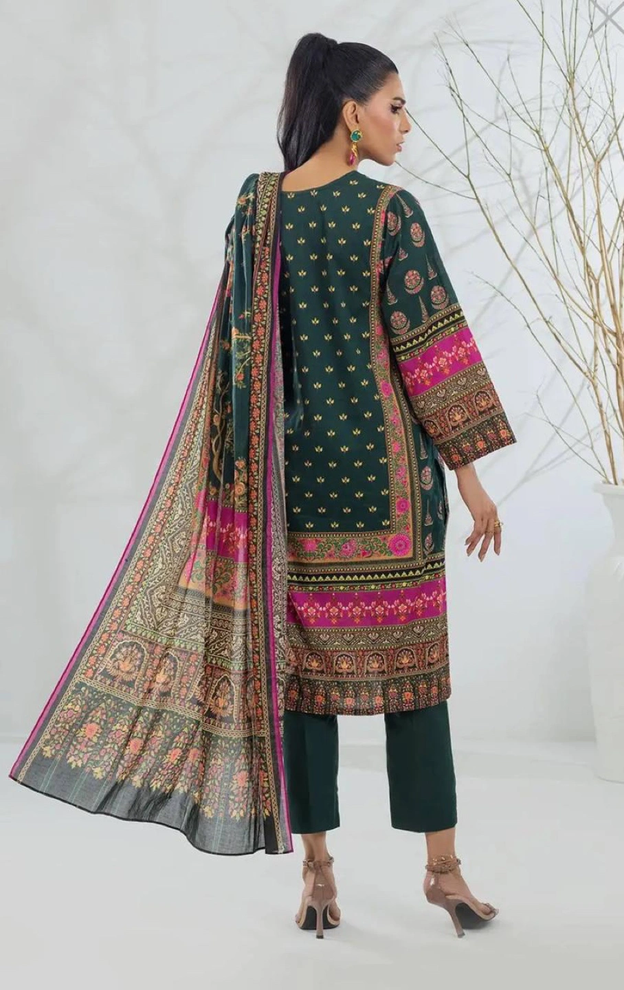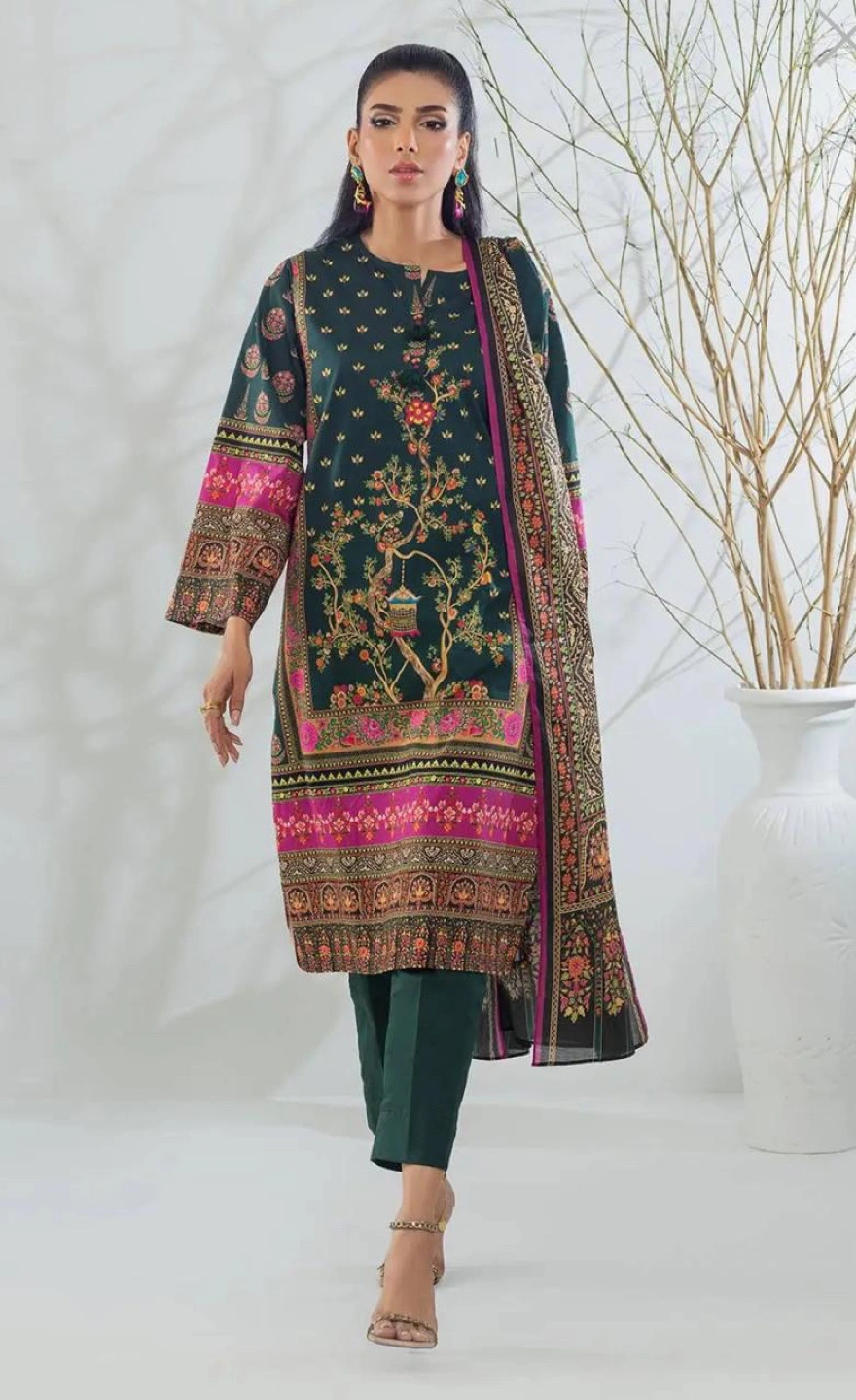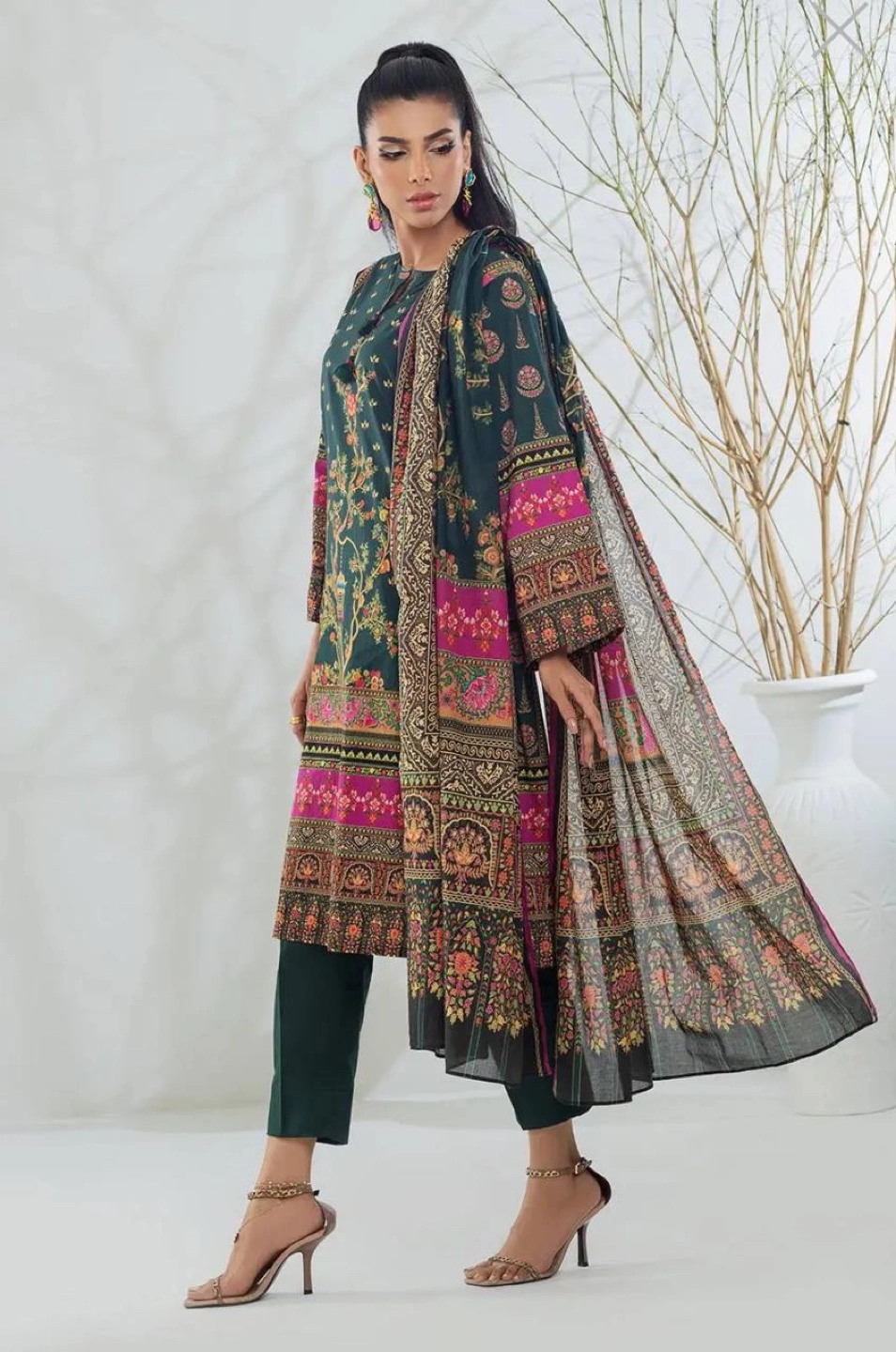 Beautiful 3-piece winter suit. Features a dark teal base colour with colourful floral embroidery. Includes a matching dupatta and trousers. Perfect for special occasions.