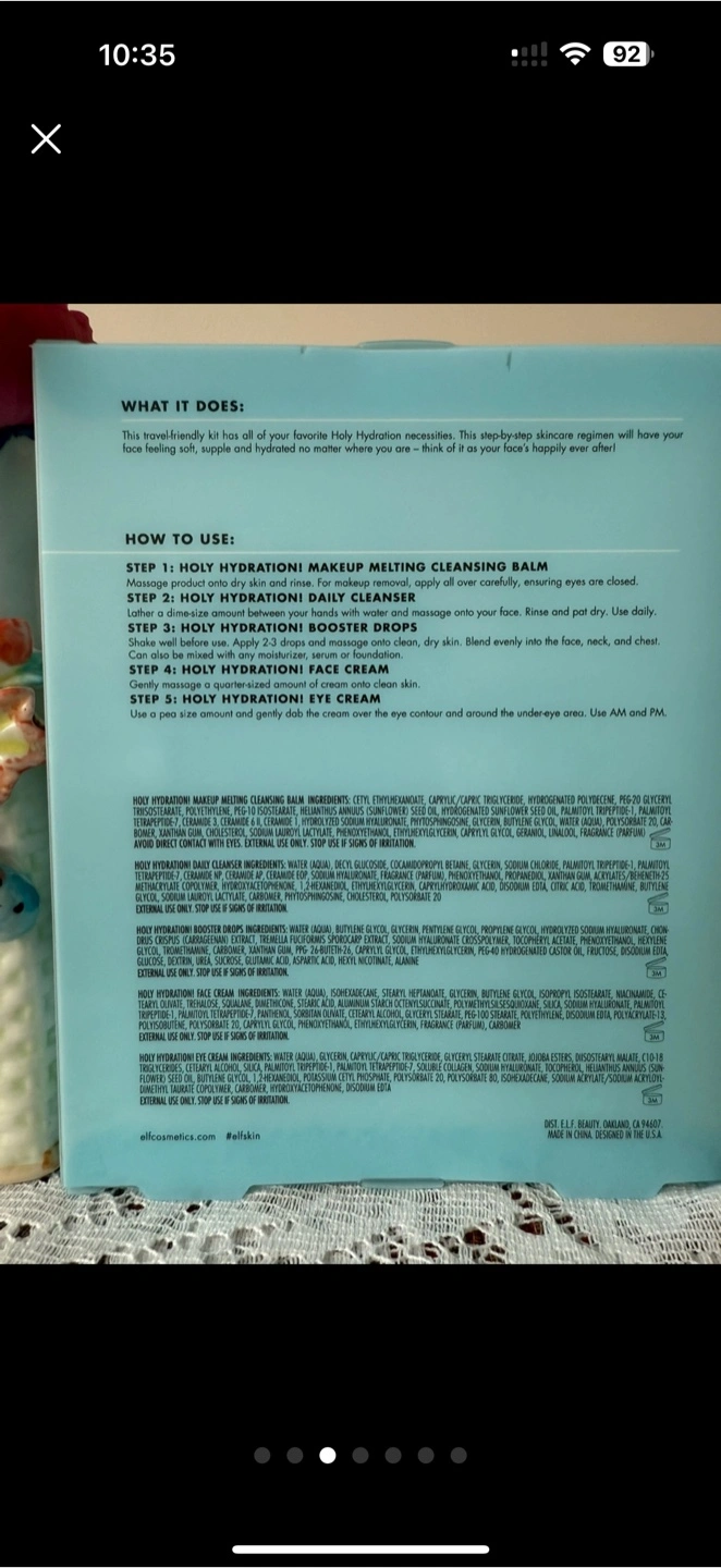 MEETING LOCATION: ✅ Scarborough Town Centre Mall 💰 Cash payment only ⭐️ Please check my listing for more skin care products! e.l. f. Holy Hydration Step-by-Step Skincare Mini Kit Includes: **MAKEUP MELTING CLEANSING BALM **DAILY CLEANSER **BOOSTER DROPS Can also be mixed with any moisturizer, serum or foundation. **FACE CREAM **EYE CREAM ✅ Hero Ingredients: HYALURONIC ACID PEPTIDES ***Suitable for dry, oily, or combination skin CONDITION: New, in original sealed Perfect for travel or trying out the full Holy Hydration line before buying full-size. Because everyone deserves a little hydration especially when flying! ✅ All products are enriched with hyaluronic acid, great for dry, oily, and combination skin types. * Makeup Melting Cleansing Balm (0.45 oz) * Daily Cleanser (1.01 oz) * Booster Drops (0.14 oz) * Face Cream (0.529 oz) * Eye Cream (0.23 oz) ‼️AMAZON PRICE: Regular: $33.50 before tax!!! https://a.co/d/bJ4OiPj