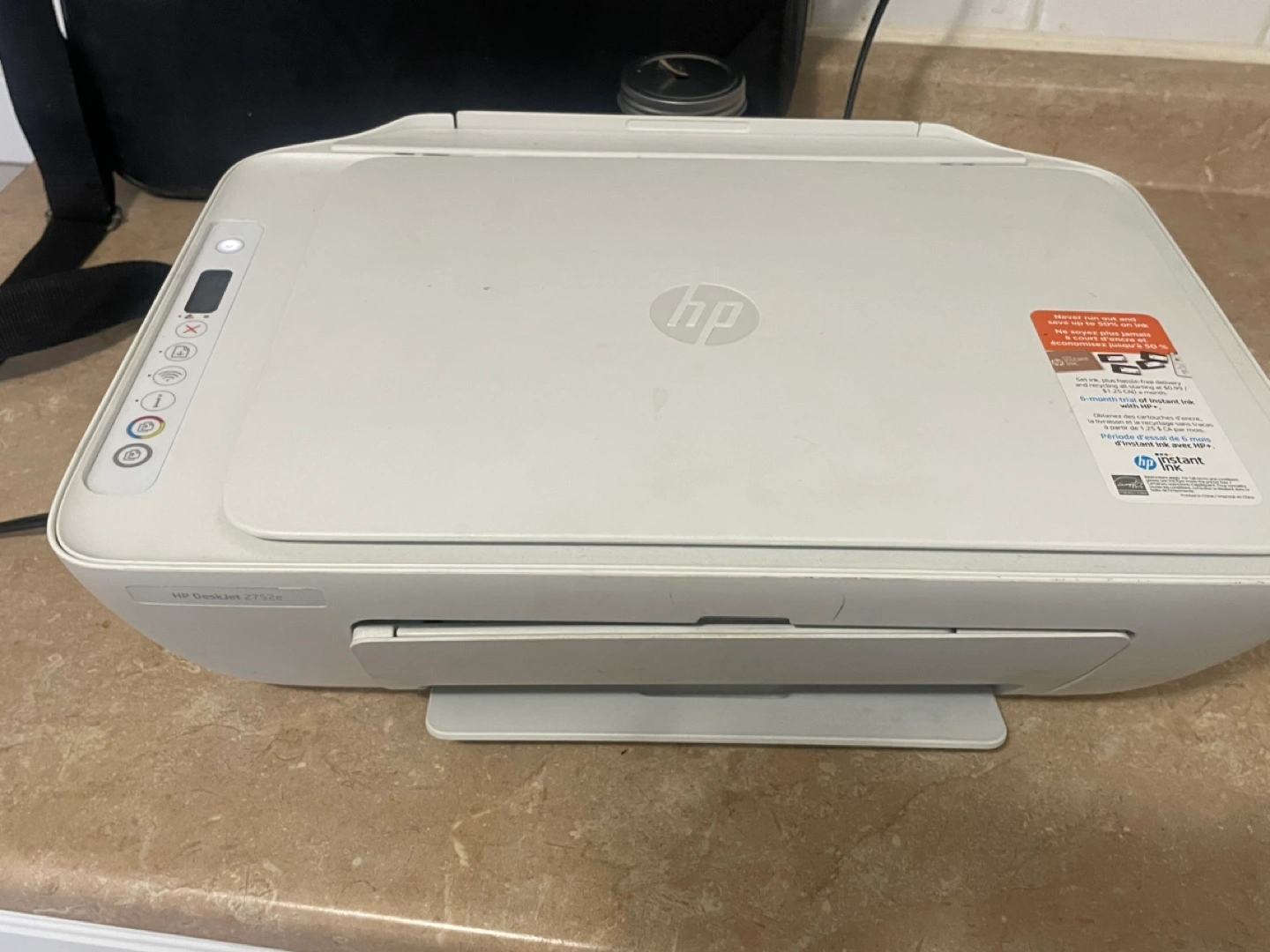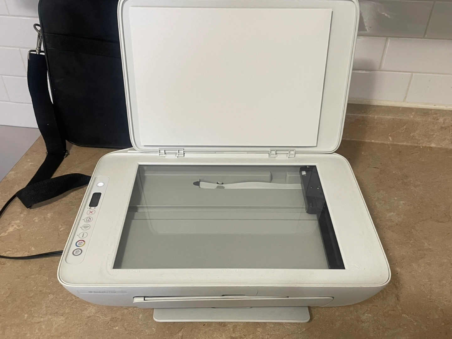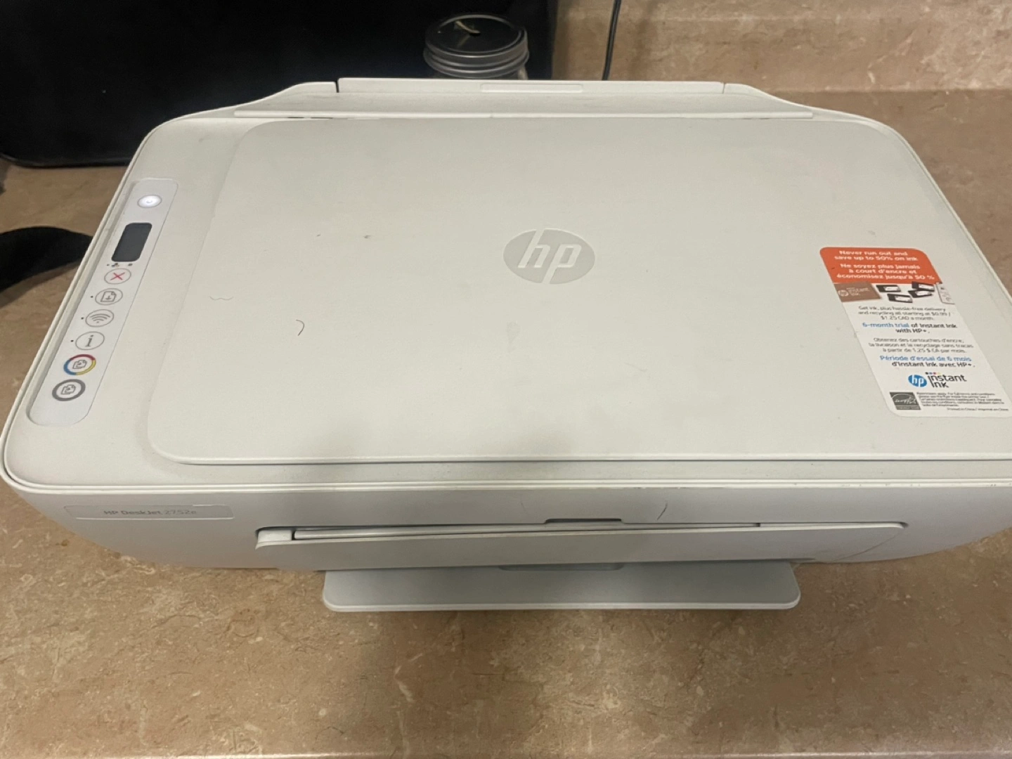 Compact all-in-one HP Deskjet printer. Prints, scans, and copies. White colour. Good for home use.