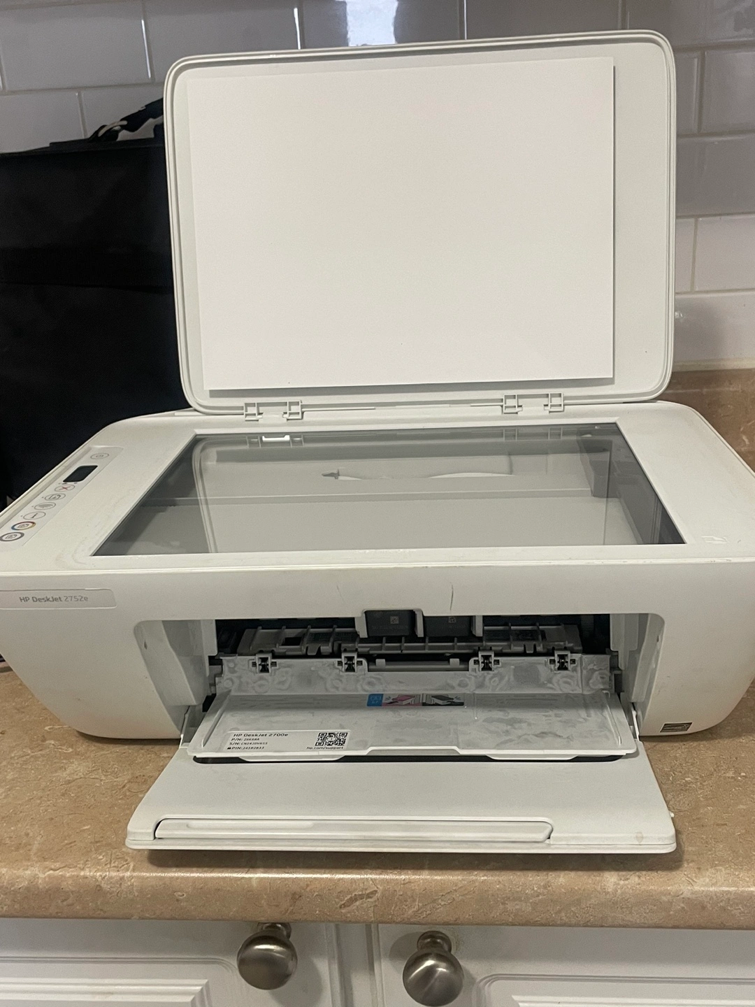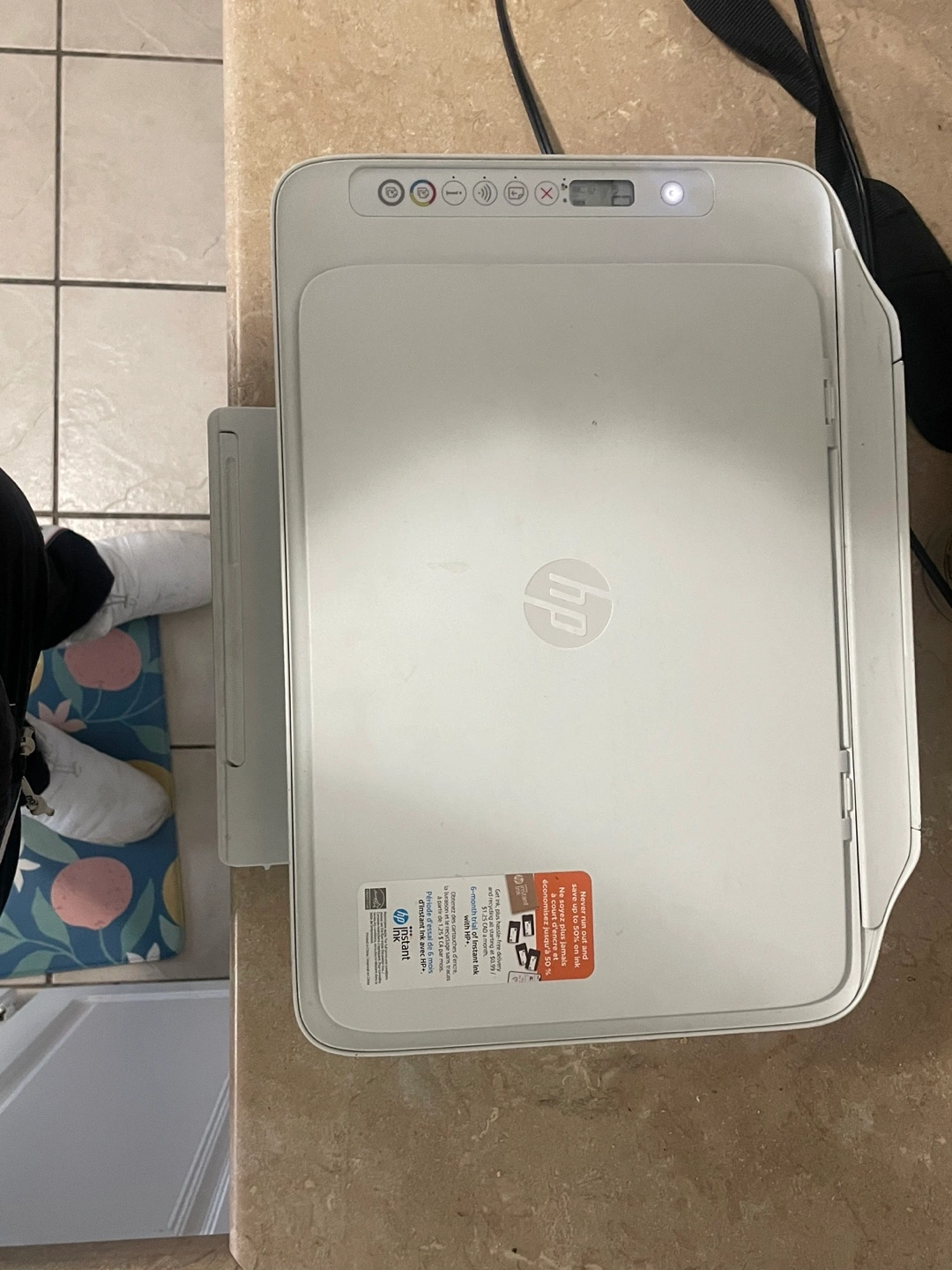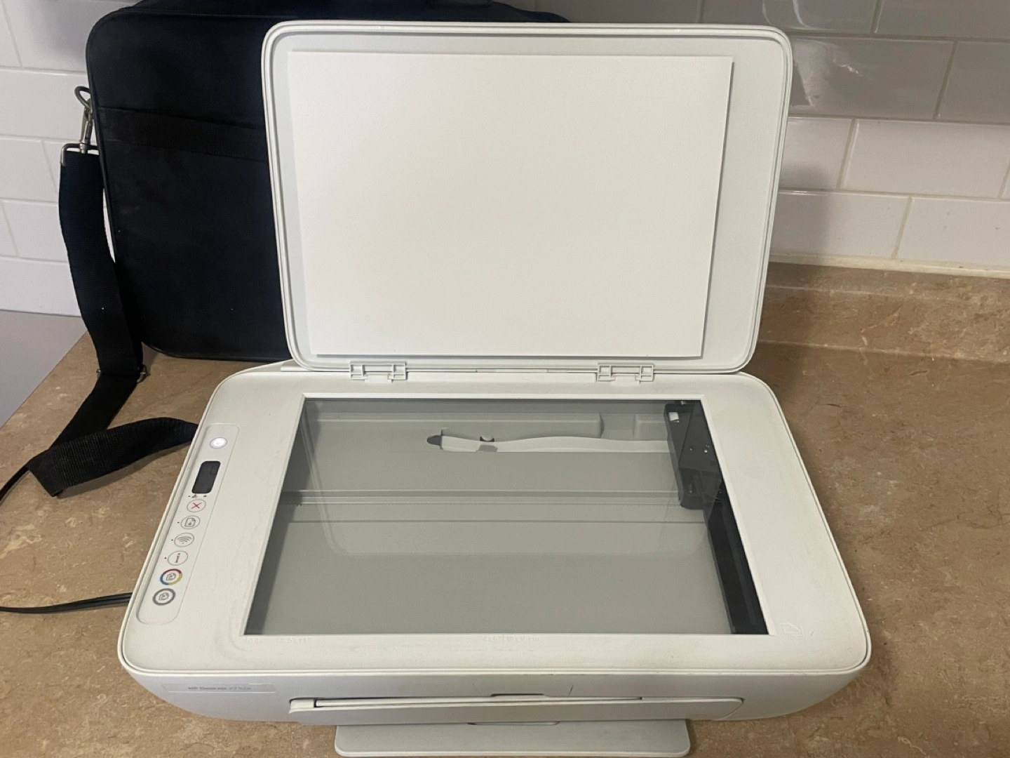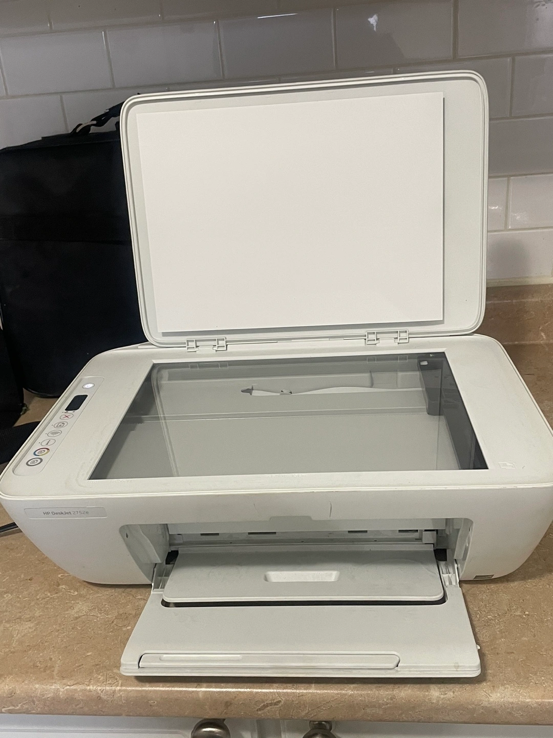 Compact all-in-one HP Deskjet printer. Prints, scans, and copies. White colour. Good for home use.