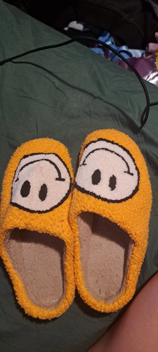 Pair of yellow fuzzy slippers. Features a smiley face design. Open-toe style. Cozy and comfortable. never warn they were put in a box because I moved