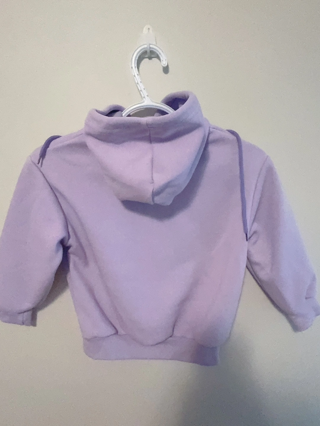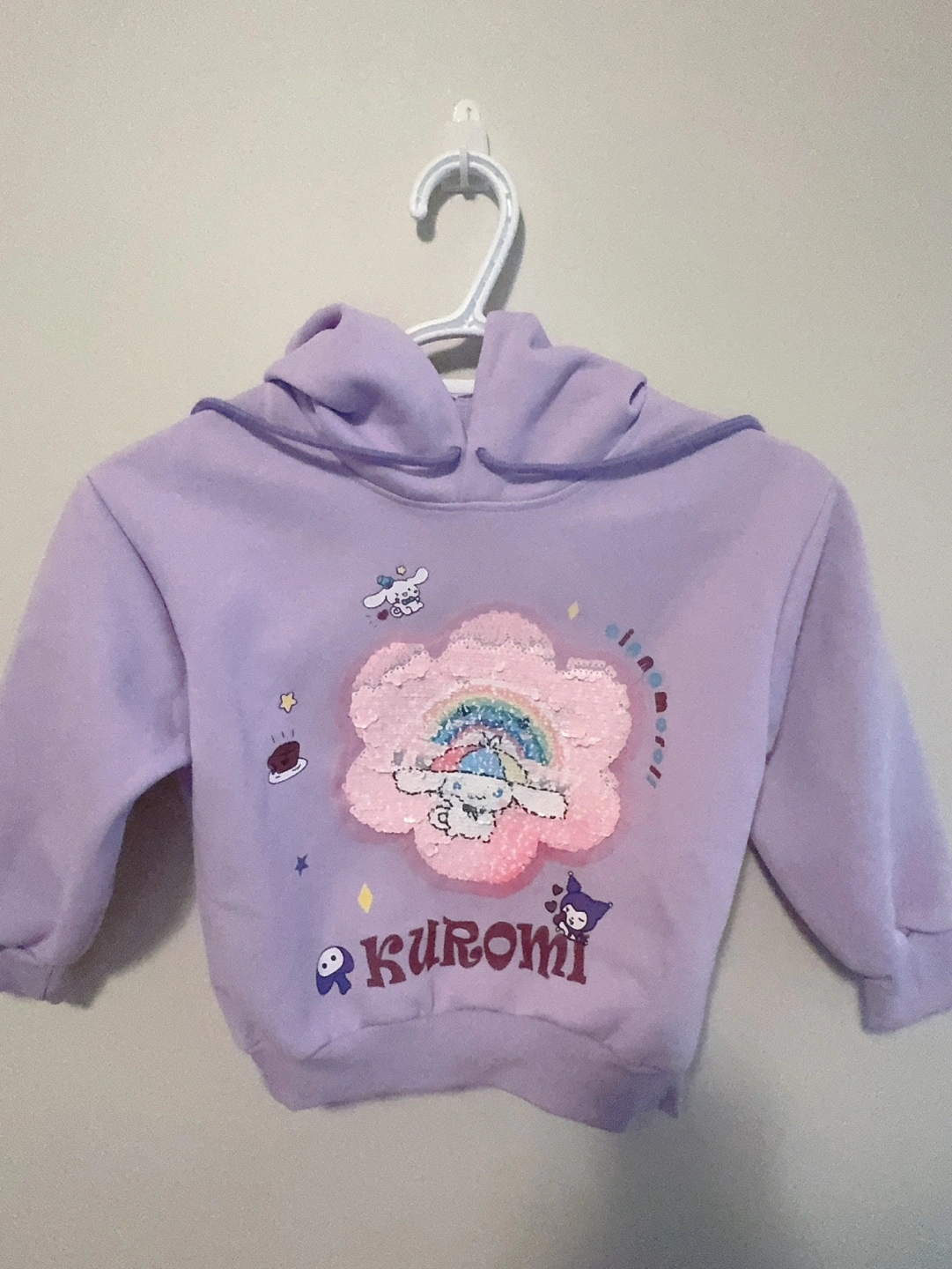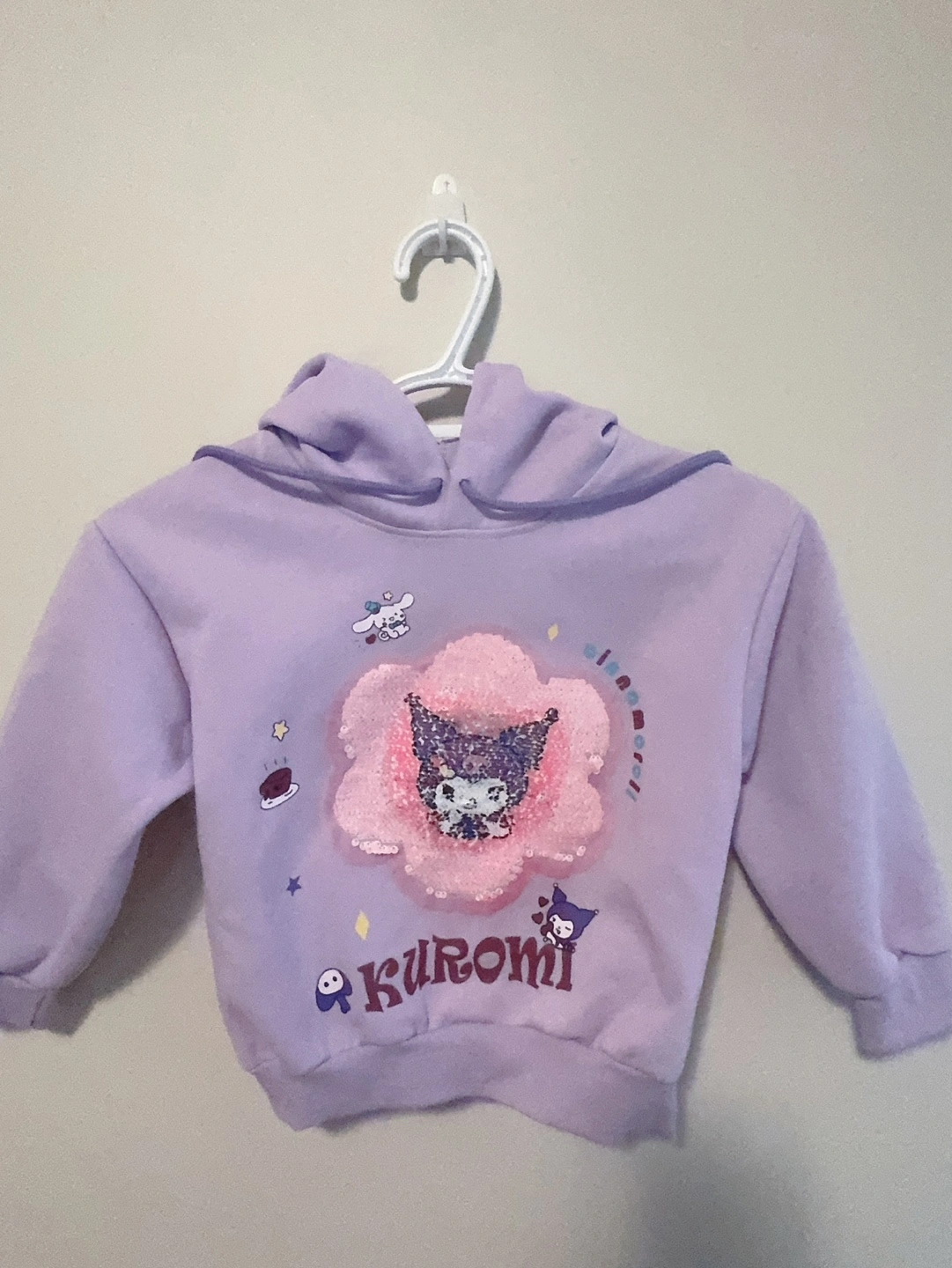 Adorable lavender children's hoodie. Features Kuromi and friends design. Sequin details. Long sleeves, drawstring hood.