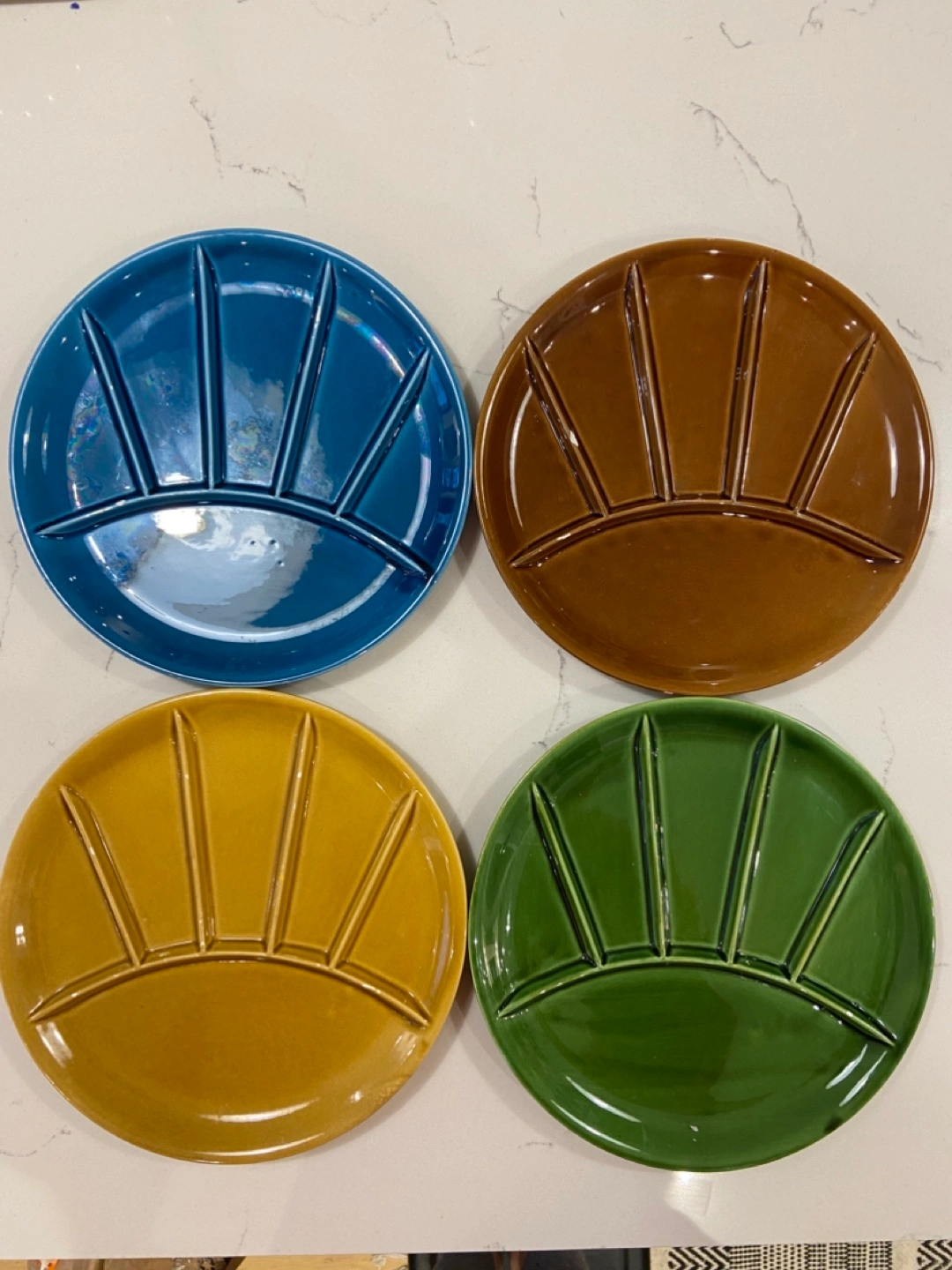Four colourful divided plates. Made in Japan. Great for appetizers or individual servings. Mid-century modern style. Tiny chipping but such and incredible and gorgeous set. $20 for the set Broadview and Danforth