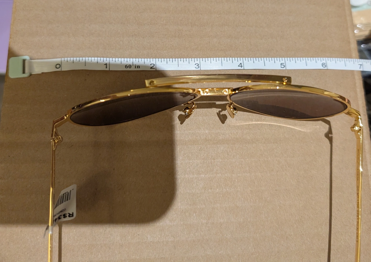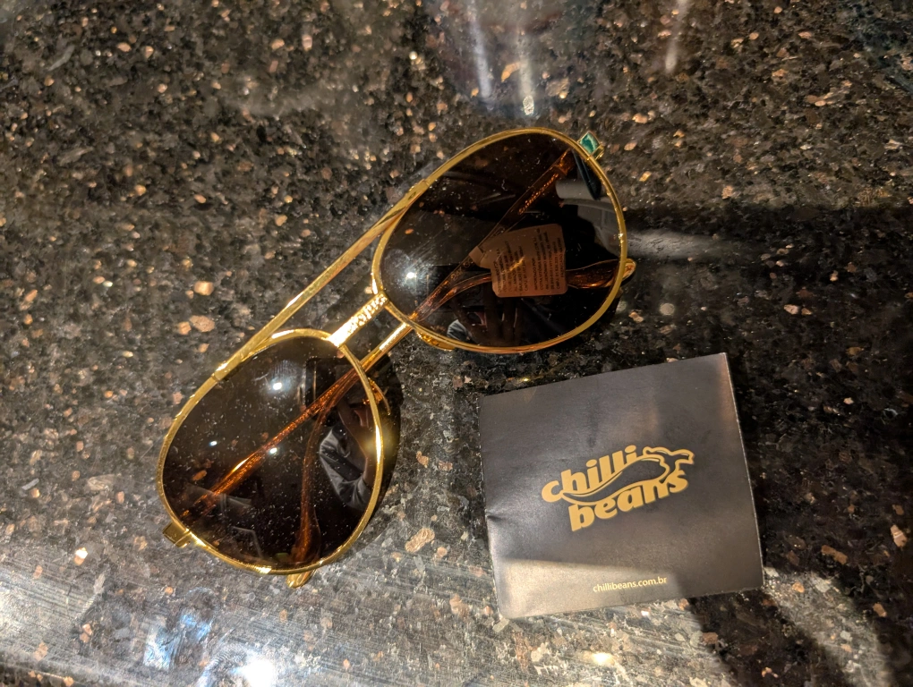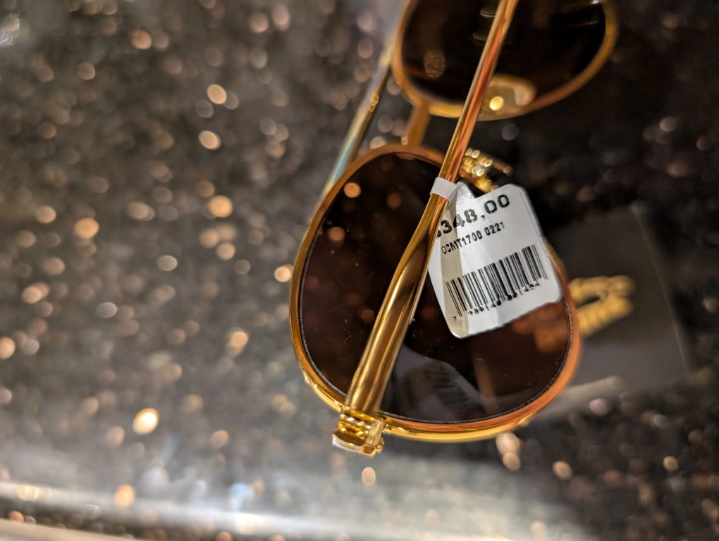 Gold-framed aviator sunglasses. Brown lenses. New, excellent condition. Address: Unionville Porch pick-up only.