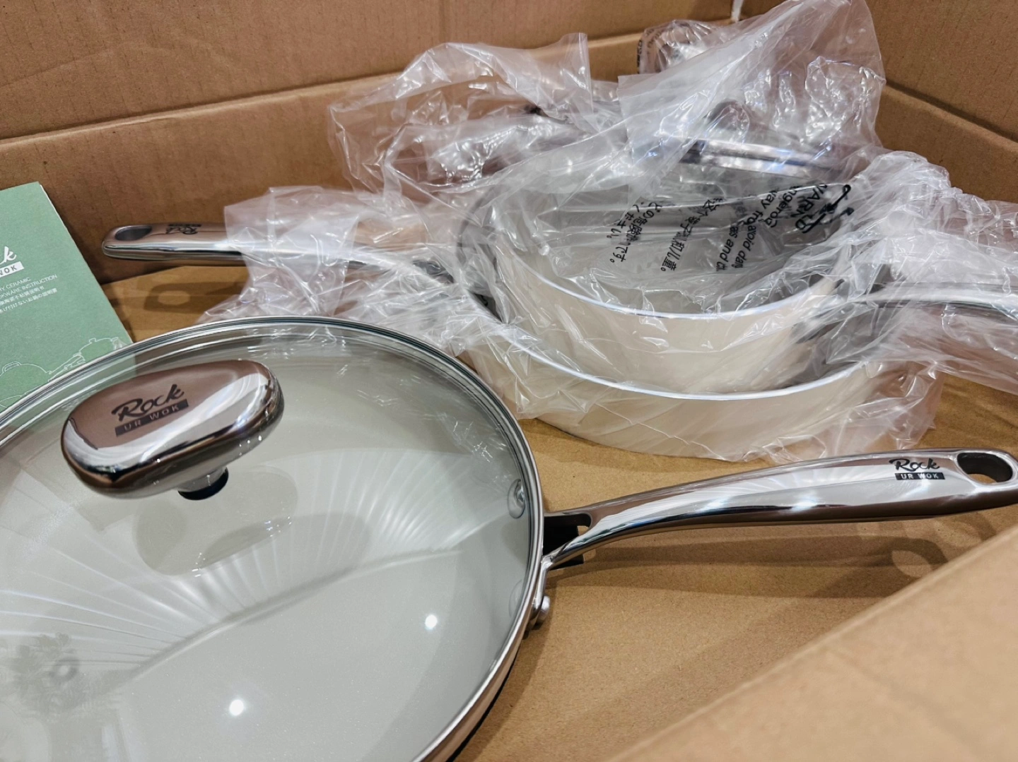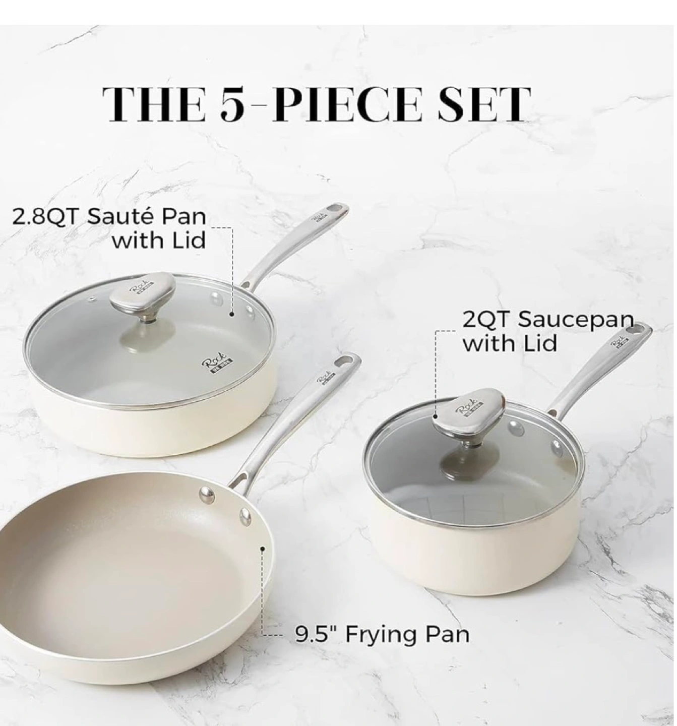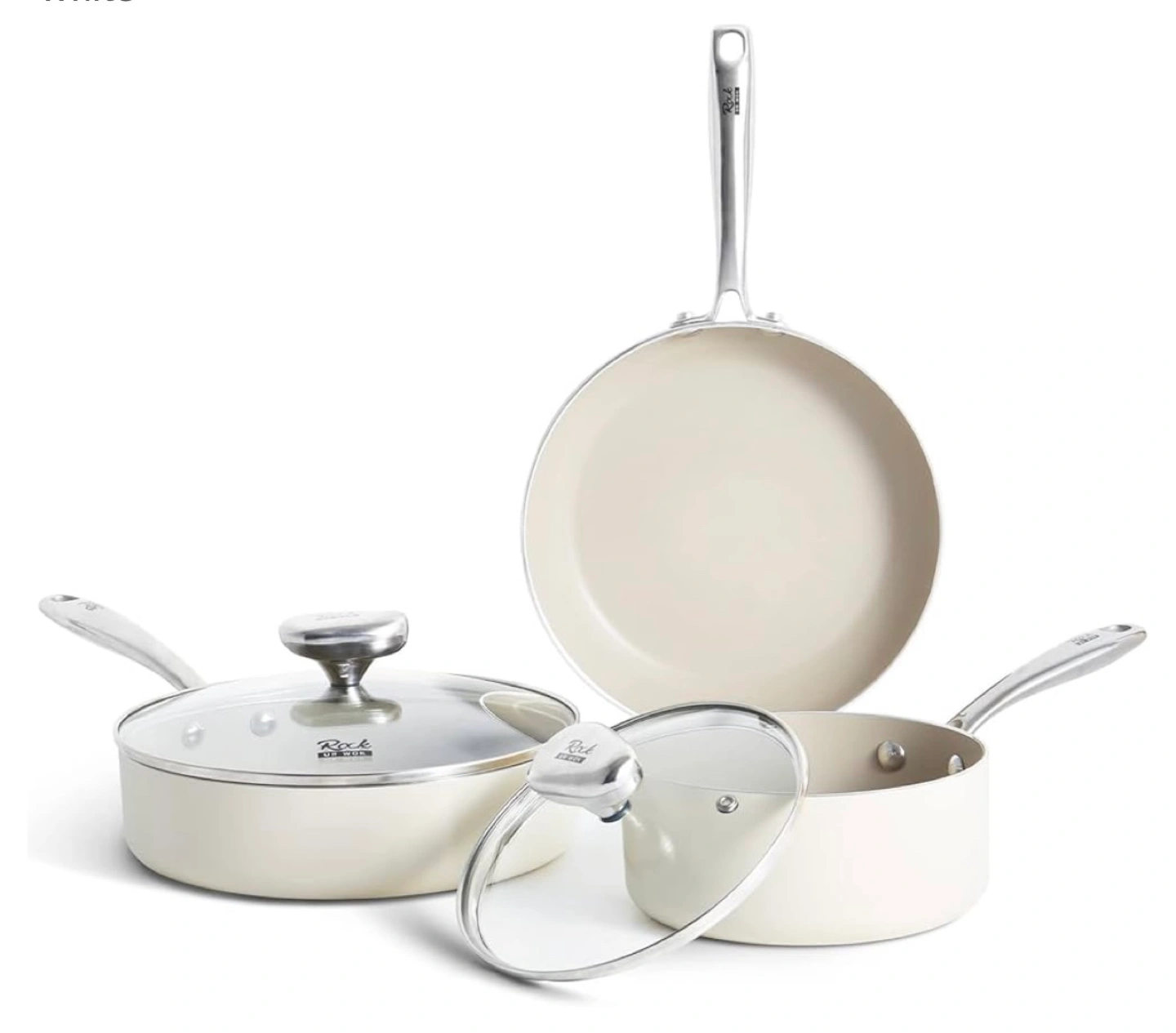 New Rock Cookware 3-piece ceramic cookware set. Includes one frying pan, one saucepan with lid, and one larger pot with lid. Oven safe up to 842°F. Cream coloured ceramic coating. Stainless steel handles.