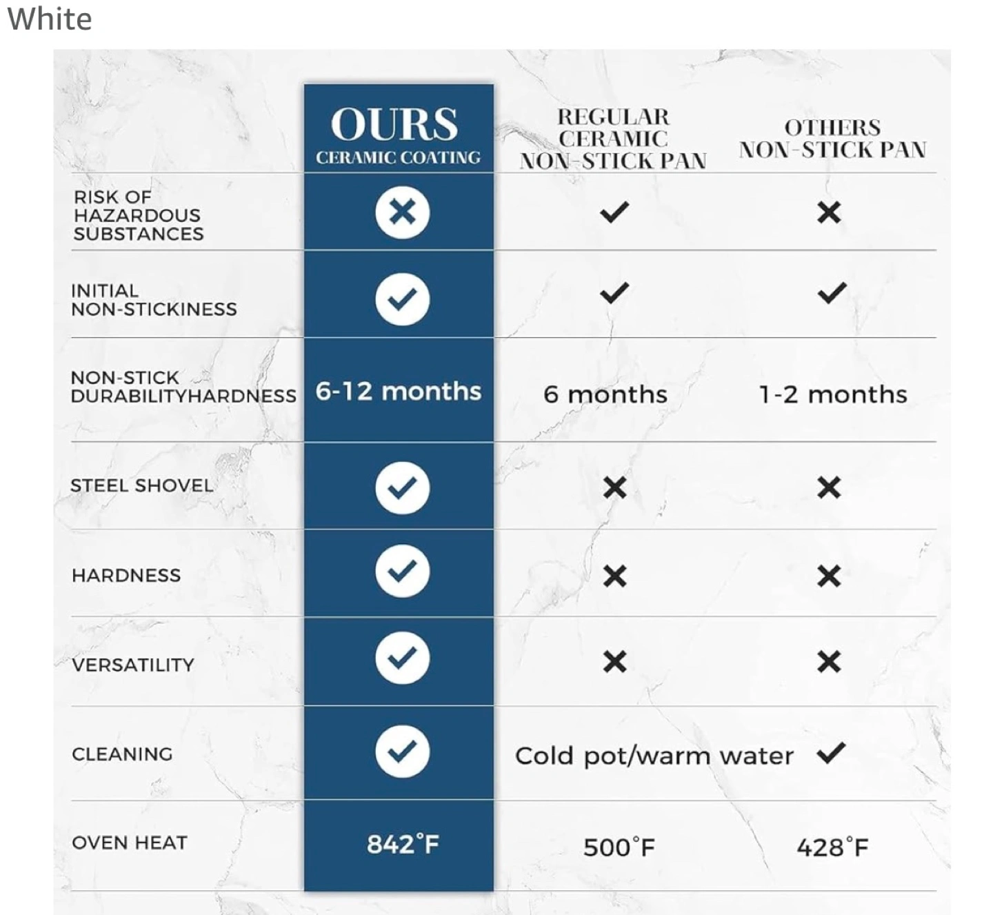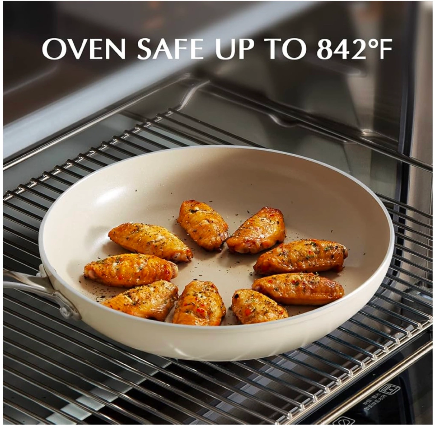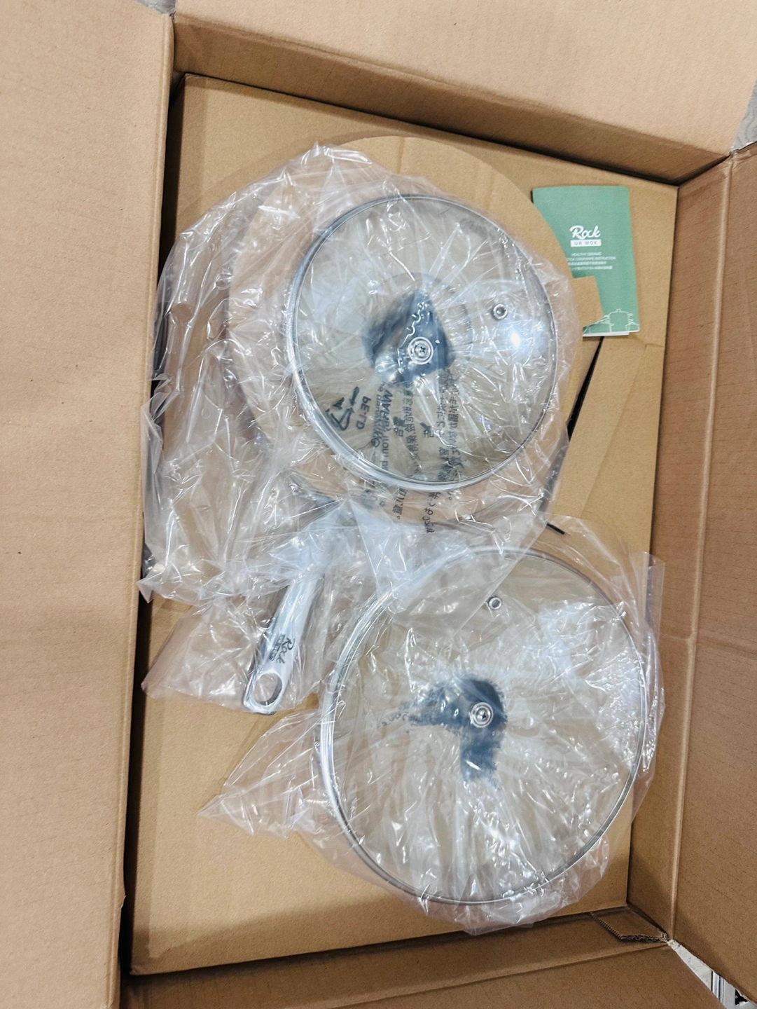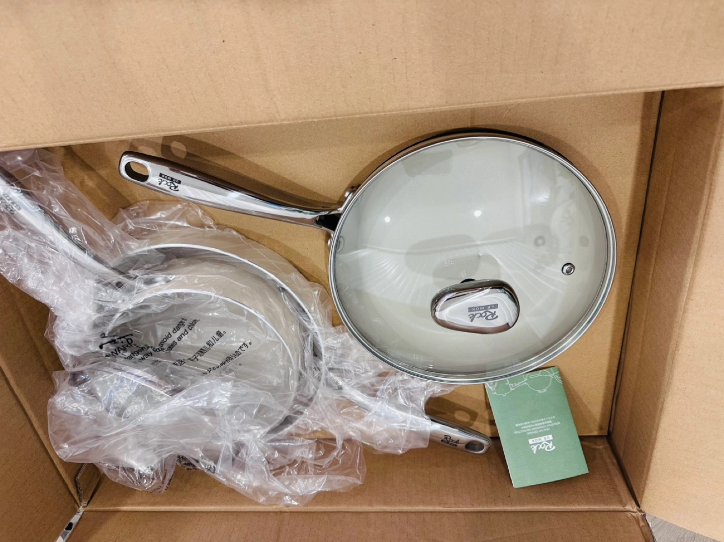 New Rock Cookware 3-piece ceramic cookware set. Includes one frying pan, one saucepan with lid, and one larger pot with lid. Oven safe up to 842°F. Cream coloured ceramic coating. Stainless steel handles.