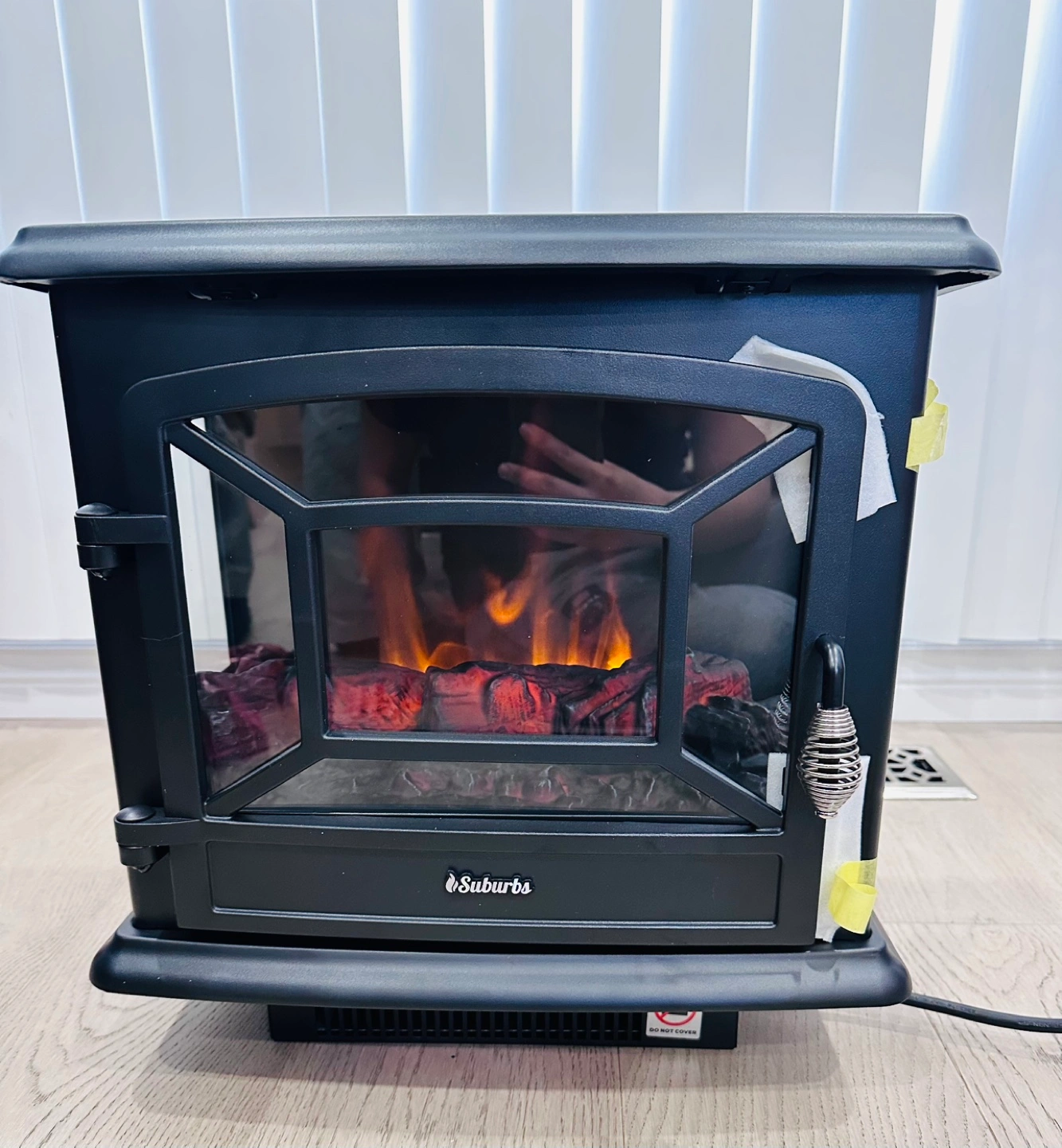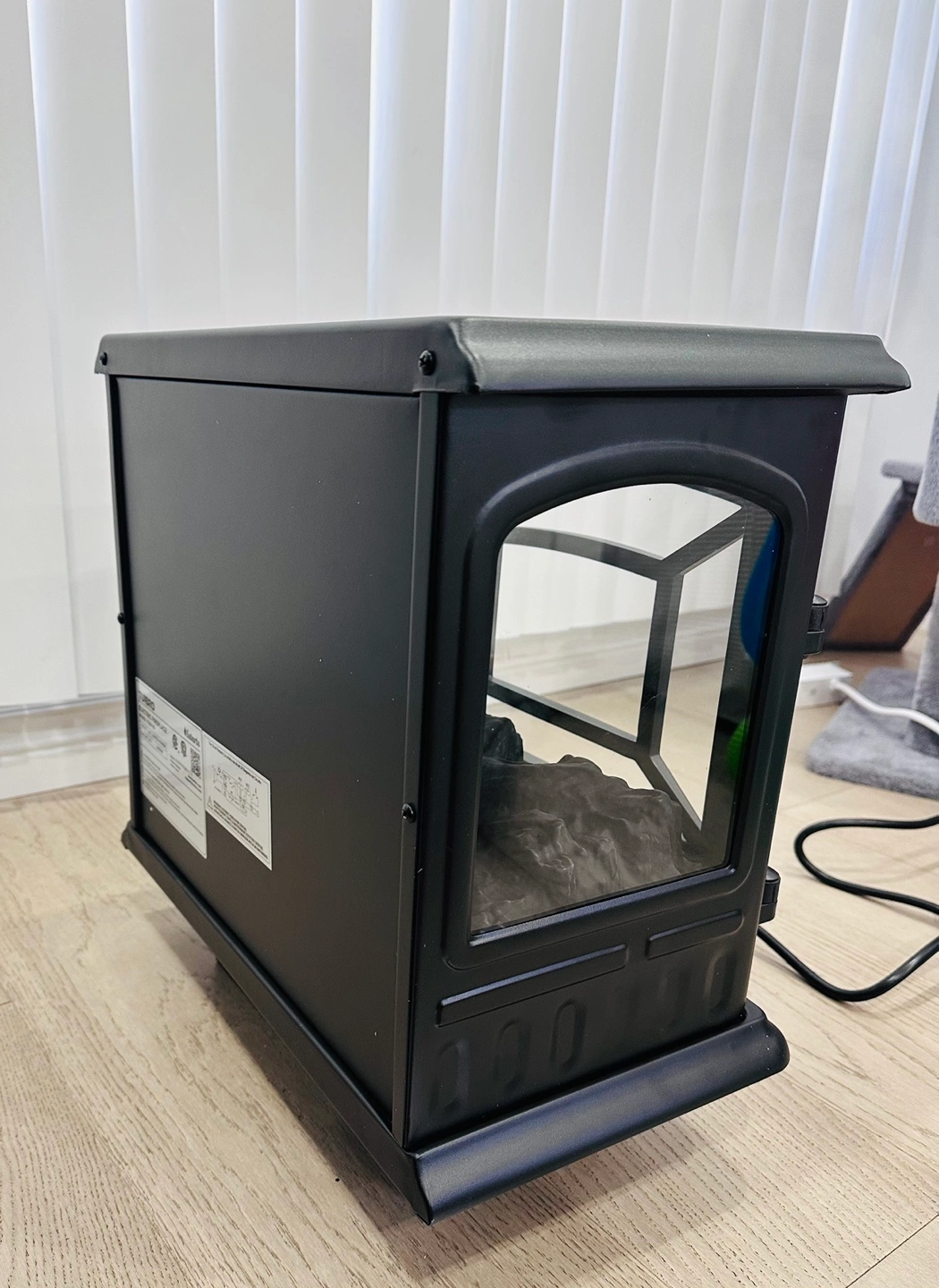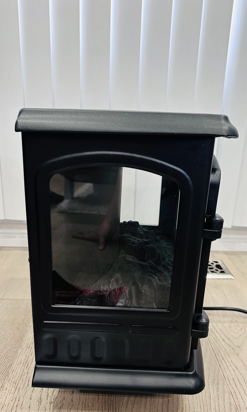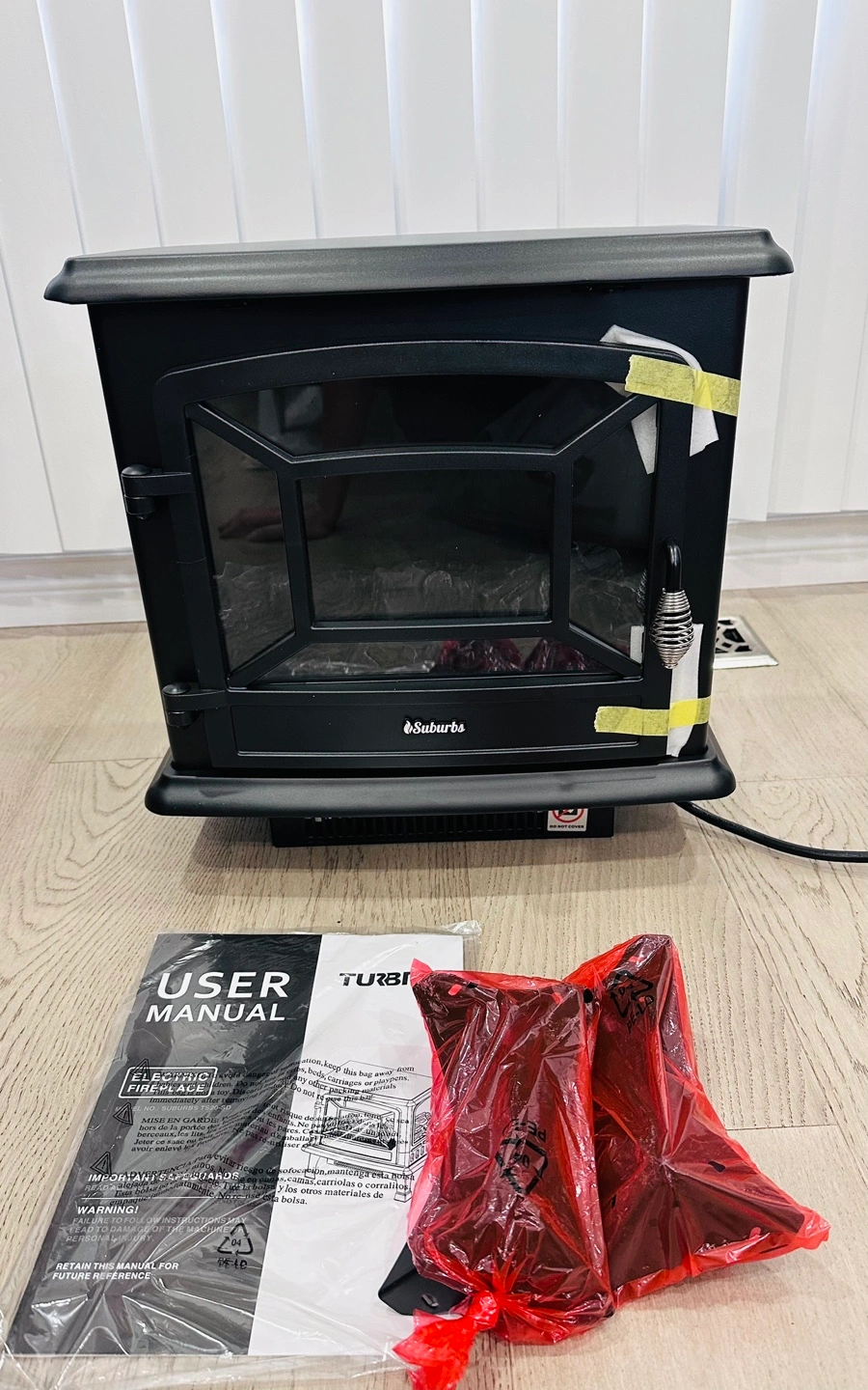 Black electric fireplace. Compact size, ideal for small spaces. Includes user manual and extra feet. Features realistic flame effect. Excellent condition.